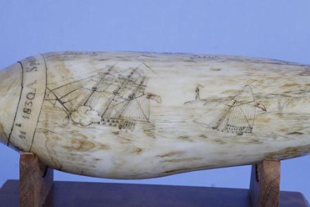 InformationDated in a band that encircles the tip " Sperm Whale Tooth June 1830", similarly to Frederick Myrick's signature & Date on the famed "Susan's Teeth". The circumference of the tooth is covered with four charmingly rendered vignettes. Two depict whaling scenes, one off a hilly coast with two whaleboats in pursuit of a pod of whales and the whaleship cutting in, and the other with a whaleship and three whaleboats around an expired sperm whale. Another scene depicts a stately home on a cliff overlooking the sea, with two vessels and a hilly coastline in the distance, and the fourth shows a gunship firing its cannons, with a smaller vessel and a lighthouse atop steep cliffs off the starboard side. Both vessels are flying red flags. (SC1337)