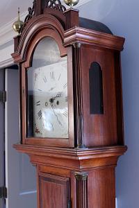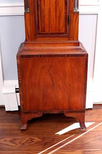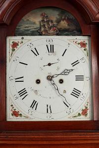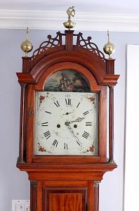 InformationAmerican federal inlaid mahogany tall clock signed on the dial Simon Willard. The case bonnet with oipen fretwork flanked by and centering three fluted retangular plinths, the outside plinths surmounted by brass ball finial with spire. The center final urn-shaped and topped by a spreadwing eagle holding an olive leaf in its beak; above an arched moulding: the arched glazed door below opening to an arched white painted metal dial, the arch with a rocking ship with a painted American flag against a harnor scene with a house in the backround, the face below with guilt edged spandrels enclosing pink flowersand green foliage, the dial painted with Roman and Arabis numerals and seconds indicator; the faded inscription states Warranted for B Gary above SIMON WILLARD, all flanked by brass stop- fluted colonettes with brass capitals, the sides of the bonnet with arched sidelights, the case with deep cove moulding above a molded door with cheeckered and loightwood banding below, the box base below with checkered and lightwood banding on a shaped skirt on slightly flared tall french feet. The rocking ship movement with the american flag was an expensive option that would have been specialy ordered by the buyer of the clock. Ony a small percentage of willard clocks were made with this desirable option.