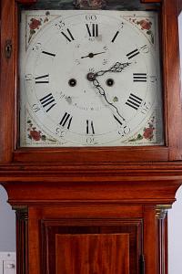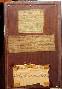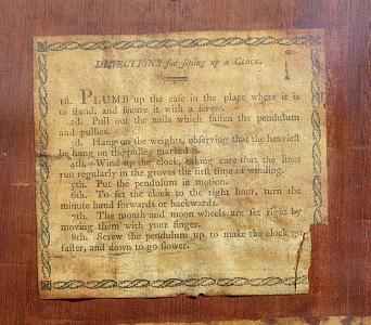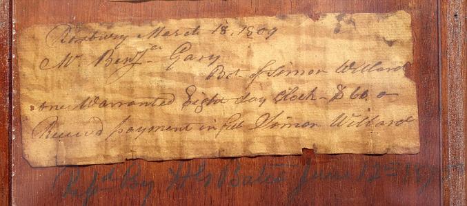 Three labels and a pencil inscrition are secured under plastic on the interior door: the original printed 'Directions for setting up a clock', the hand written bill of sale, the pencil note of a repair job, and the note of a subsequent owner. The bill of sale reads: Roxbury, March 18, 1809/ WQ Benj. Gary/ B of Simon Willard/ one warranted eight day clock $60.00/ Received payment in full Simon Willard. The pencil inscription reads: Rep'd by HG Bates June 12, 187x. The later label of an owner reads: Simon Willard Clock / Sally French Kennedy Gerry.