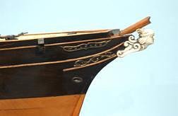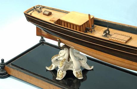 InformationAdmiralty style model of the brig, 'Walborg', English or continental, circa 1840. The hull is constructed from several laminations of a light colored hardwood below the waterline and a few sections of what appears to be ebony above the waterline. The hull has an applied keel and rudder. The rudder is hinged at four points and the brass work on the hinges is of high quality consistent with the overall construction quality of the model. Up towards the bow is a beautifully carved ivory figurehead of a male bust with scrollwork. Just back from the figurehead on each side of the hull is an applied nameboard. The name, 'Walborg', is in gold lettering as is the border of the nameboard. Below the nameboard are applied gold trailboards. The hull has a raised fore and rear deck. All the decks are constructed of a light colored wood with black scribe lines delineating the planking. Inside of the bulwarks and between molded strips is a green painted space with etched diamond shape decorations. Mounted to the deck are several detail fittings which include: bowsprit, water pump, windlass, deckhouse, snub mast, additional pumps, balustraded pinrail with ship's bell and deckhouse. The deckhouse is beautifully constructed with multicolored wood paneling and including two glazed doors facing the stern. Mounted to the rear deck is a companionway hatch, skylight with brass protecting rods and a metal and ivory ship's wheel. The model sits on a pair of sculptural supports. The supports are made in two parts. The upper part which is copper colored and is shaped like an oarlock has a beautifully turned brass inverted finial. The bottom section of support is made from a heavy metal casting that is painted white. Each of these sections has six serpentine shaped scrolled arms above a raised base supported by six leaf shape feet. The bases sit on a beautiful period case. The base of the case is bird's-eye maple with beautifully turned circular ebonized feet. The top section of the case is brass and is glazed on all four sides and top. The selection of materials, the use of ivory, the detail and overall sculptural quality of the model is outstanding. (SM-434)