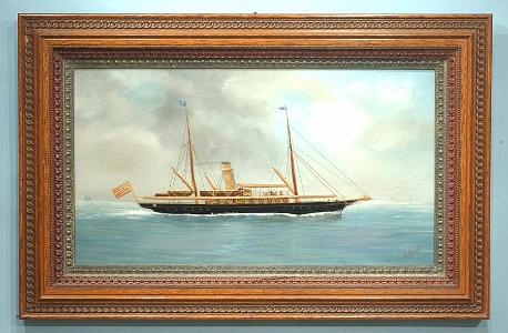 Oil on canvas, multimedia picture, signed lower right: "Gh. Burkert", depicting the two masted steam yacht, "Sylvia". The vessel has a velvet hull, lifeboats and stack. The spars, rigging, US flag and figures are embroidered. This multimedia vessel, like T. Willis paintings, is created on an oil on canvas background. The sea and sky are well painted and there are a few other vessels painted off in the distance. The artist has painted an effective white water wake around the hull. The painting retains its original Victorian frame which has a gold liner and a multi- molded natural wood frame. (PA-500)
