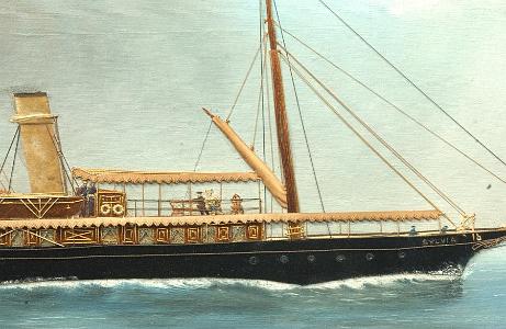Note: The steam yacht, "Sylvia", was built in 1882 in Glasgow by A. Stephen & Sons and belonged to Edward M. Brown. Mr. Brown was a member of the New York, Atlantic and Larchmont Yacht Clubs. Sylvia was 146 feet in length, 18.5 in breadth and 10 feet in draft. Dimensions of Painting: Height 17 3/4 inches; Width 31 3/4 inches.