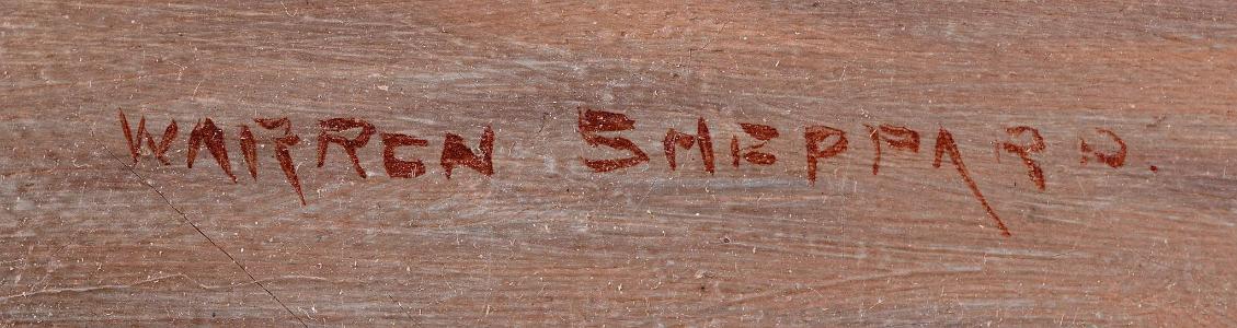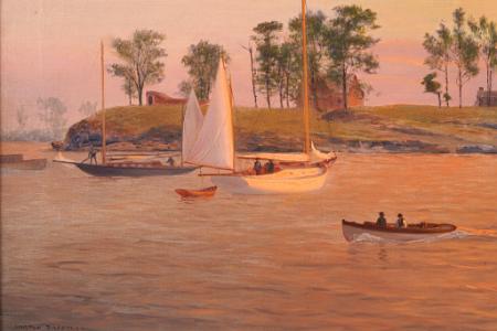 InformationSheppard, Warren W. (American 1858-1937) Oil on canvas, depicting a sunset off the New England coast (probably the Connecticut shore off Long Island Sound), signed lower left: "Warren Sheppard", circa 1900. At the center of the painting, there is a spit of land which is possibly an island but probably a peninsula. To the right of the land is a large mansion, to the left a barn and to the far left an outbuilding - clearly, a wonderful estate. The water is very calm. Left of center is what looks like a Herreshoff launch with two figures. Beyond the launch is a white hull yawl with her mizzen sail raised and a small dory trailing behind. There is a second blue hull yawl with a raised mizzen. Both yachts have a few figures aboard. The painting has a wonderful calm and tranquil spirit. (PA-545)