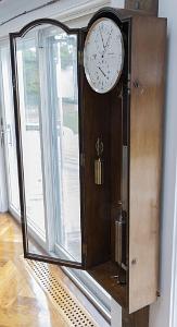 E.J. Dent eight day 'Regulator' clock, signed on the 12 hour dial Dent, London, Clockmaker to the Queen, No. 892, circa 1849. Additionally, the movement is engraved Dent No. 892. The movement has a jewelled deadbeat escapement and Harrison's maintaining power. The clock has jewelled pallets. The case is fitted with a rare inches and beat regulation scale which states at the bottom: English inches and a scale of 0 to 12. The clock retains its original steel case mercury pendulum, typical of the type used by Dent. The clock has a top quality mahogany case with arched top, double door locks and dust seal. The case has its original finish and lacquer on the back plates. Presently the pendulum is filled with lead shoot and the clock is in excellent runing order.(CL-521)