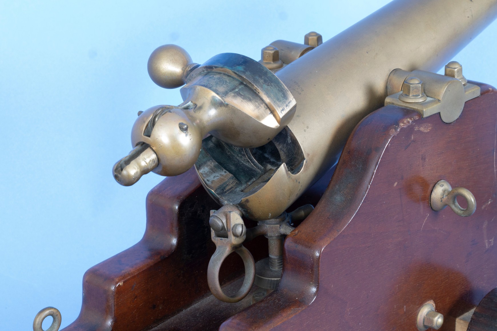 8 gauge Brown signal cannon, Connecticut, circa 1890. The cannon has a 12 1/2 inch heavy brass barrel. The breech rotates counter clockwise by lifting a bronze knob mounted to the side of the breech. Mounted to the rear of the breech is a standard Brown plunger activated firing pin and pulley. The bottom of the barrel at the rear has the standard ring shape shell ejector. The cannon retains its original mahogany yacht carriage with front mounted lignum vitae wheels. The carriage retains its original brass trunnion caps, through bolts, side and rear tie-downs, elevator mechanism, rear cord pulley, wheel washers, wheel covers and axle pins. (I-642)