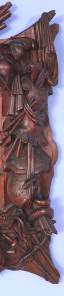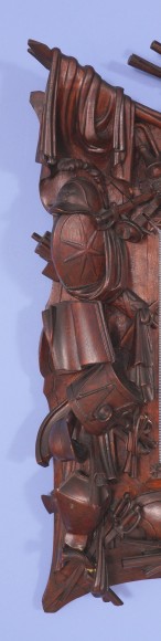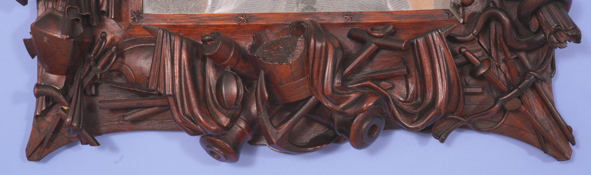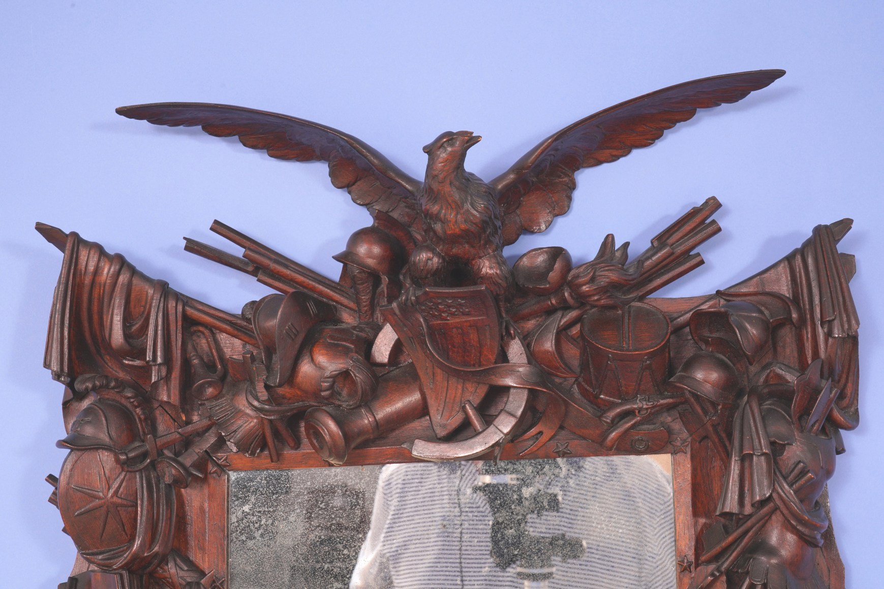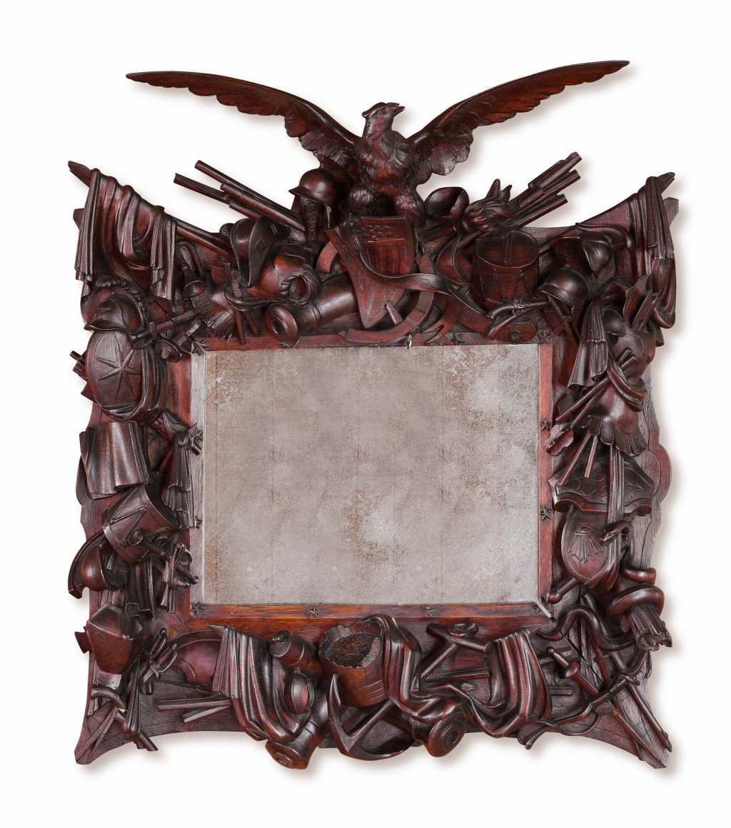 American centennial carved rosewood frame with history of war implement with American eagle holding a banner, circa 1876. The frame has highly detailed applied carvings to all four sides. The carvings are all in natural wood and represent weapons of war from the Roman Empire period through the American Civil War. There are helmets and shields, swords and muskets. There are carved drums that show the side ropes and even the drum sticks. There are mixed in nautical themes including anchors, three corner hat and cannons. On the right side of the frame is a coiled snake. Mounted to the top center is a full bodied spread winged eagle with an American shield below and a flowing banner which states E- Pluribus Unum. The inner border of the frame has a thin plain liner with applied five-pointed stars around the perimeter.