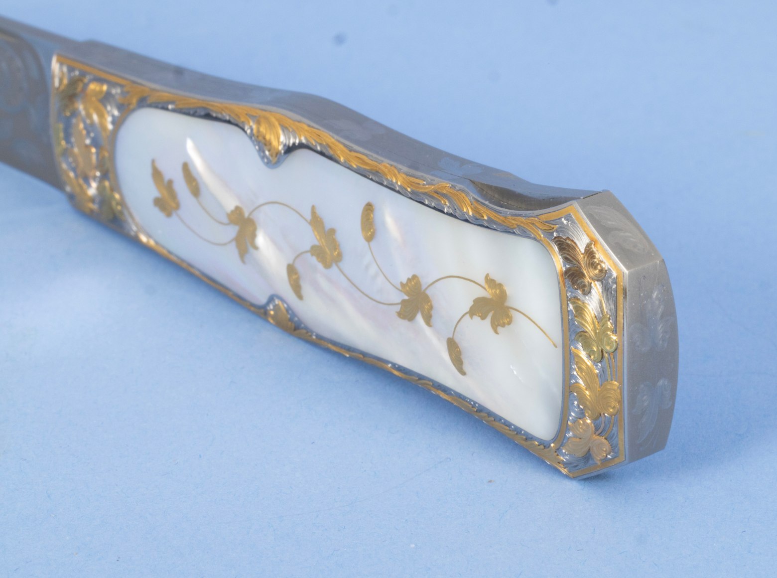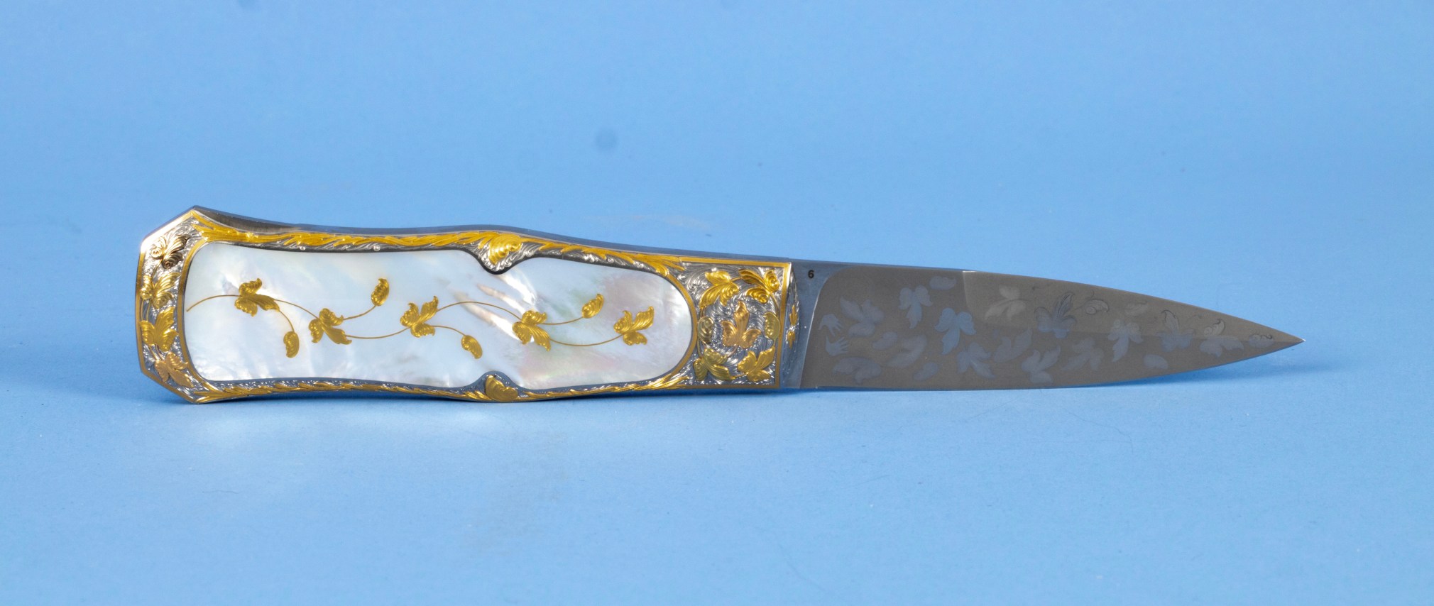 Custom dagger signed on the blade "Steve Hoel Pine Arz." and engraved by Barry Lee Hands. Barry Lee Hands logo is engraved appearing like a pair of up facing hands at the base on one side of the blade. The knife has black lip pearl scales which are deeply engraved and gold inlaid in Barry's famous leaf pattern. The bolsters are also engraved and gold inlaid in the same pattern. the top edge and butt of the case has black and white engraved leaves as does the blade. This knife won the 2024 "FIREARMS ENGRAVERS GUILD OF AMERICA BEST ENGRAVED KNIFE AWARD". Steve Hoel and Barry Lee Hans have joined forces to create several masterpiece level knives. (KN0056)