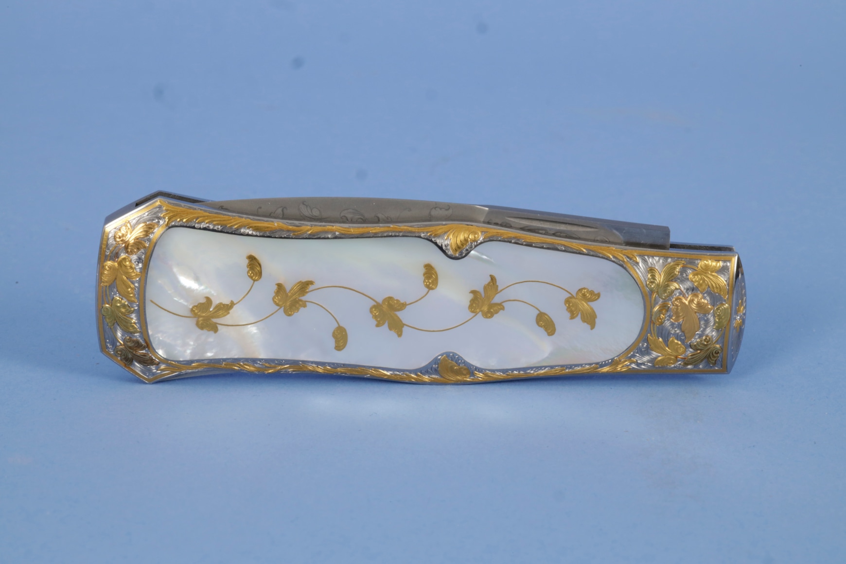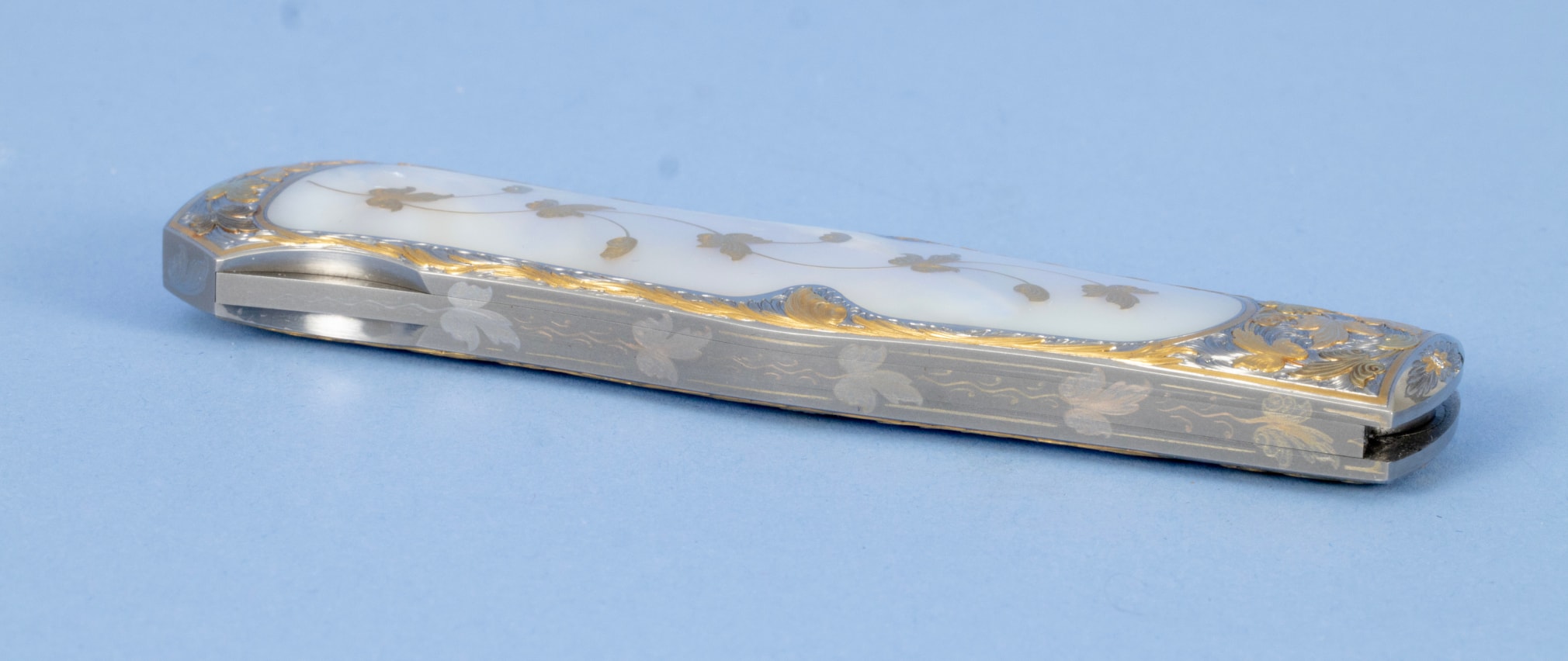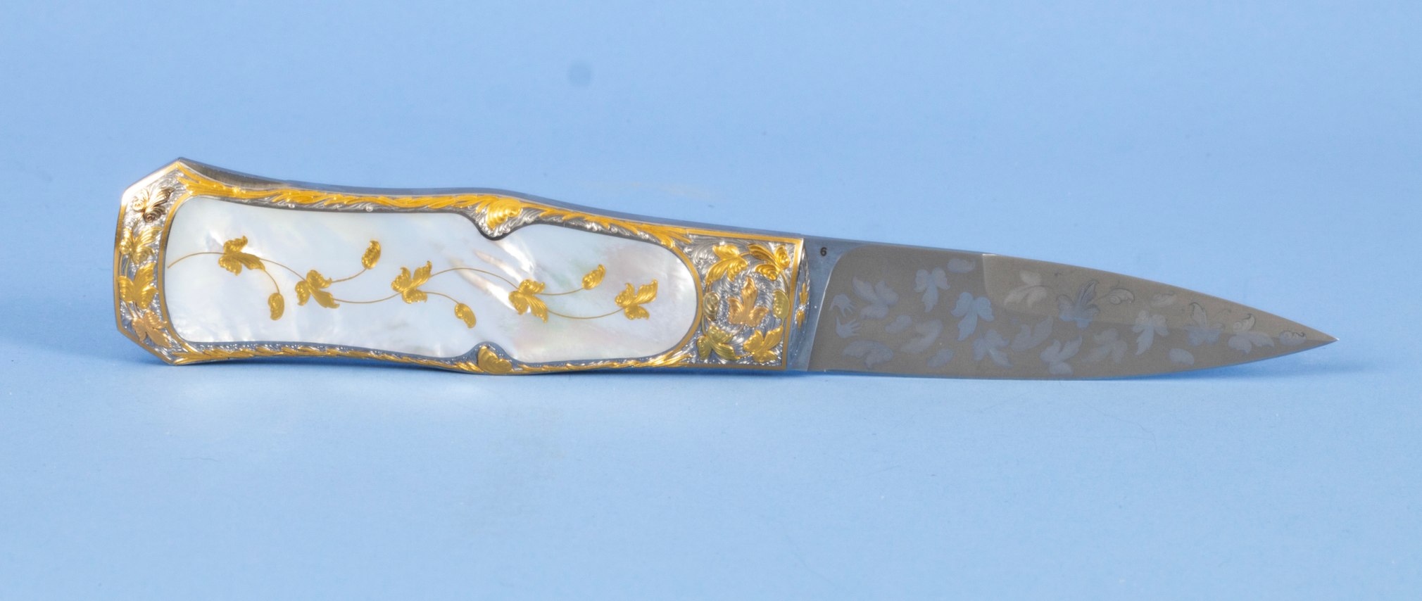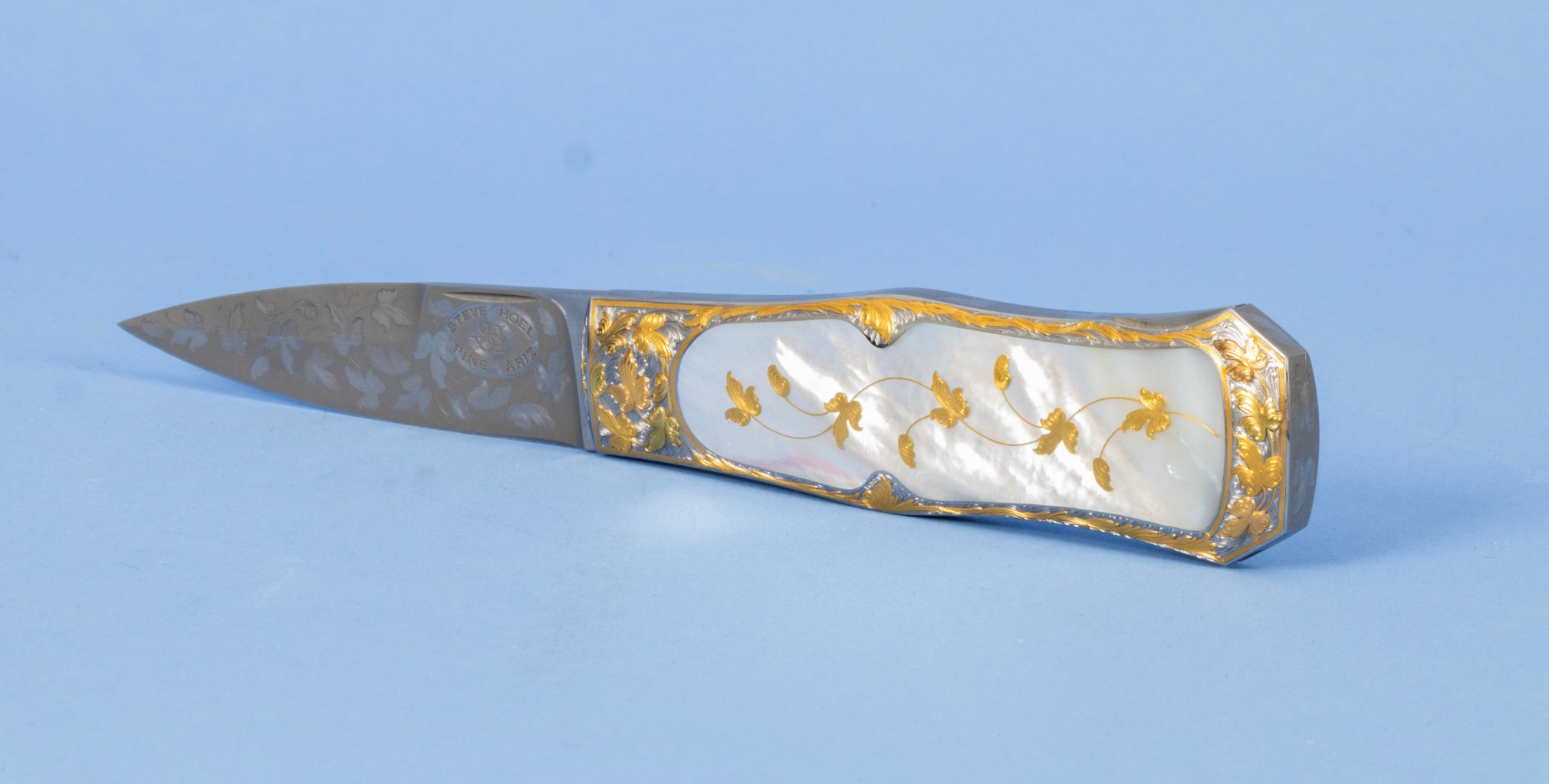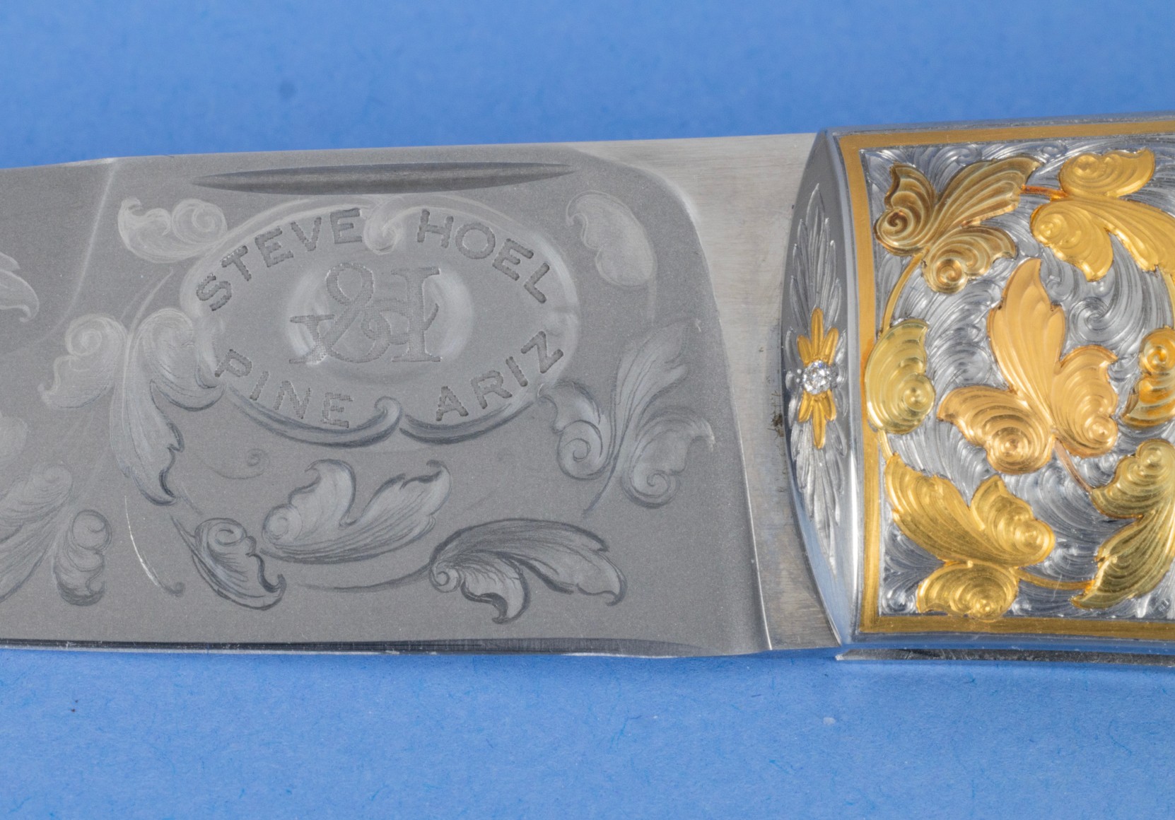 About the Maker: Steve Hoel made his first fixed blade knife in 1953. In 1974 Steve Hoel ventured to California, where he spent three days in the shop of Bob Loveless and Steve R. Johnson, when they were partners. This was his first real exposure to high quality handmade knives, an experience that gave him a big boost. He also developed a big interest in pocket knives at that time. Shortly thereafter he made his first inter-frame and multi-blade folders. In 1978, he joined the Knifemakers Guild, and one year later he retired and began making knives full time. Steve was one of the first to design his knife shapes for engraving. He worked closely with master engravers including Lynton MacKenzie and Steve Lindsay to develop the engraveable art knife design.