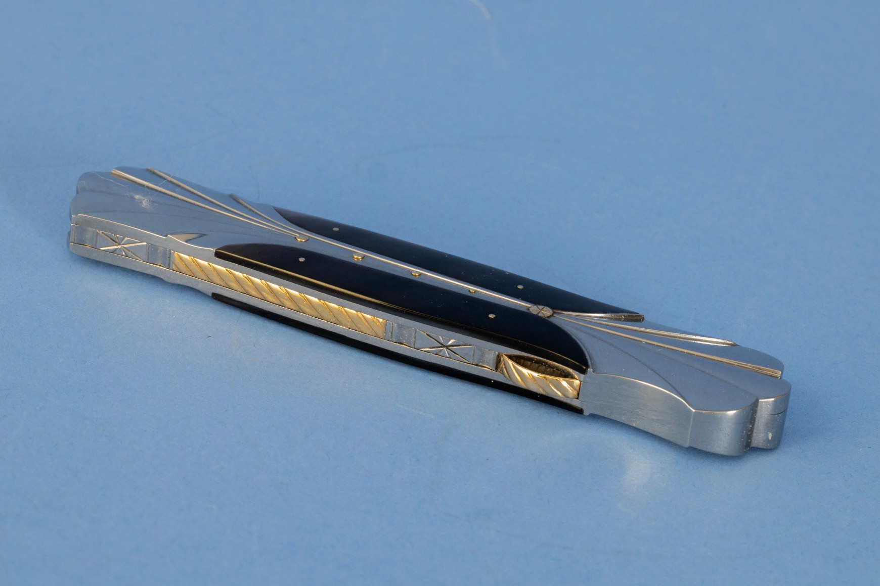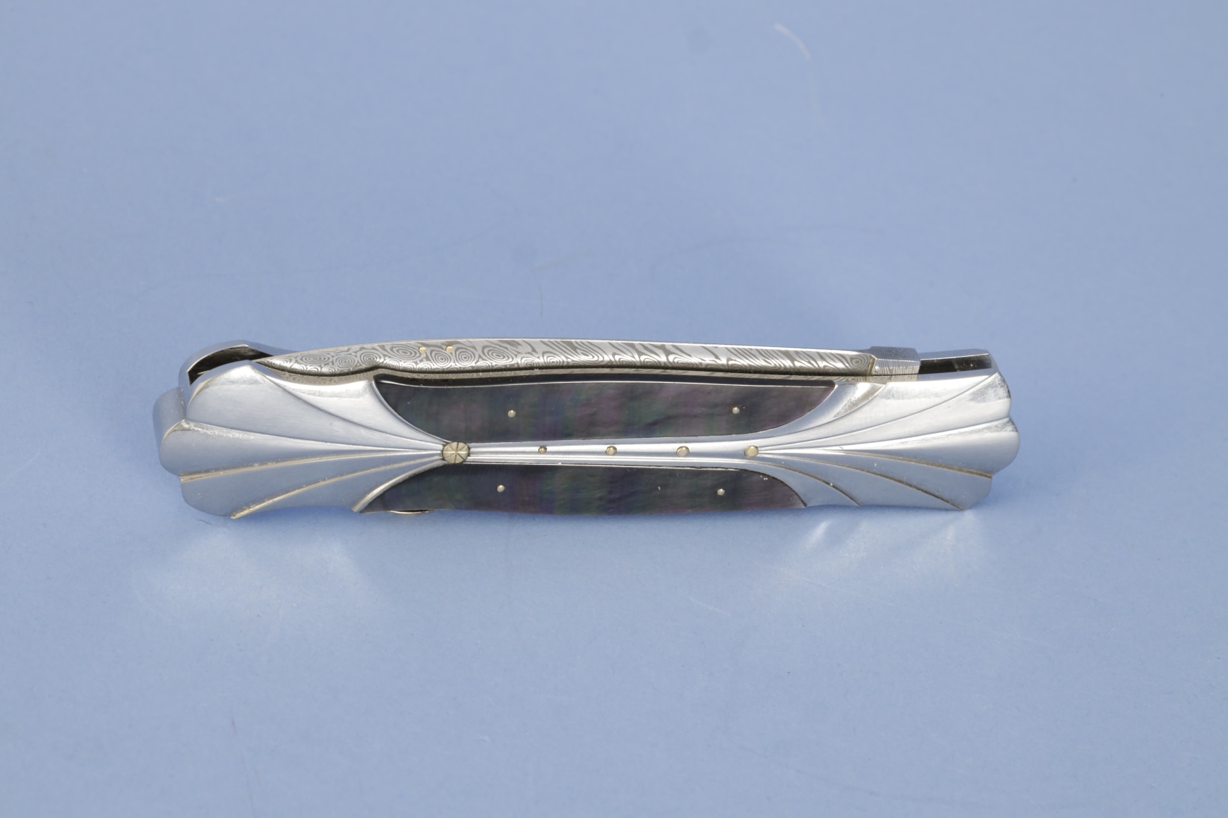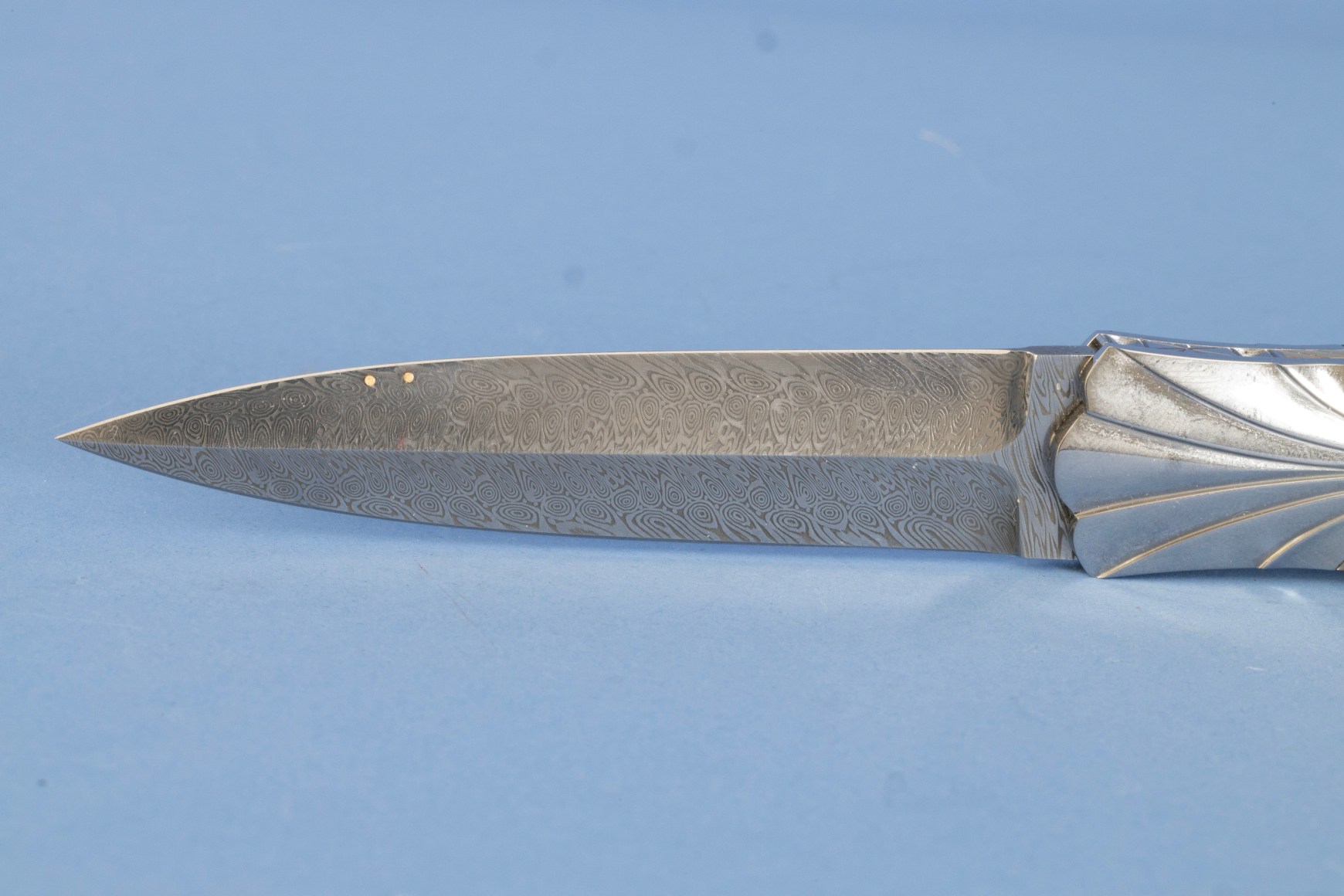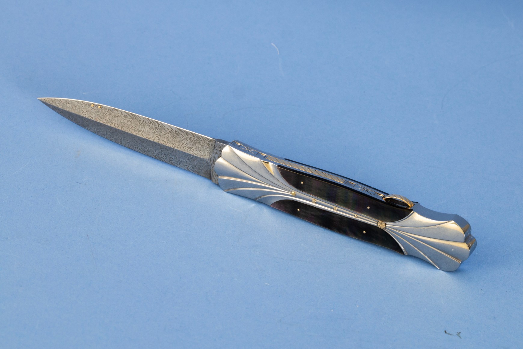 Fine custom knife signed KA Steigerwalt in the inside base of the the case. The case has fan relief shaped bolsters with black lip pearl grips. The grips are help in place by small gold pins. The polished steel bolsters has a thin tapered section that runs from the bottom of the front bolster to the top of the bottom one. This tapered section has four inlaid decorative gold dots that are in graduated sizes. Below the dots is a larger gold pin with a rosette like engraving. The dagger shaped blade is made from demascus steel. The blade locks into position and the lock release is on the top back section of the bottom edge of the grip. The bottom of the case has a long rectangular gold inlay with a rope like surface with a smaller steel engraved pattern on opposite side of the gold bar. (PA0053)