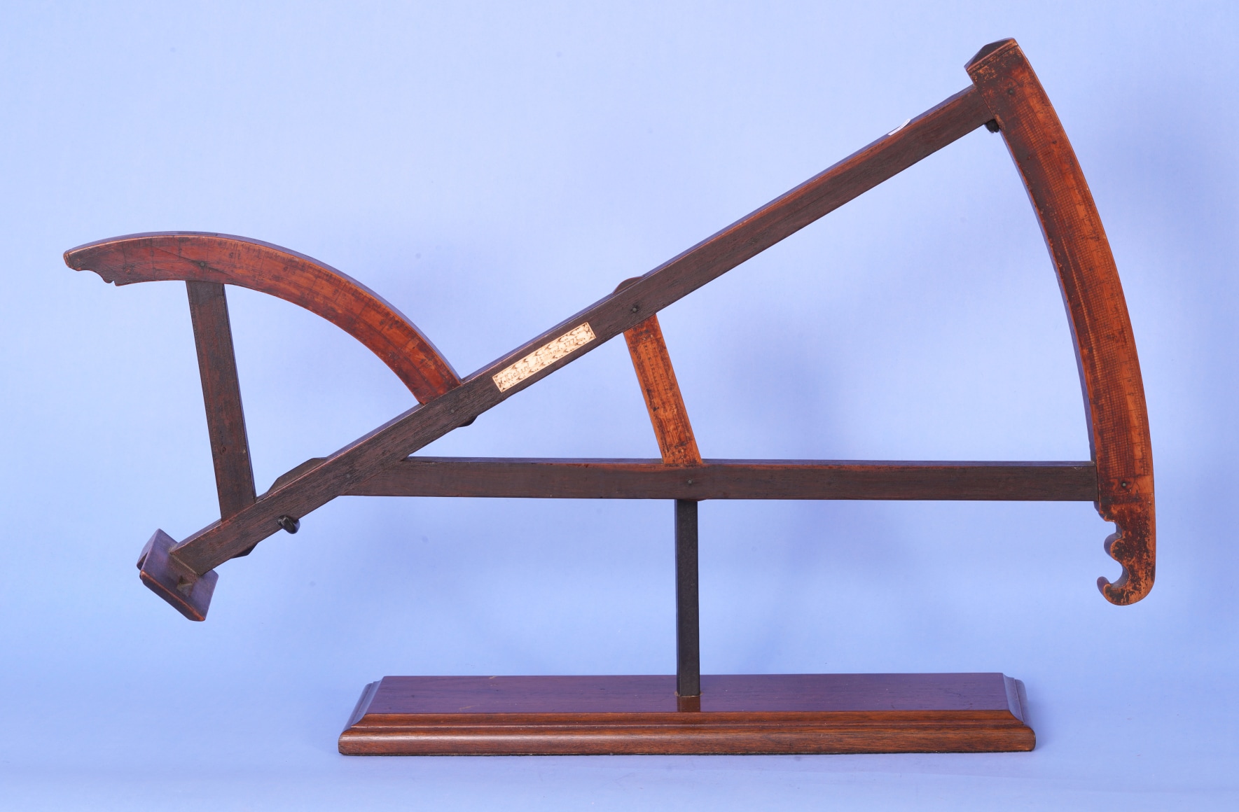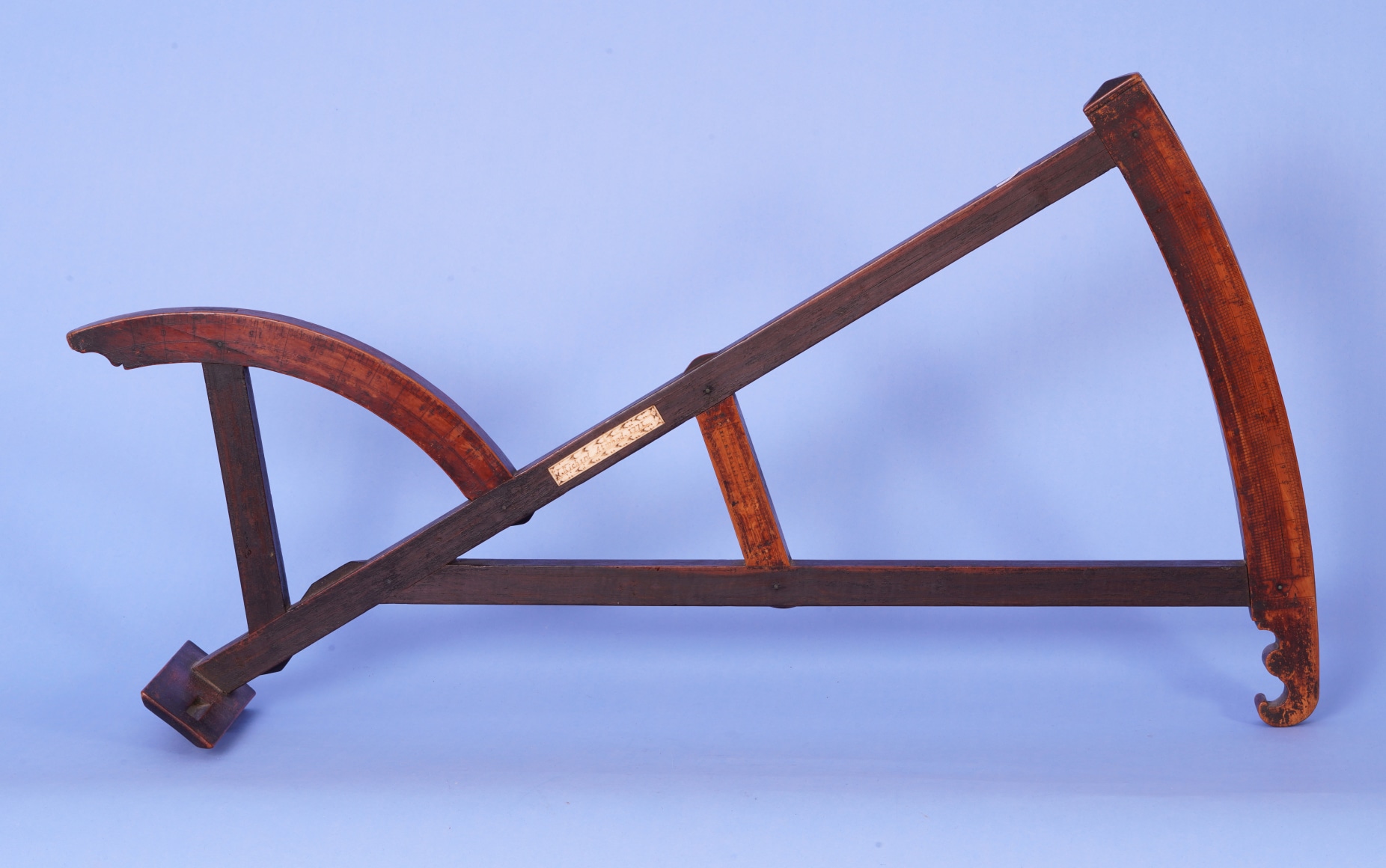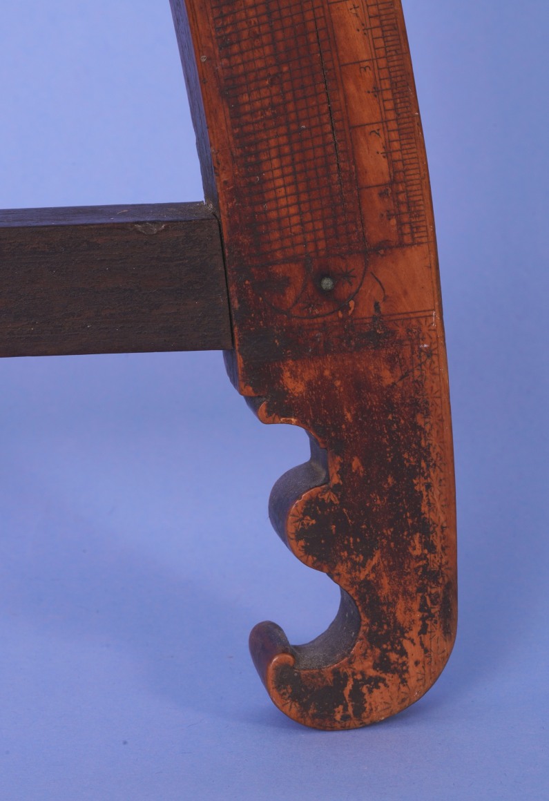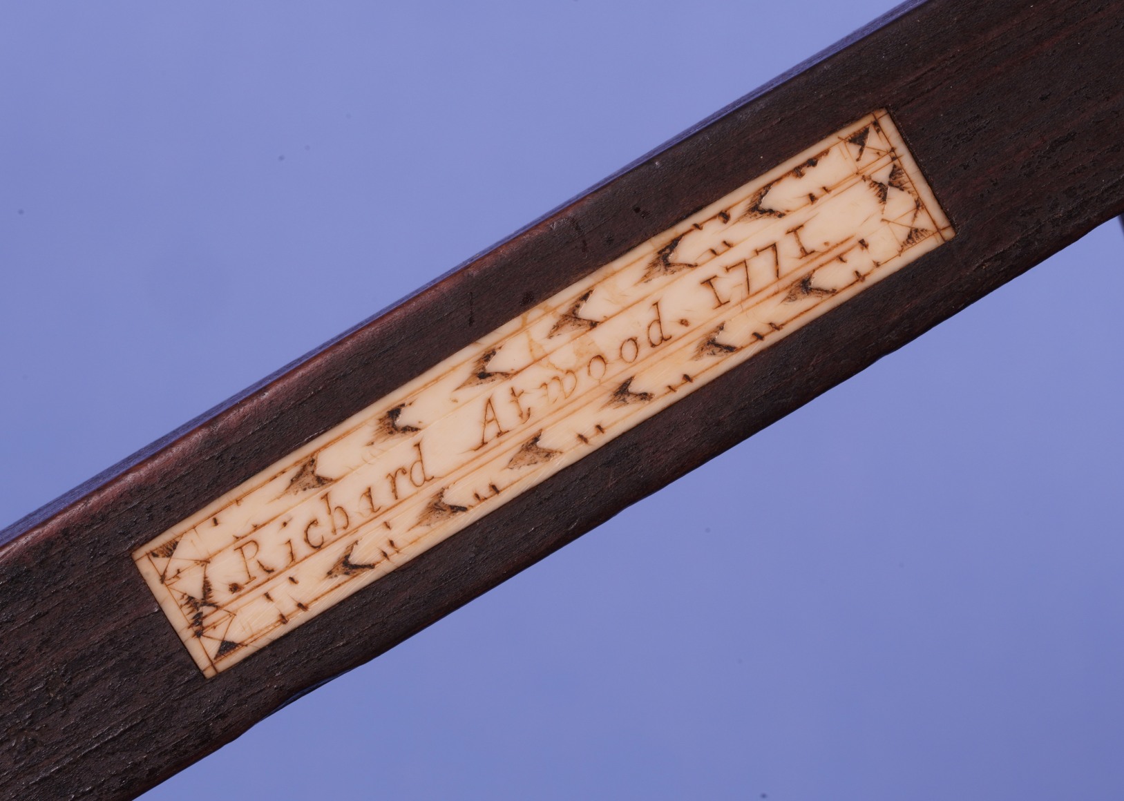 Boxwood and ebony backstaff signed on the boxwood cross limb 'MADE BY WILLIAM WILLIAMS KING STREET BOSTON 1770.' There is an ornate bone insert on the horizon limb which is engraved 'Richard Atwood 1771.' The instrument is beautifulkly crafted and has a typical engraved boxwood scale with a fancy hook on one end and a smaller arc with engraved scales on the opposite end. The ebony limbs have paired scribed lines on both the front and back of the instrument. There are decorative stars stamped throughout the instrument at opposite ends of the maker's signature. The instrument retains the original horizon vane which is beautifully champhered. (I-852)