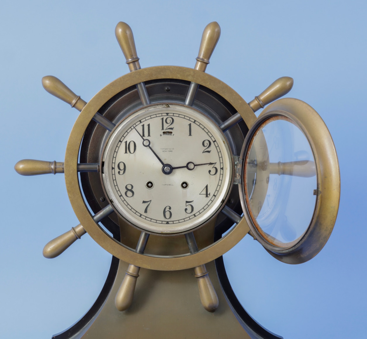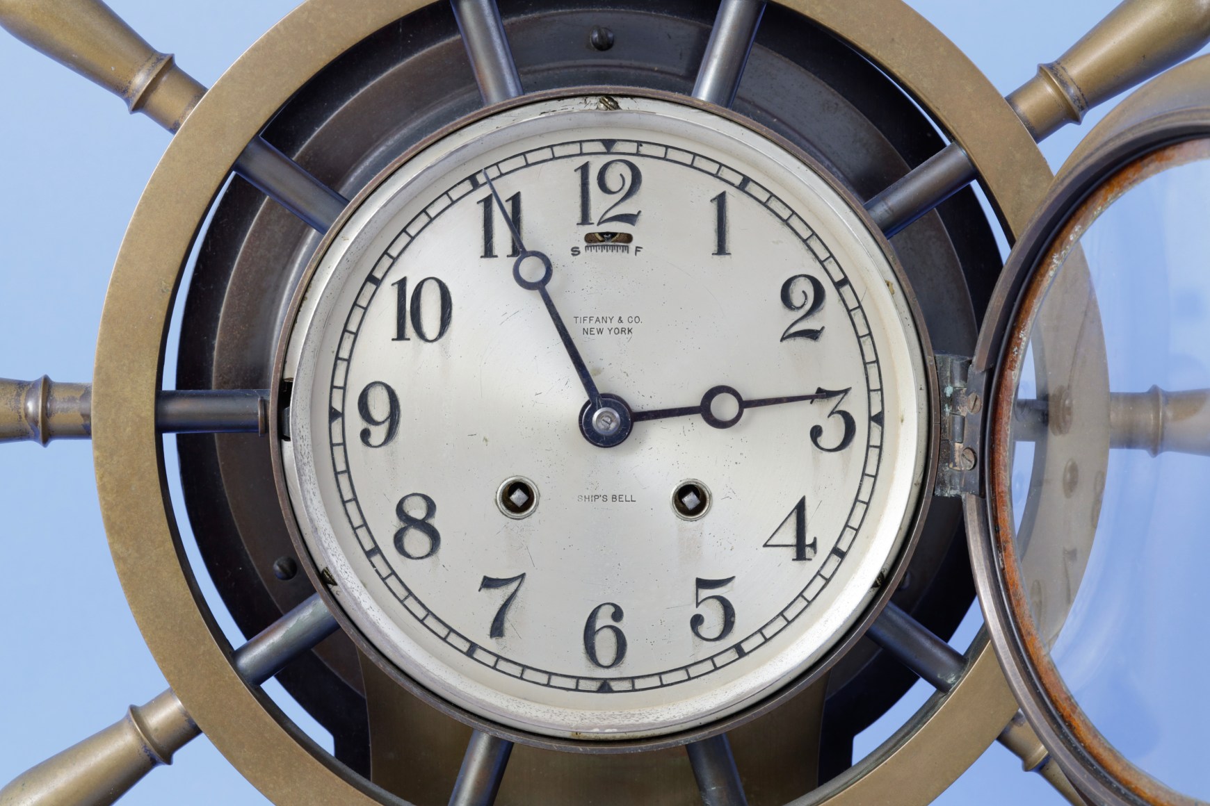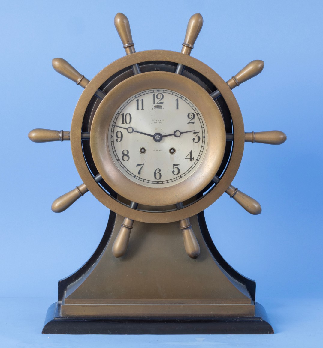 Chelsea 6-inch Mariner Sip's Wheel clock, Boston, Circa 1970. The clock has an engraved silver dial with Arabic numerals. The dial is engraved: "Tiffany and Co. New York and "SHIP'S BELL". The clock has patinized bronzed brass case with a ten spoke ship wheel around it. The clock sits on a bronzed base. The back and bottom of the base are mahogany. The clock retains the original Chelsea eight-day time and strike movement which is numbered: "164736",