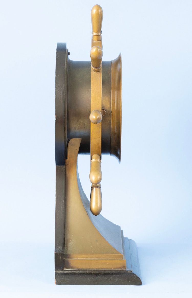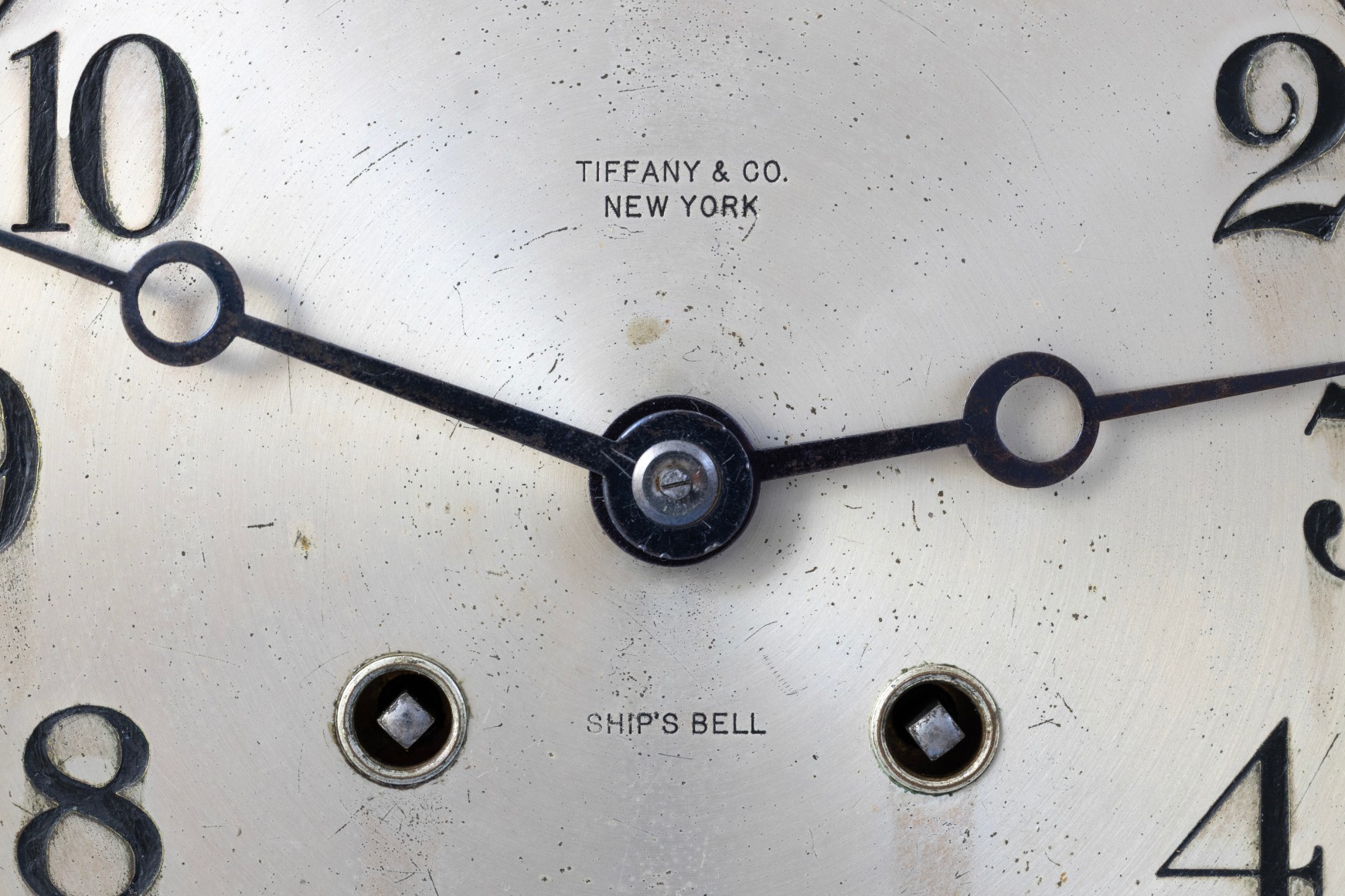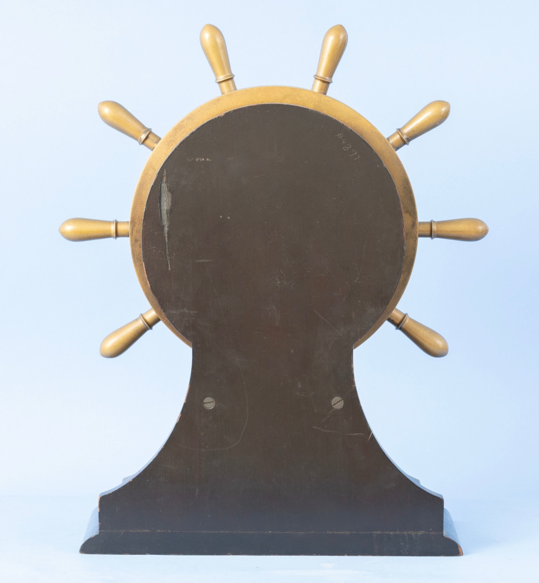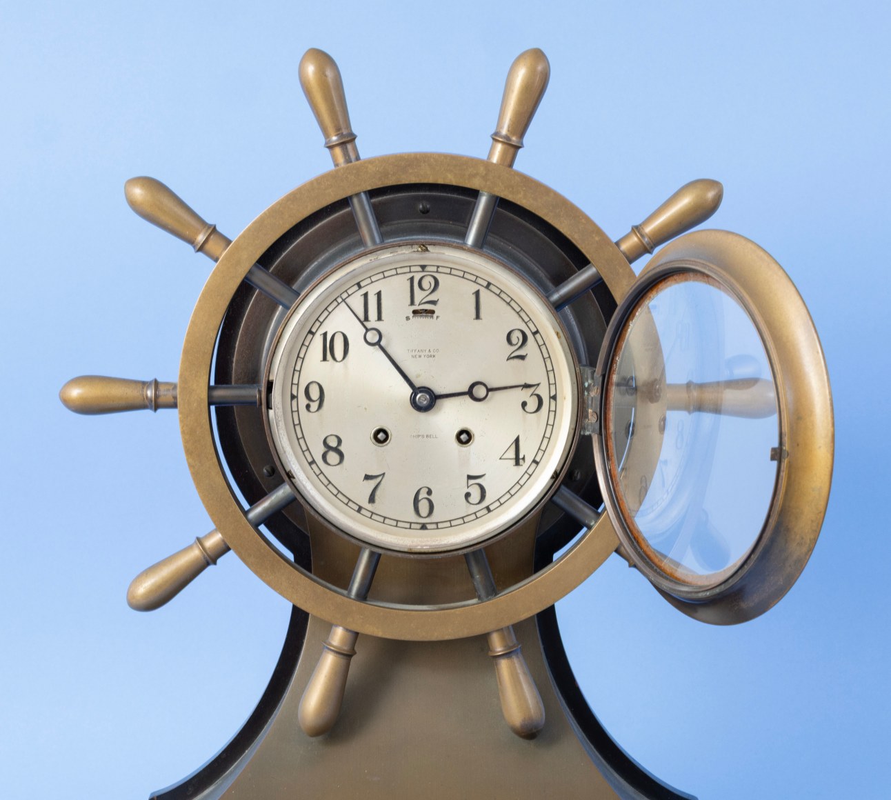 Chelsea 6-inch Mariner Sip's Wheel clock, Boston, Circa 1970. The clock has an engraved silver dial with Arabic numerals. The dial is engraved: "Tiffany and Co. New York and "SHIP'S BELL". The clock has patinized bronzed brass case with a ten spoke ship wheel around it. The clock sits on a bronzed base. The back and bottom of the base are mahogany. The clock retains the original Chelsea eight-day time and strike movement which is numbered: "164736",