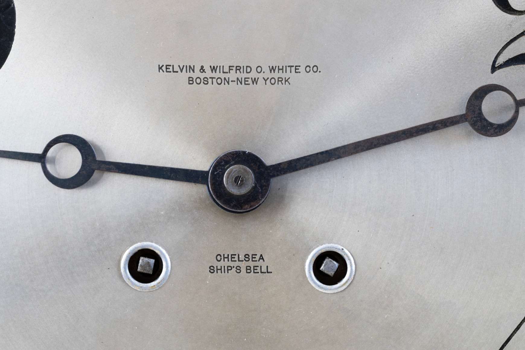 Chelsea 8 1/2 inch ship's bell clock, circa 1920. The clock has an engraved silver dial with engraved and wax arabec numerals. The face is engraved: "CHELSEA CLOCK CO. BOSTON, U.S.A.", and is also engraved: "SHIP'S BELL". The dial is also signed by the retailer "Kelvin & White o. Whits Co., Boston. Below the numeral "12" is a slow/fast adjustment. The clock retains its original, moon shaped hands. The clock retains its original, Chelsea time and strike, eight day movement which is numbered: "1139566". The clock retains its original, yellw brass case with a shield shaped hinge with swing bezel. The back of the case is signed: "CHELSEA CLOCK CO." and bears the same serial number as the movement. (CL0640)