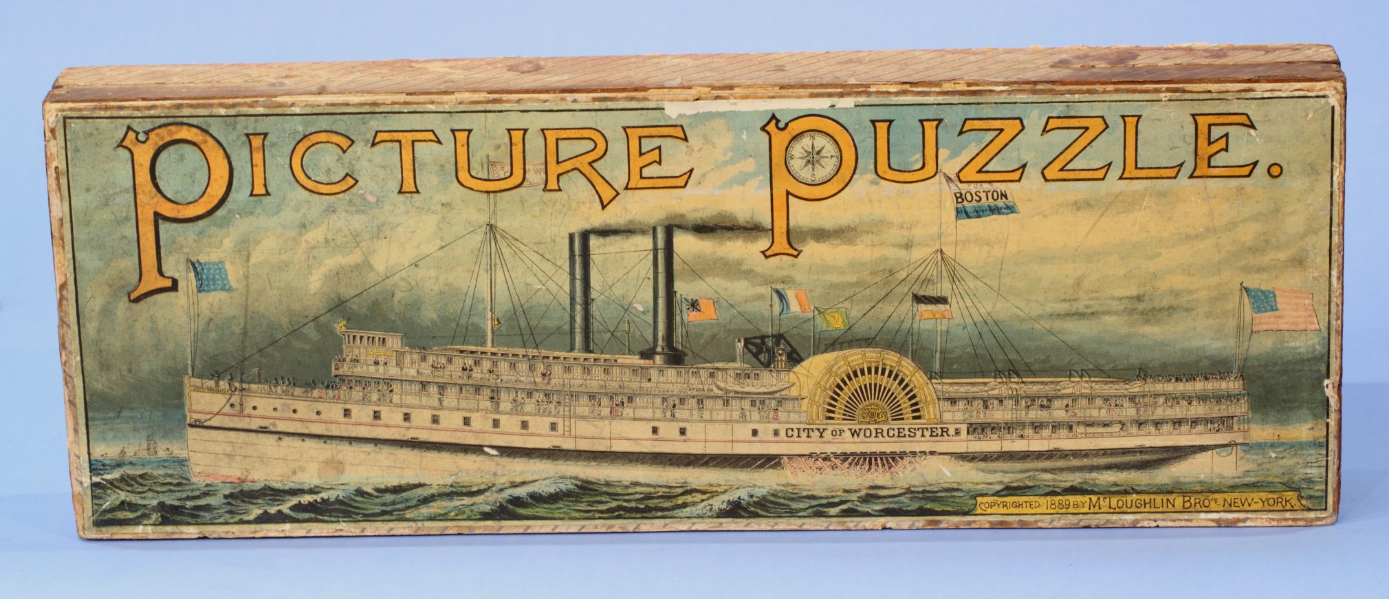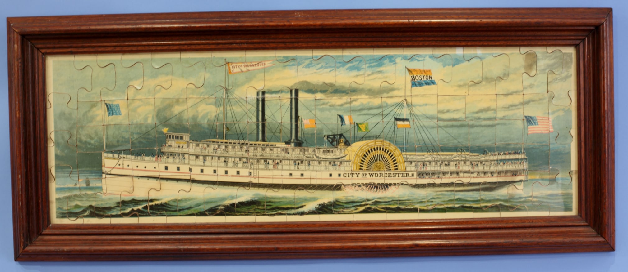 Boxed lithograph picture puzzle of the paddlewheel steamer "City of Worcester." The puzzle has great detail and color. The image shows the white hull paddle wheeler with her deck filled with figures. The vessel is flying several flags including the Union Jack, the American flag, a banner with the wording "City of Worcester" and a banner stating "HORWICH LINE FOR BOSTON, NEW LONDON AND NORWICH." The vessel is also flying four other national flags. The puzzle was assembled many years ago and is in a period molded walnut frame. The puzzle retains the original lithograph box which shows the completed puzzle on the top and in the bottom right corner states: COPYRIGHTED 1899 BY McLOUGHLIN BRO'S NEW YORK. (FA-909)