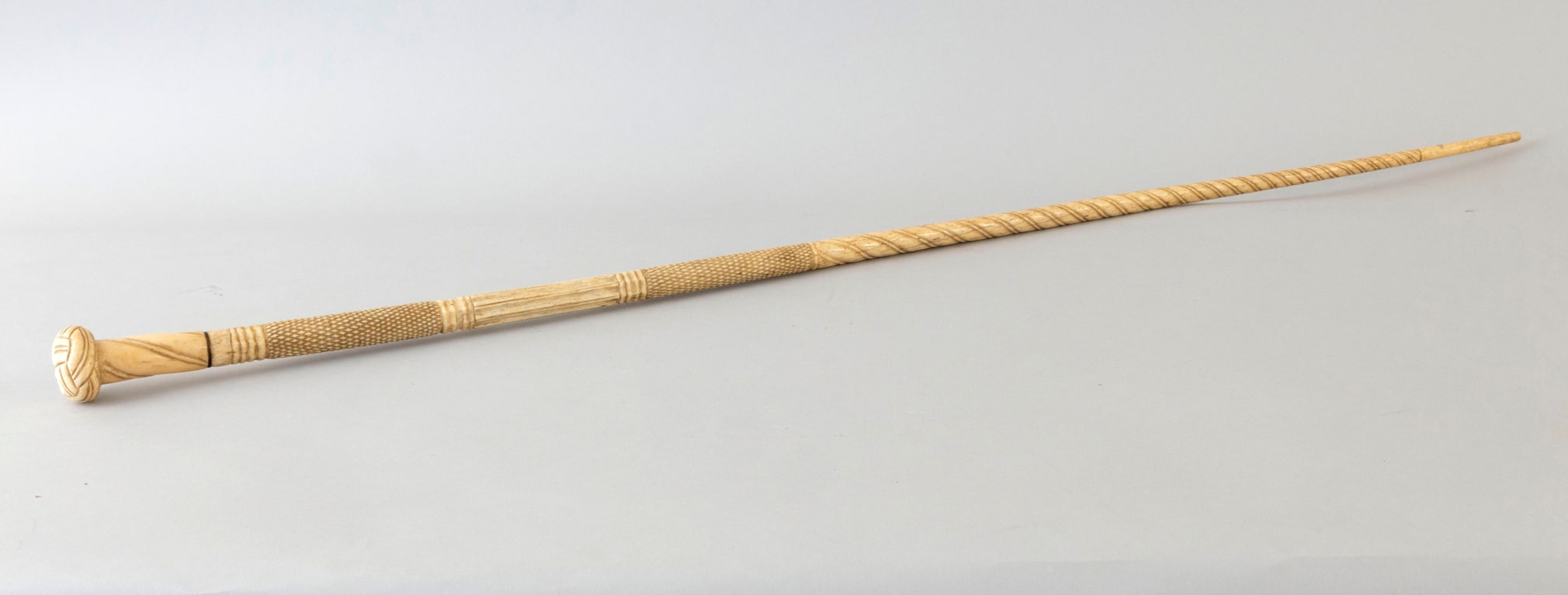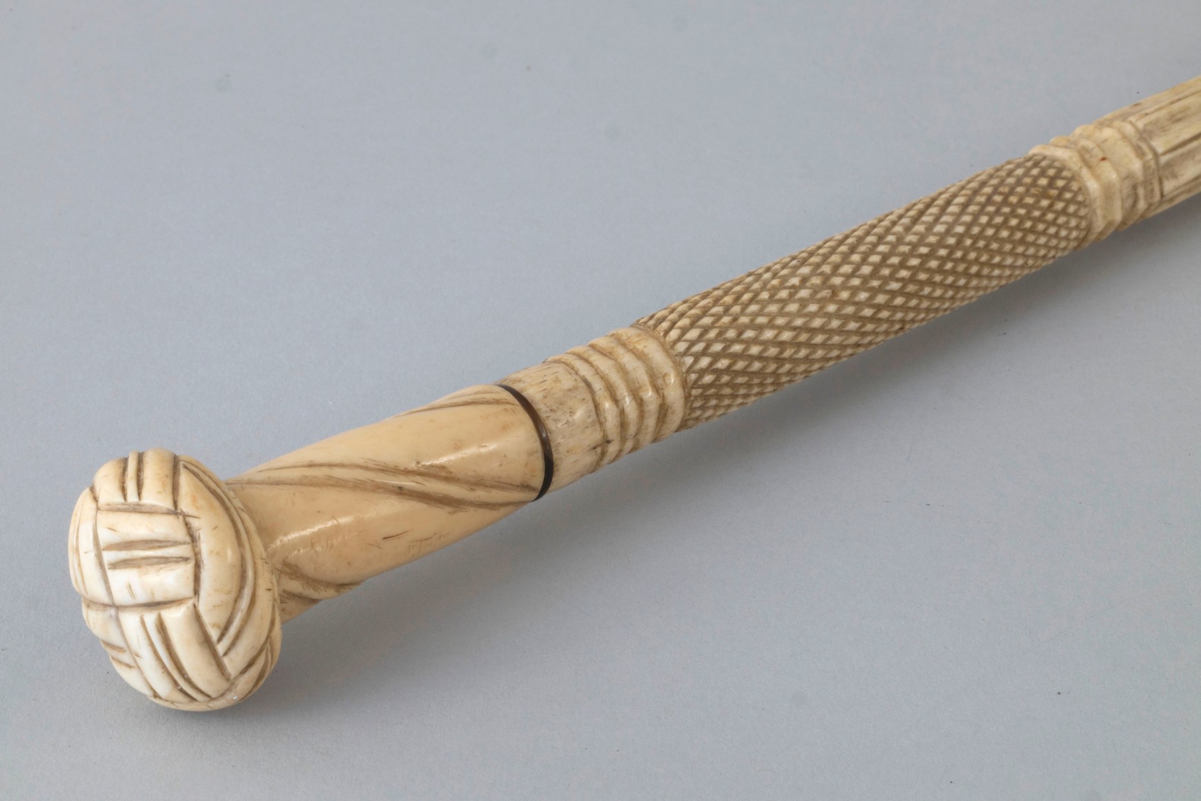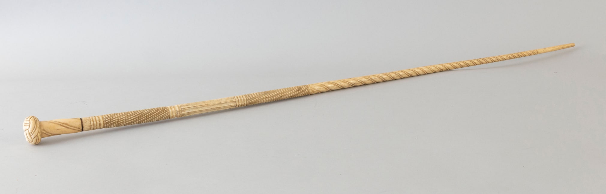Whale Ivory and whalebone cane, American mid-19th century. The cane has a whale ivory Carved monkey fist grip with wormed rope shaft. Below the grip is a baleen spacer above a fancy carved tapered shaft. The top of the whalebone shaft has a fine and delicate diamond cross hatch pattern carving above a fluted section above a second diamond cross hath section and then with a longer section of wormed rope carving. The remaining shaft is round and smooth. The carving is of very high quality with a complex carving pattern. (SC1221)