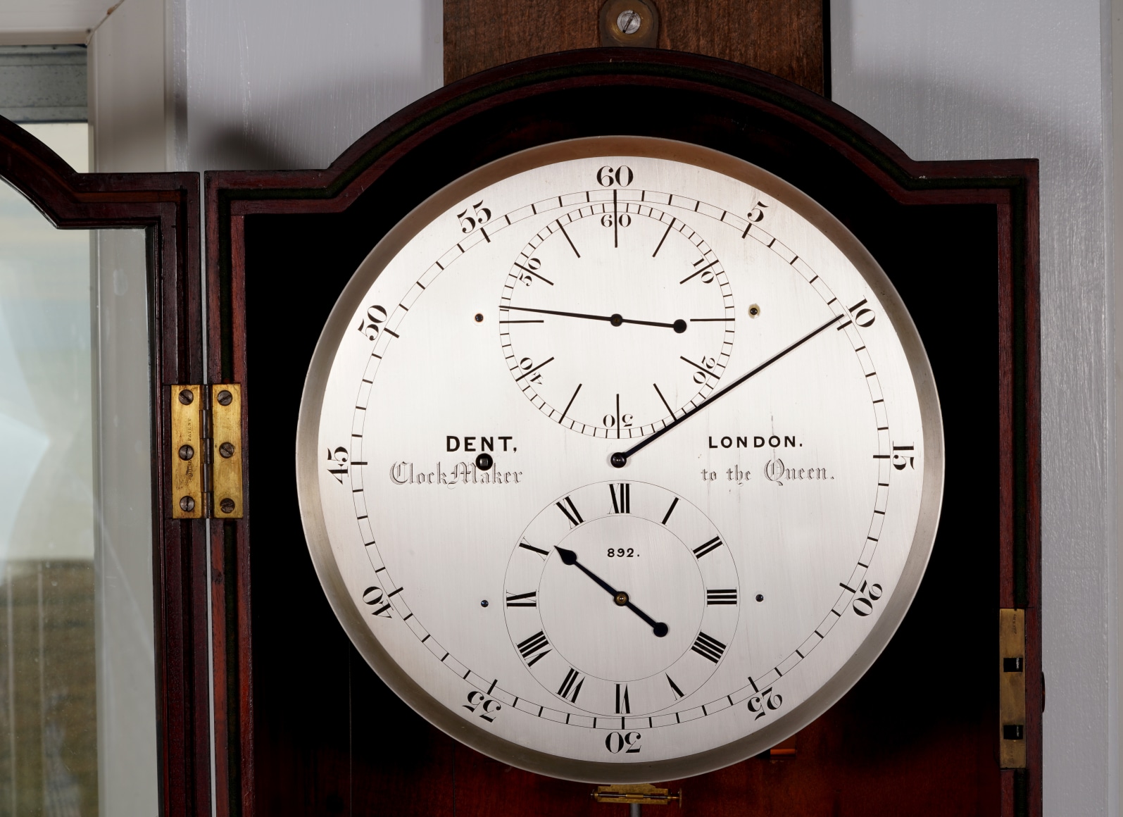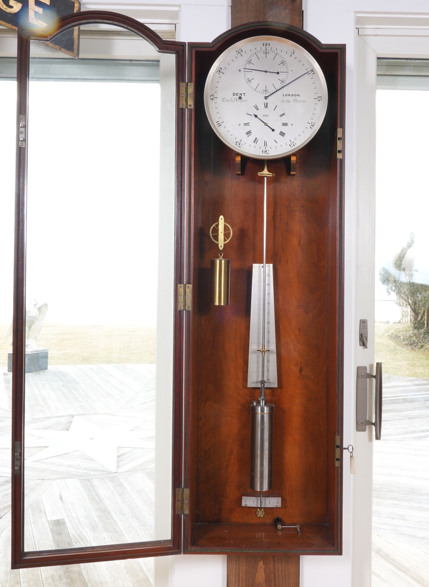 E.J. Dent eight day 'Regulator' clock, signed on the dial Dent, London, Clockmaker to the Queen, No. 892, circa 1849. Additionally, the movement is engraved Dent No. 892. The movement has a jewelled deadbeat escapement and Harrison's maintaining power. The clock has jewelled pallets. The case is fitted with a rare inches and beat regulation scale which states at the bottom: English inches and a scale of 0 to 12. The clock retains its original steel case mercury pendulum, typical of the type used by Dent. The clock has a top quality mahogany case with arched top, double door locks and dust seal. The case has its original finish and lacquer on the back plates. Presently the pendulum is filled with lead shoot and the clock is in excellent runing order.(CL-521)