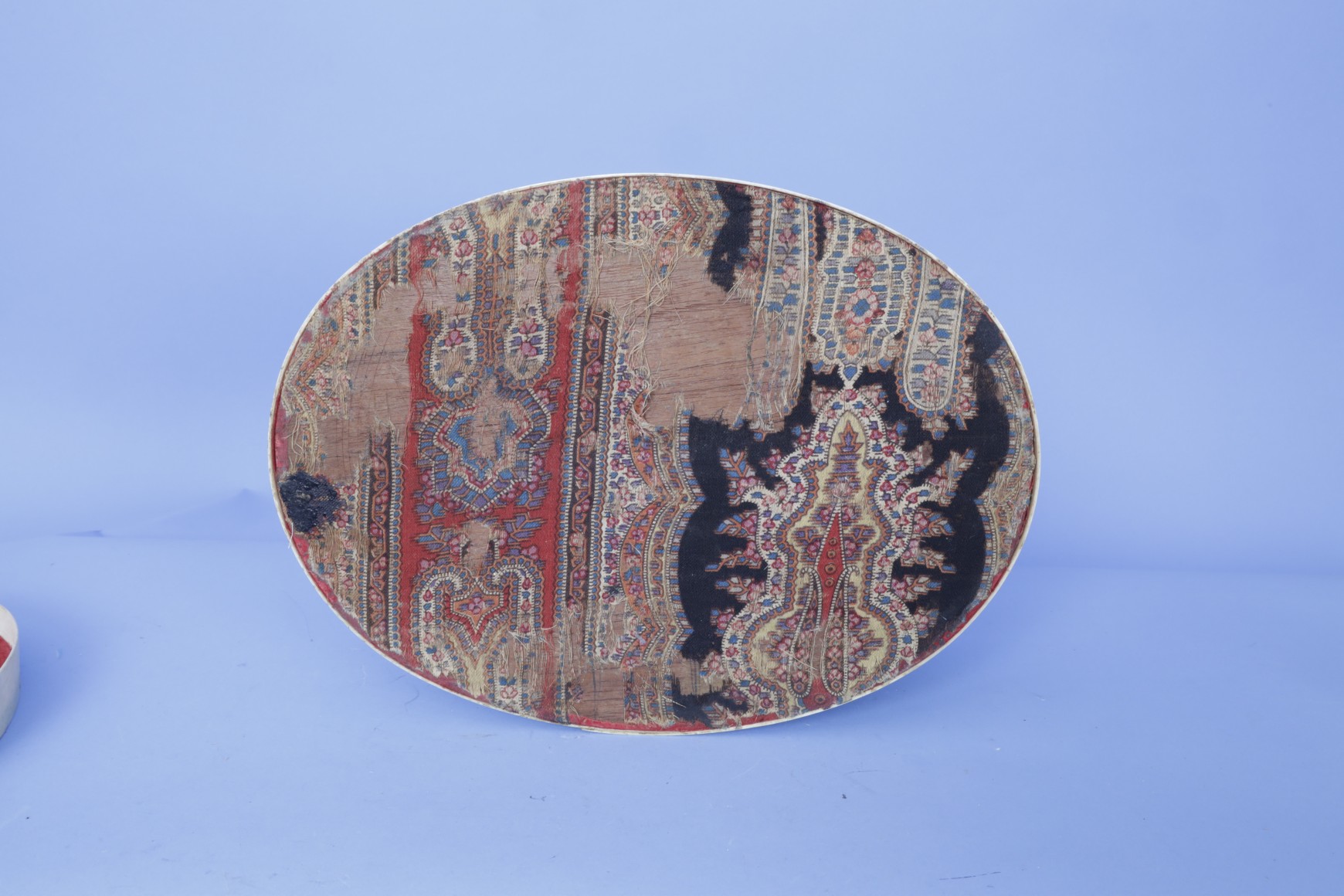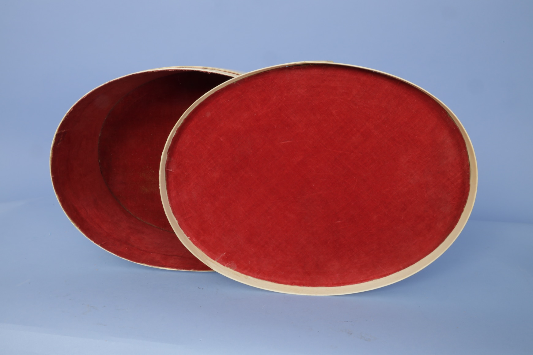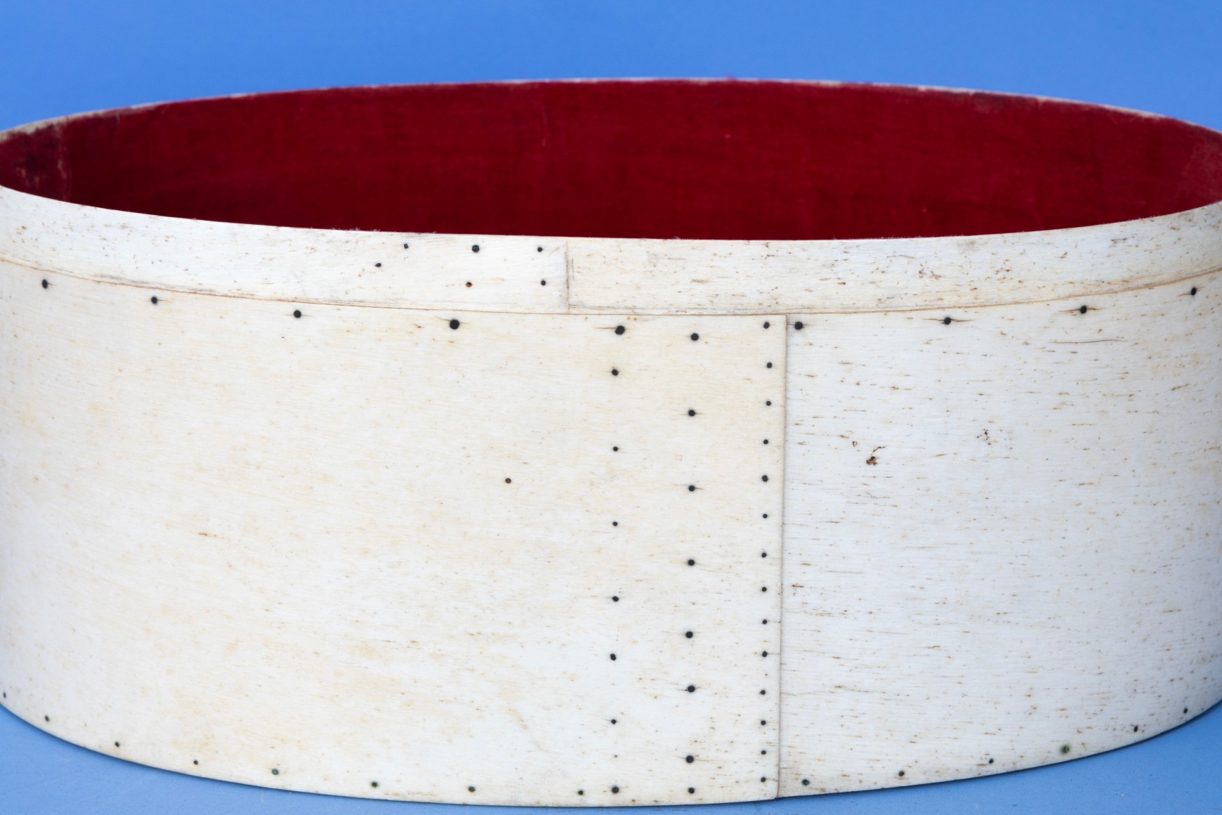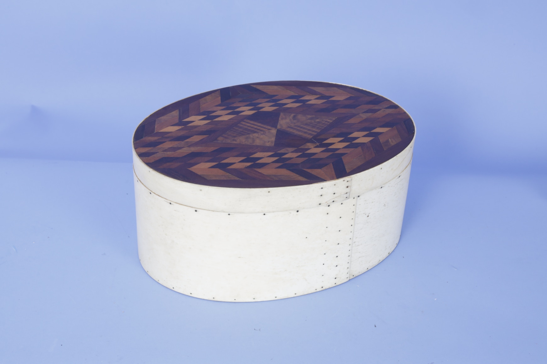 Exceptional and large oval whalebone ditty box, American, mid-19th Century. The basket has small metal fasteners attaching the bone to the top and bottom of the box. The top and base of the basket fit flush one over the other rather than the top sliding over the base which is more typical for this type of box. The box’s sides are joined at the center of one side by three rows of nails from top to bottom of the joint. The interior of the box and the top are lines with old red velvet-like cloth. The bottom base of the basket is lined with an old paisley pattered material. The bottom cloth has a small hole exposing a small section of the natural wood base. The top has a very elaborate marquetry design made of hundreds of diamond shaped pieces of wood of various sizes and species of wood types. Additionally, several pieces of the wood inlay are shaped like parallelograms of various colors. (SC1285)