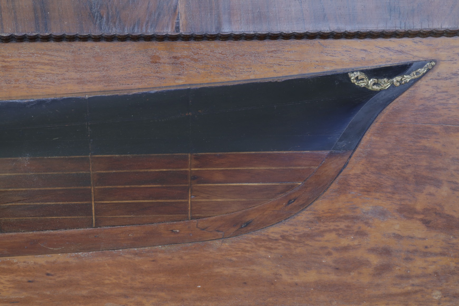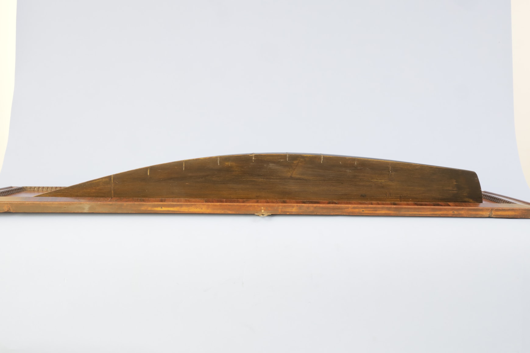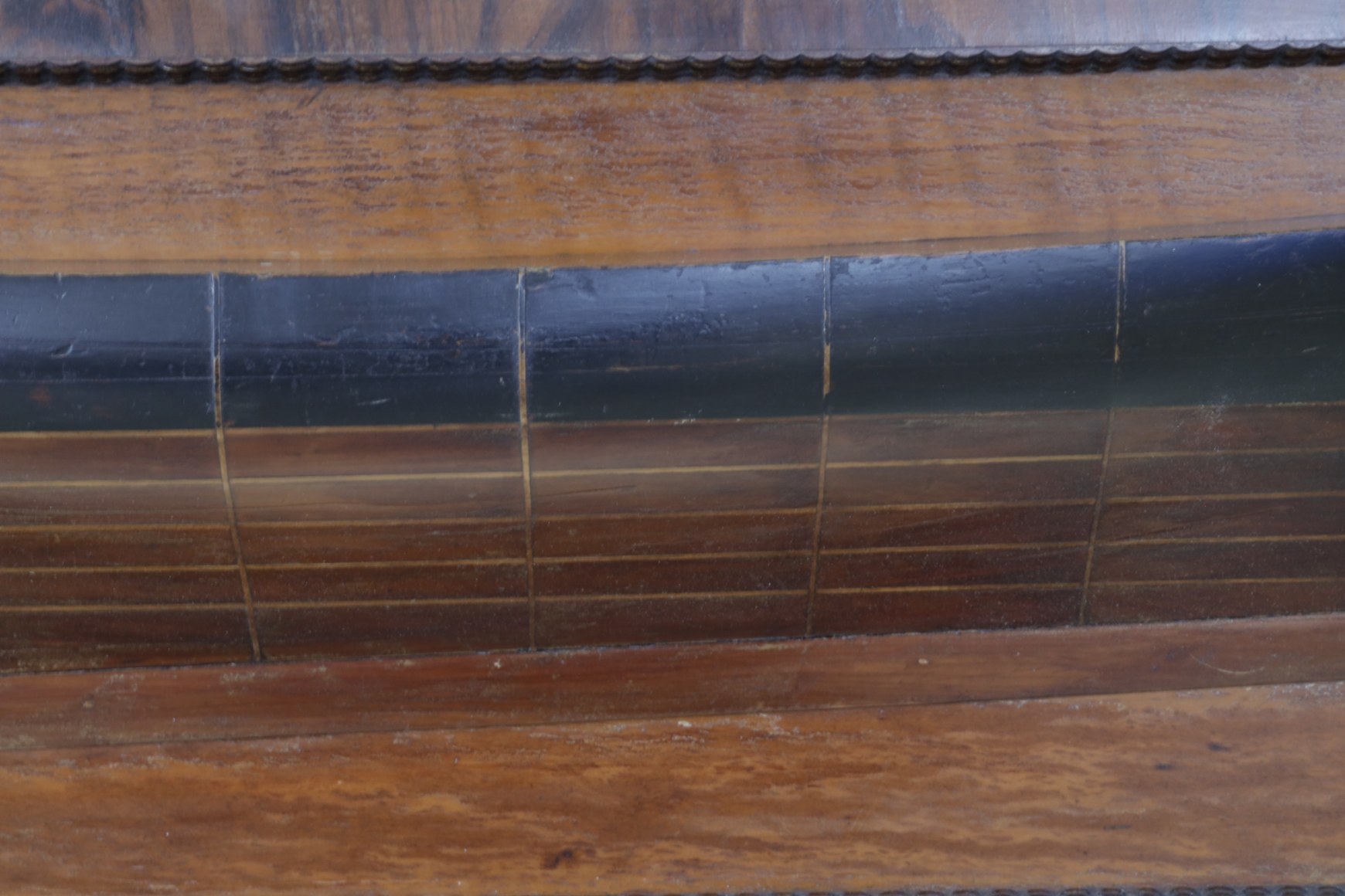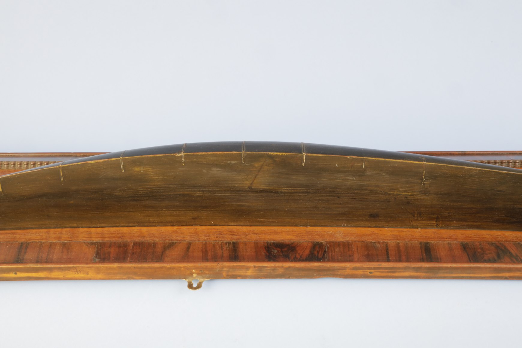 The model is mounted in its fancy original backboard. There is a highly figured piece of walnut or other hard wood that supports the model. There model's backboard has a very decorative rosewood applied wood veneered band that wraps the perimeter of the model, and it is about an inch and a half wide. This fancy molding that is raised where it meets the mounting board and angles down to the edge. Where the backboard molding meets the mounting around the perimeter is a beading thin molding strip and applied to the end of the backboard is a raised thin strip of wood molding.