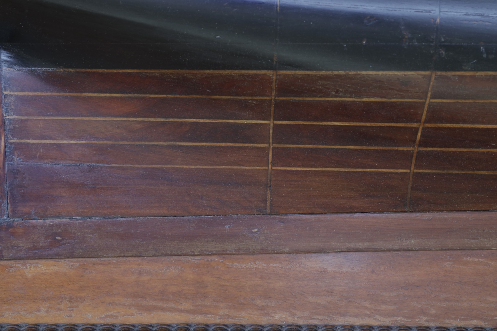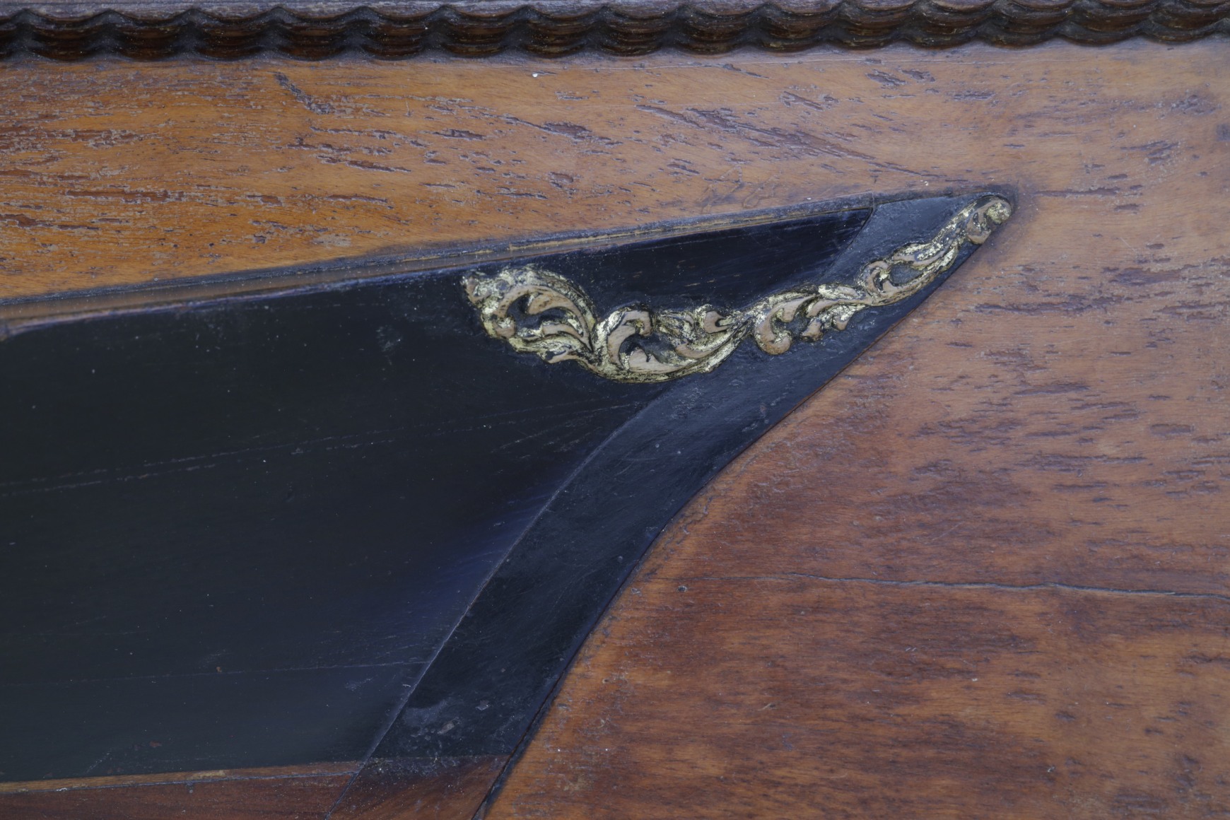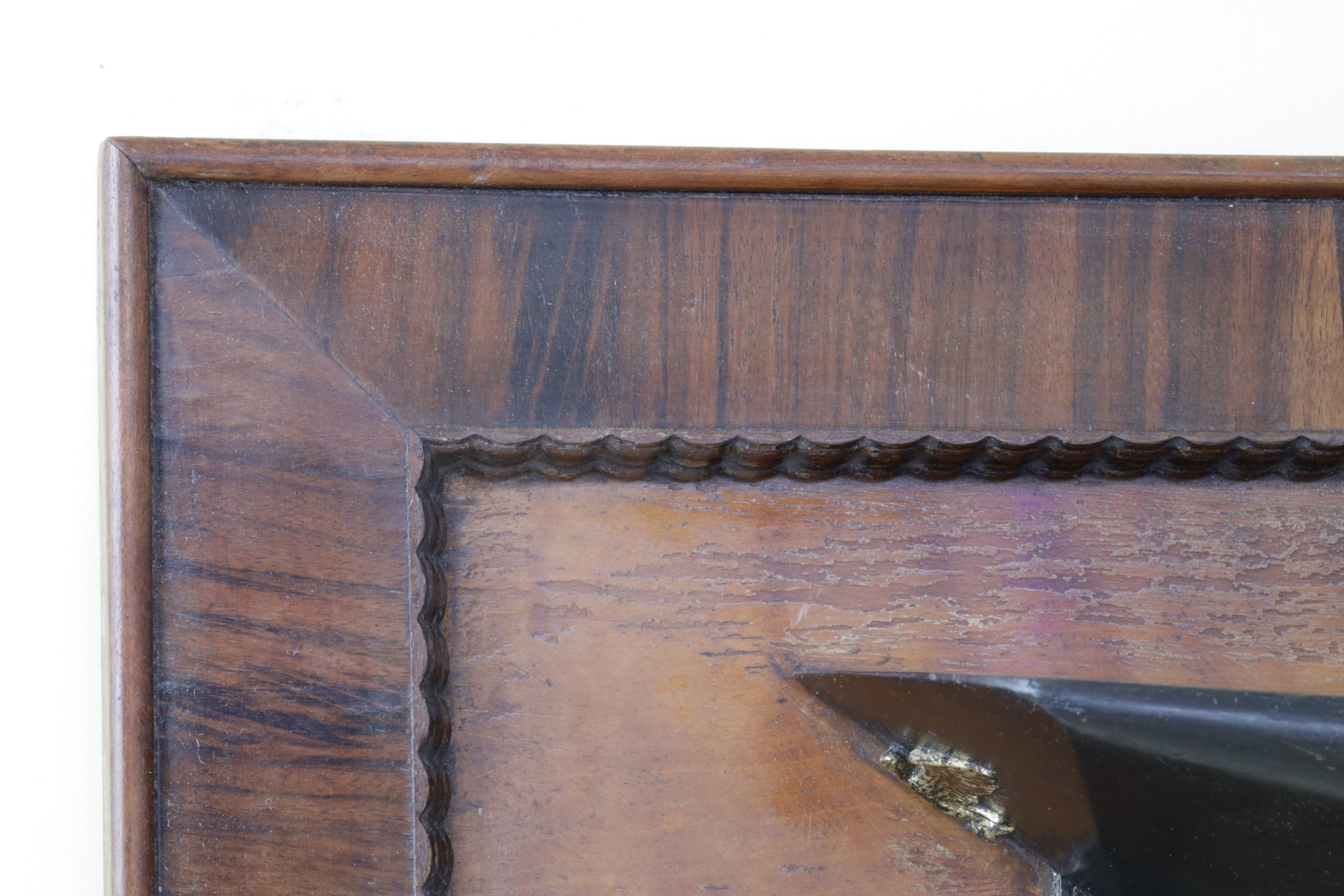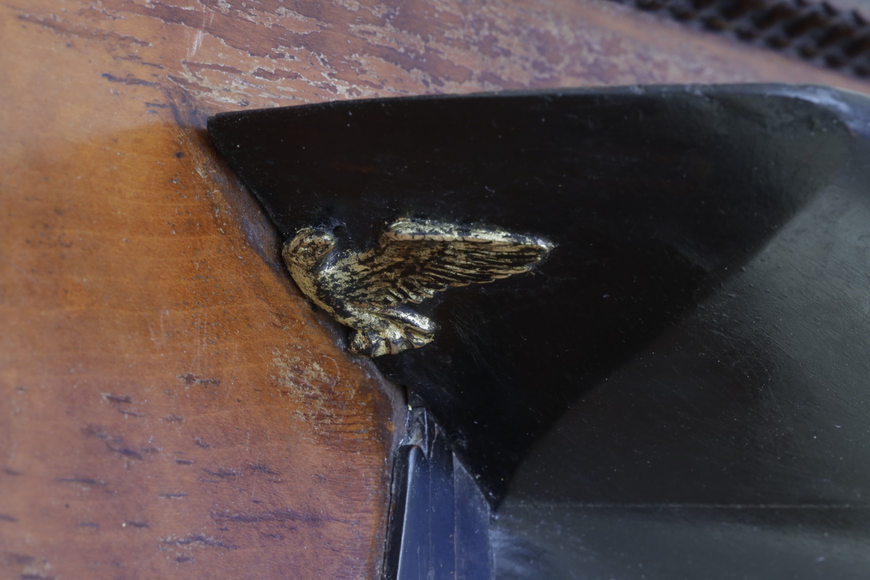 The model is mounted in its fancy original backboard. There is a highly figured piece of walnut or other hard wood that supports the model. There model's backboard has a very decorative rosewood applied wood veneered band that wraps the perimeter of the model, and it is about an inch and a half wide. This fancy molding that is raised where it meets the mounting board and angles down to the edge. Where the backboard molding meets the mounting around the perimeter is a beading thin molding strip and applied to the end of the backboard is a raised thin strip of wood molding.