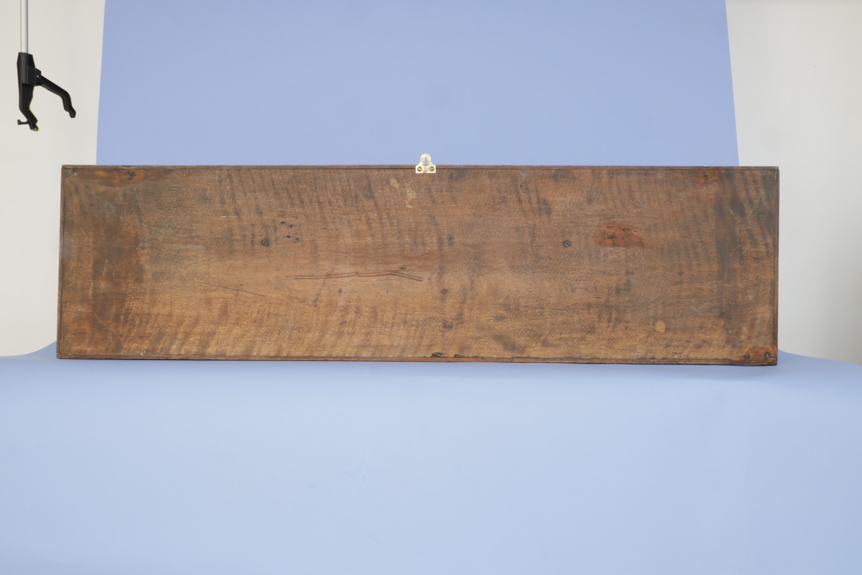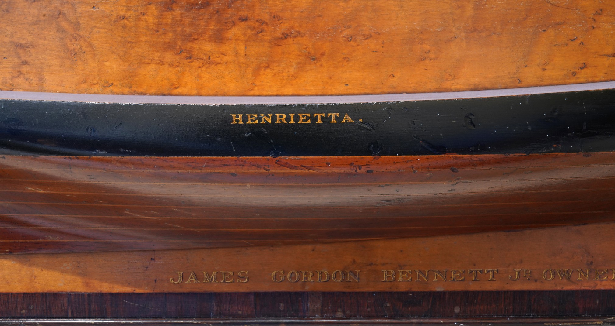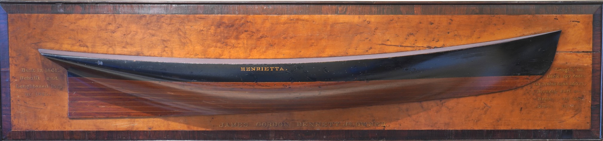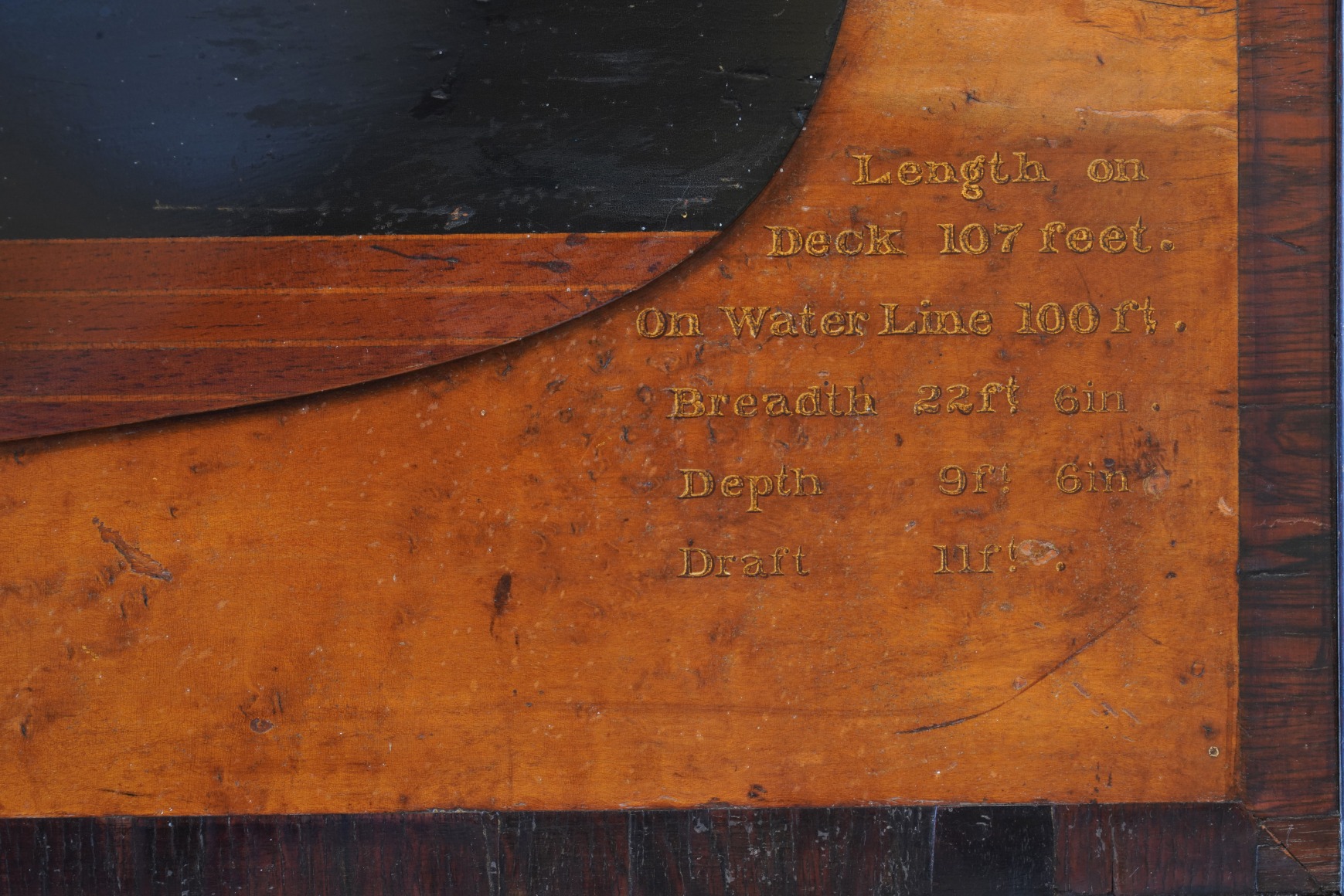 One of the most famous beautiful half hull half model’s that was created by George Steers the designer of “Yacht America” to be given to Queen Victoria that has been located at the Mariners Museum and Gardens in Newport News Virginia. This model is highly similar to the one described here except for two silver plaques that are applied to the Queen Victoria Presentation model. Both models are painted black above the water line and natural wood below. The “Victoria model also has the thin light contrasting wood slivers between the laminated lefts. Both models have raised curved trail boards, as well as the flame grain back board and the sloping rosewood trim around border. The Steer’s model measures 11Inches in Height and 55 inches in width and this models backboard measures height 12 ½ x 45 ½ inches in width. Thar actual measurement of the Steers hull is unknown at this time.