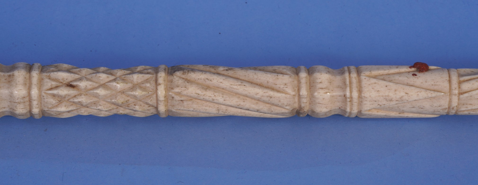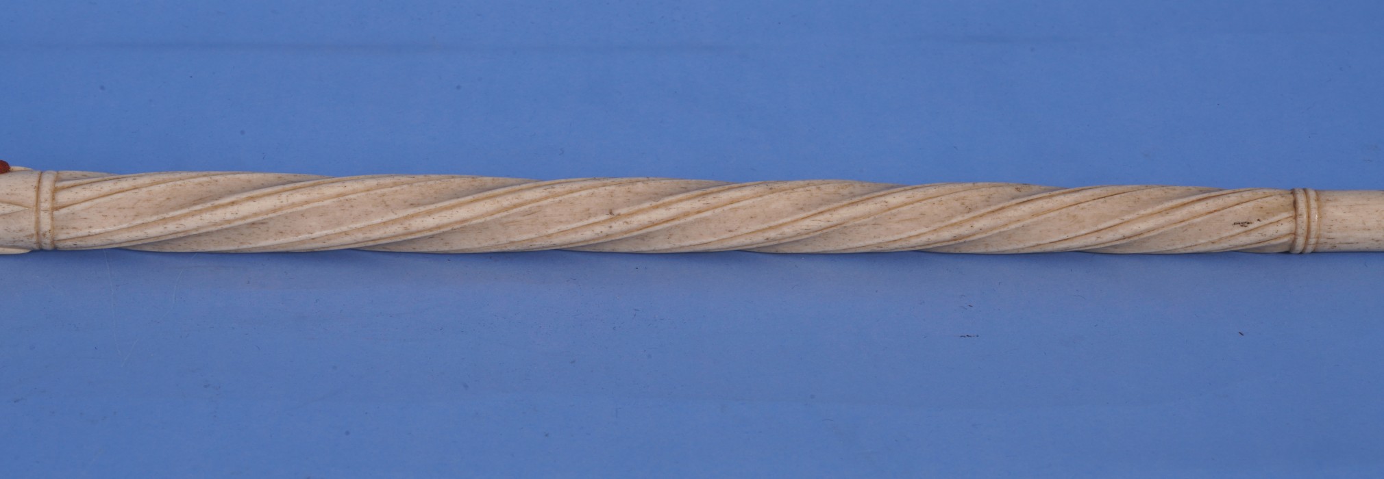 Condition. The cane is in excellent condition and has a mellow age patina. The shaft is straight and has no apparent warp as is normal condition issue with many scrimshaw canes. There is a small dark red drip of old sealing wax located on one of the raised arrows around the middle of the shaft.