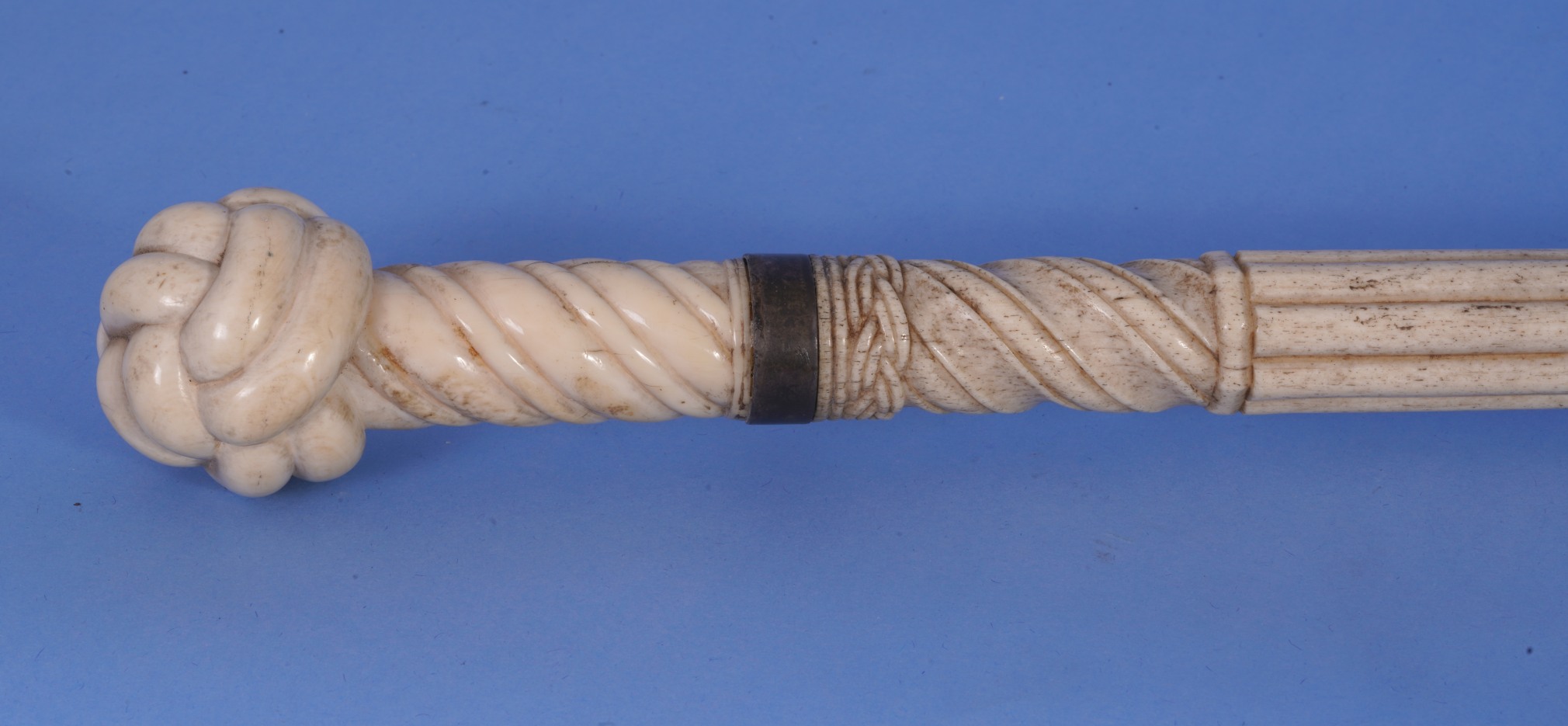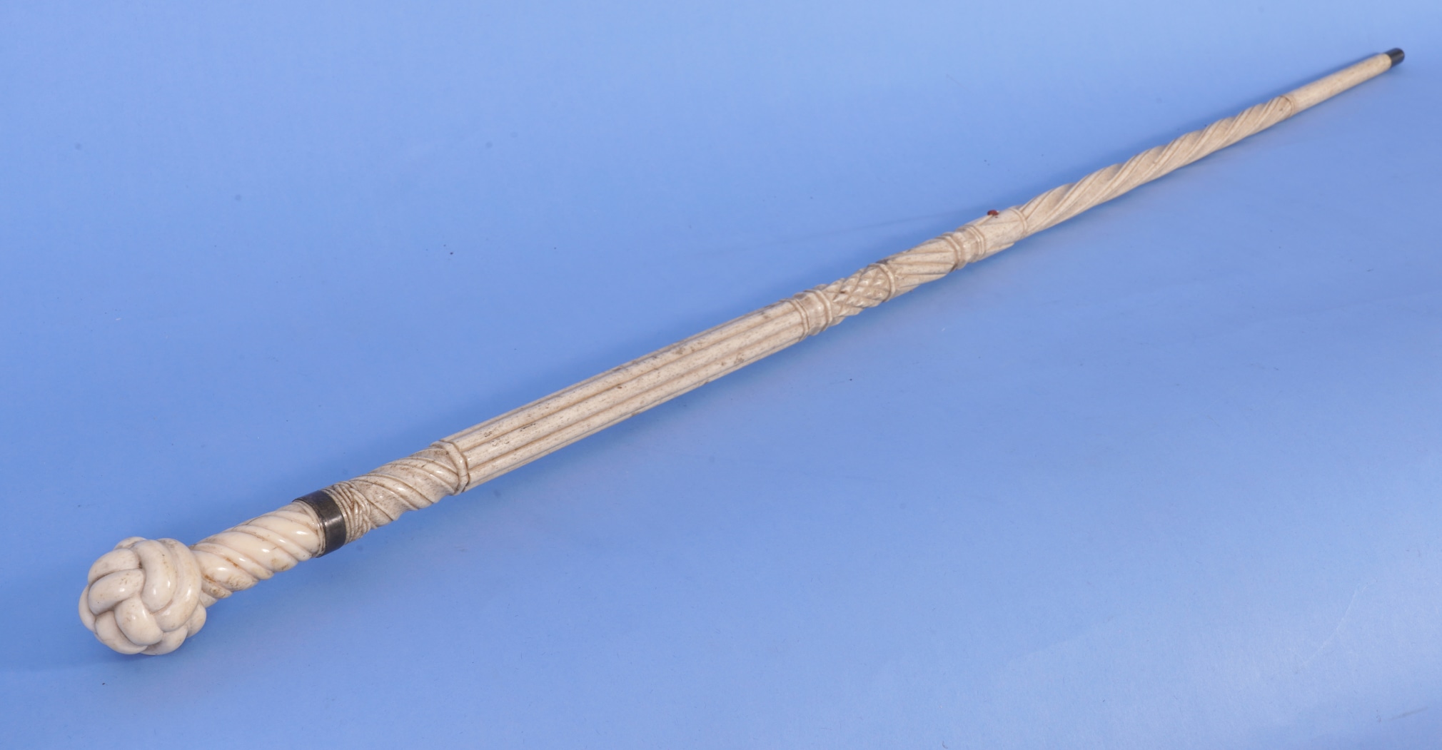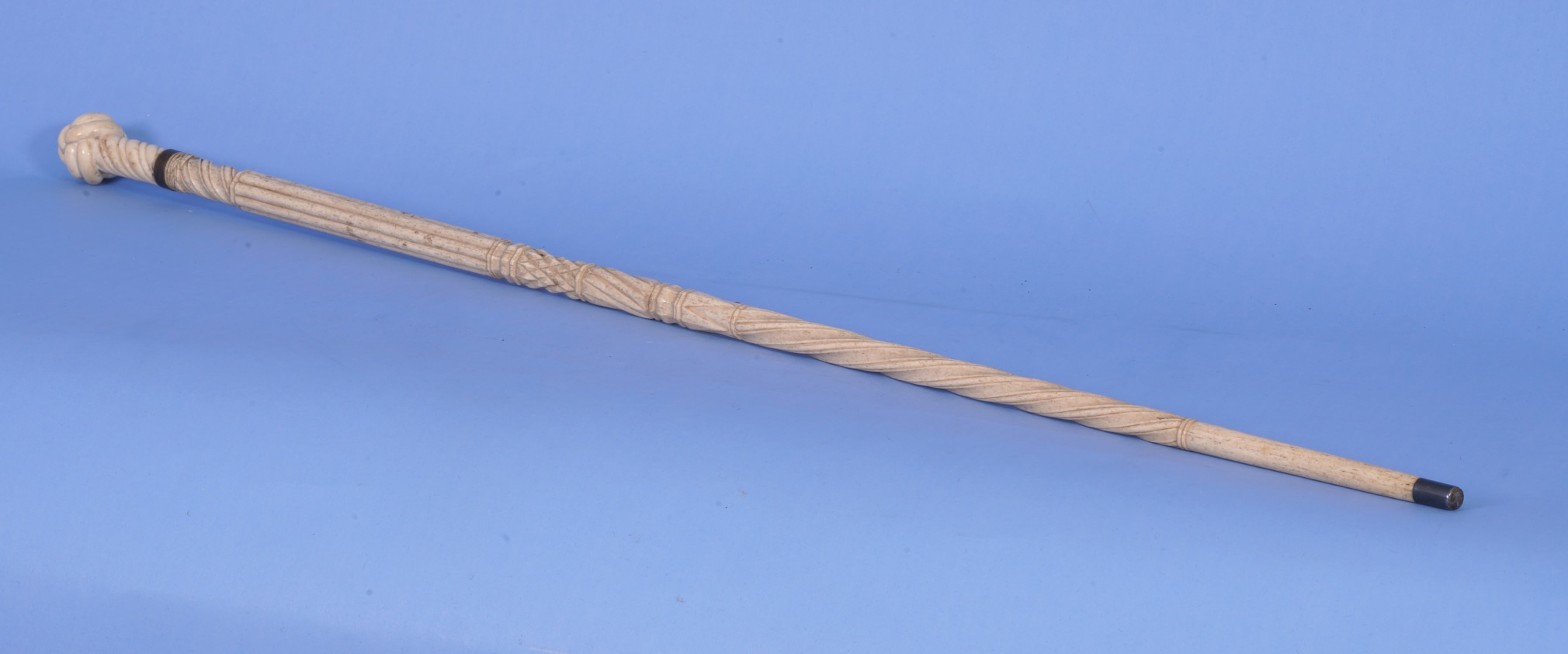 Fancy Carved Whale Ivory and Whale Bone Scrimshaw Walking Stick American circa 1860. The cane has a very finely carved whale ivory grip in the form of a monkey’s fist with a “'worm parcel and lay rope pattern” short shaft. There is a brass ring making the transition from the ivory grip to the whale bone shaft. The whale bone shaft is profusely carved and has 8 carving patterns or transitions and then terminates with a metal feral and tip. The top of the shaft has a carved Turks’ head pattern fallowed by a second “worm parcel and lay pattern”. There is a longer fluted section fallowed by a raised diamond narrow section. Below the diamonds is a short rope twist section and then a shorter raised arrow head carving and fallowed by a longer “worm parcel and lay” rope pattern and ending with a smooth final section. The cane has a gentle taper from the top of the grip to the tip of the feral. (WS-250)