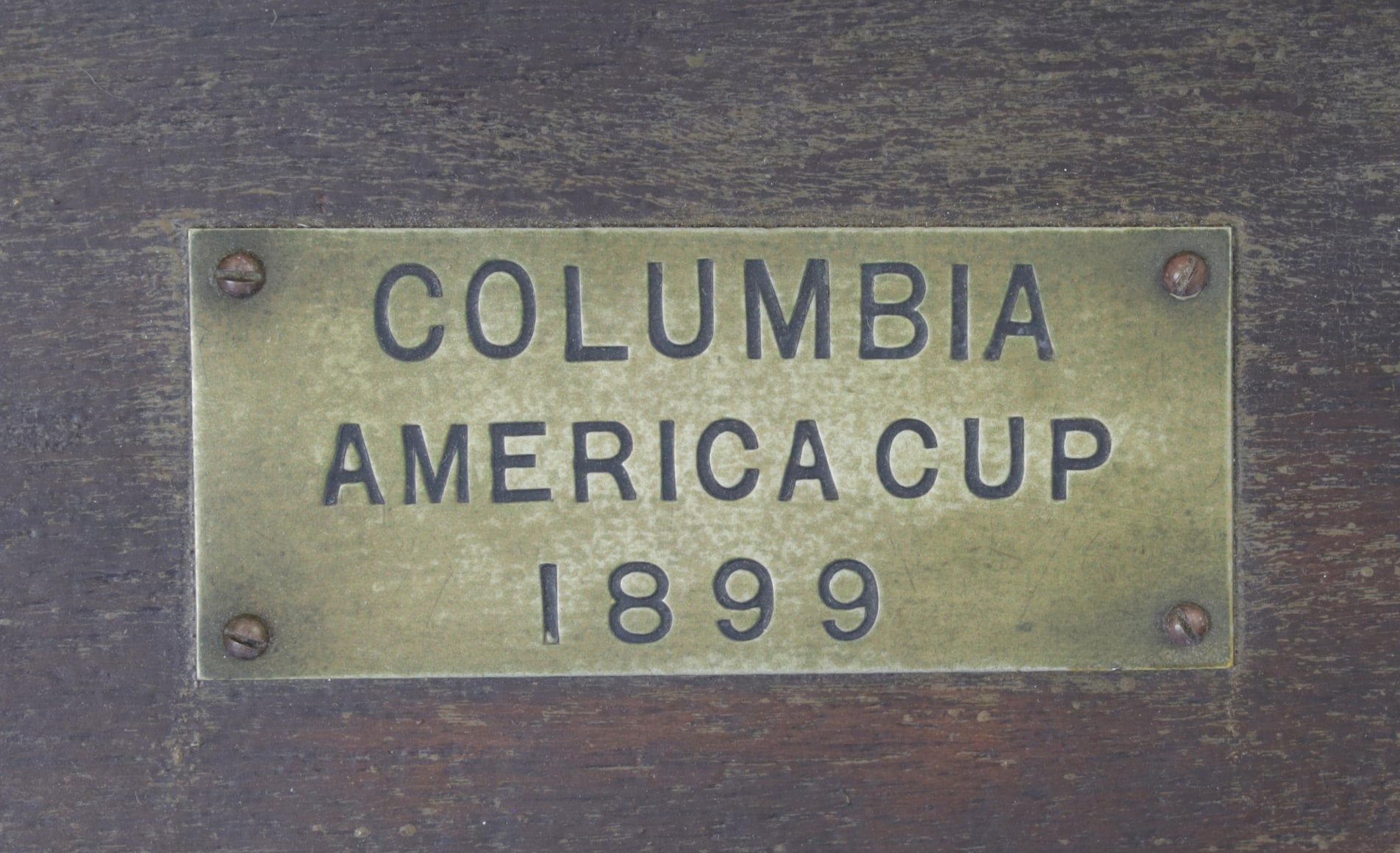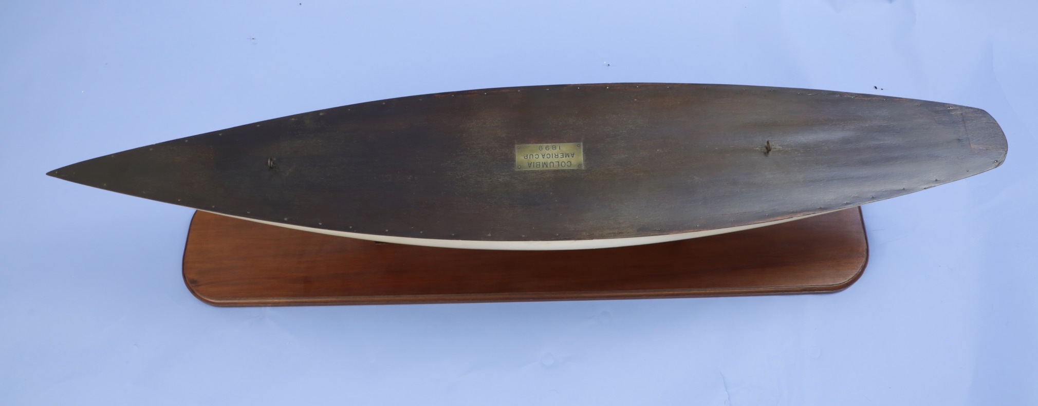 Attributed to Gustav Graham (Sweden/America, 19th/20th Century). Hull built up from the solid, which has been hollowed. Topsides painted white and the bottom bronze. Mahogany veneer deck with a brass plaque engraved "Columbia America Cup 1899". Displayed on a simple mahogany stand, supported at the keel and with a bow post.