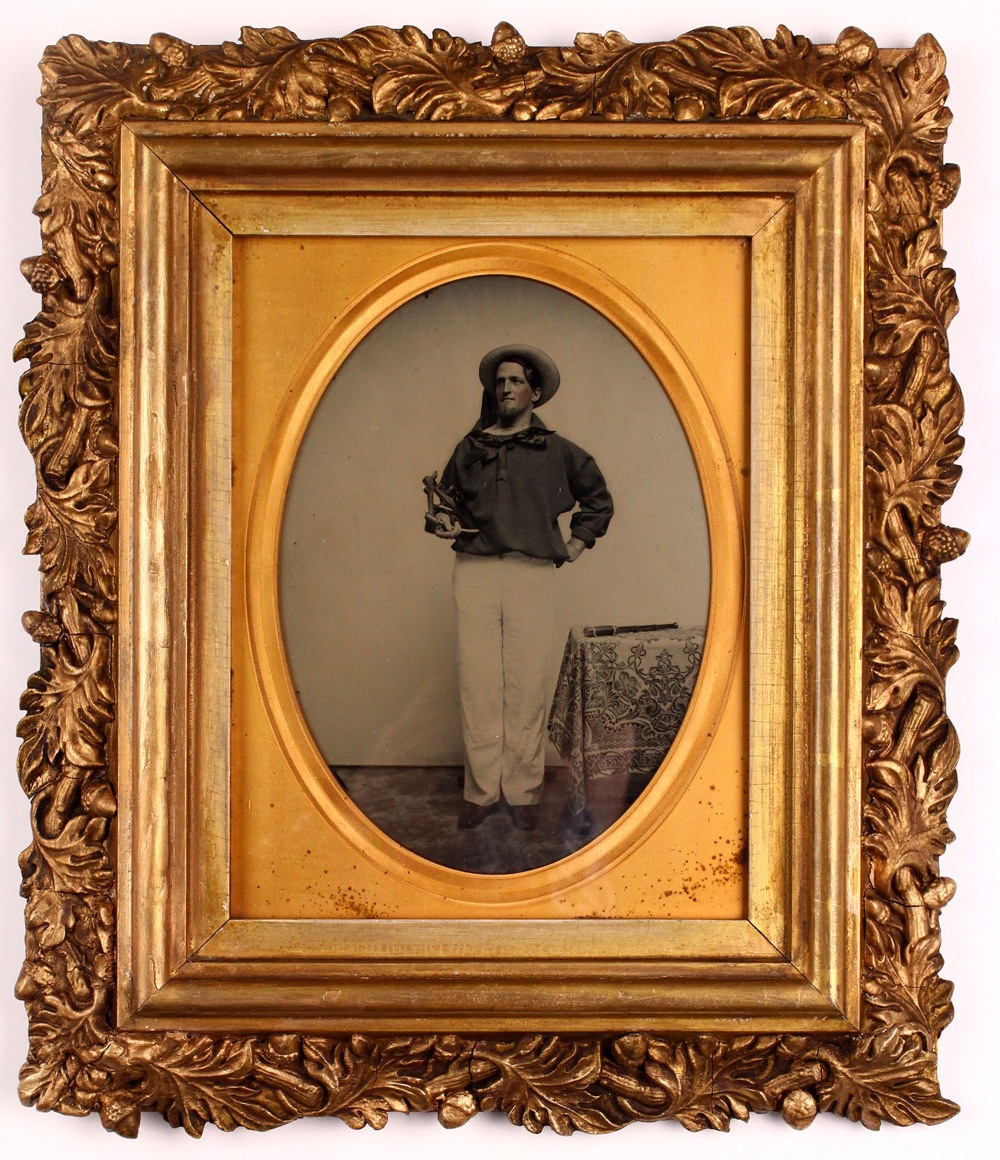 Note 1: George W. Dodge age and birthdate unknown was a green-hand on the ship Arnolda of New Bedford was captained by Captain Richard D.Wood 1848-52. Dodge was also either 4th mate or steward on the New Bedford Whaler Gay Head 1852-56. It is likely this picture was taken in New Bedford after he returned from this voyage. The ambrotype retains its orignal mat and gold leaf frame. The frame has a stepped liner and the outer frame is beautifully carved with a leaf and acorn pattern.