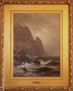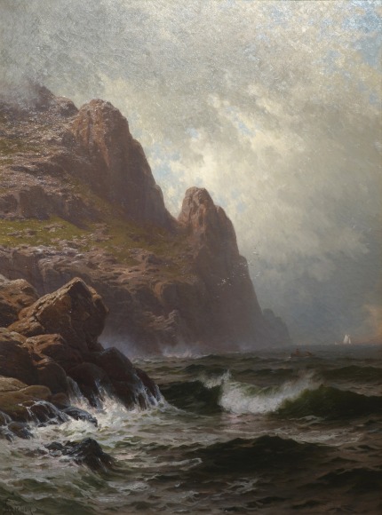 Oil on canvas, depicting the mountainous shoreline and rocks of Grand Manan, signed lower left: "A T Bricher", circa 1882. This painting is a powerful example of one of Bricher's dramatic Grand Manan seascapes. The surf is breaking on the rocks in the left foreground. Along the cliffs in the distance, one sees surf breaking but there is the additional quality of a spray mist rising from the surf along the lower edges of the rocky cliff. Rising up the cliff, there are patches of green. The sky is also very dramatic and at the center above the peak in the cliff is a break in the dark clouds with patches of light and blue sky. To the right of the cliff is a flock of gulls caught in the same light. In the distance in the water is a small open boat with a sailboat beyond. (PA-400)