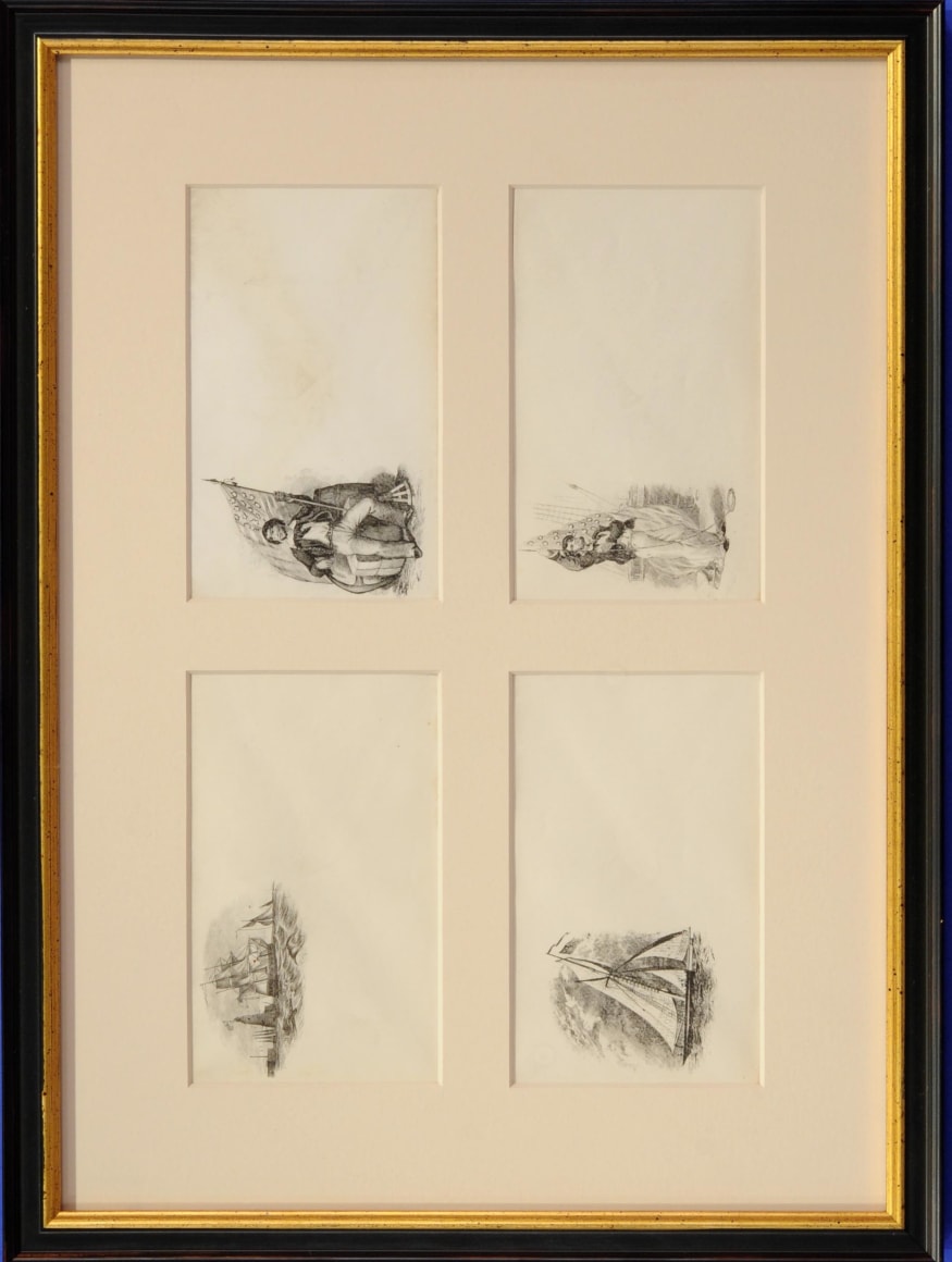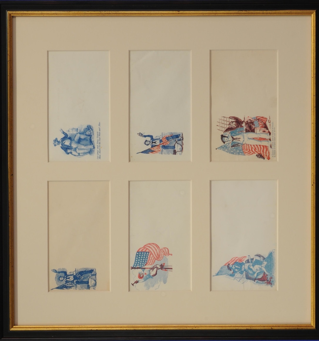 Group of ten (10) engraved nautical and patriotic envelopes, circa 1860. Four envelopes are black and white with two showing images of boats and the other two are images of sailors holding American flags. These four envelopes have been archivally matted and framed as a set. There is a second set of six envelopes, all showing patriotic images of sailors. These envelopes are also archivally mounted and framed. (PR-1182)