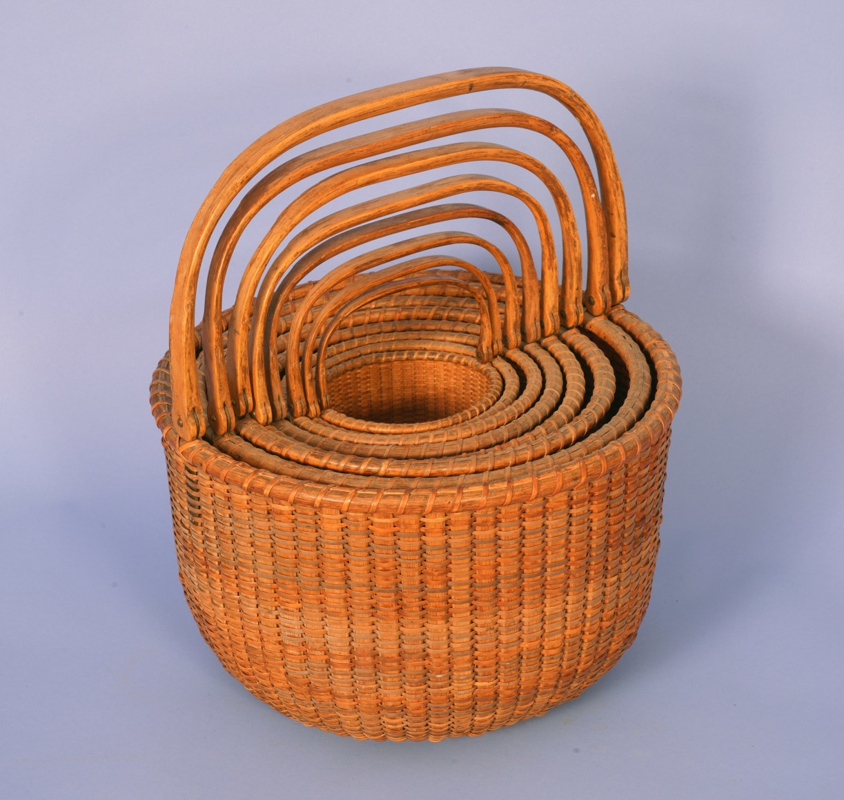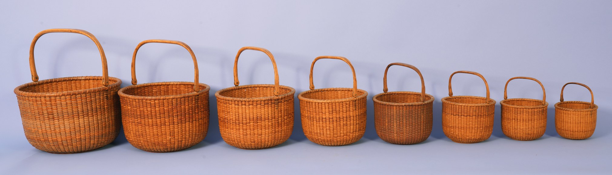 Extremely rare and important nest of eight Nantucket baskets by Davis Hall. Seven of the eight basket retain Davis Hall’s original paper labels which are affixed the back of the bottom of each basket. All of the baskets have beautifully shaped tapered oak swing handles with brass hinges. All of the baskets have round mahogany bases with two concentric circular tunings on the top surface. The style and shape of the handles and tuned bases is very standard amongst most known Davis Hall baskets. The baskets have oak ribs and rims. The cane wevers that lace between the oak ribs are woven very tightly and uniformly. All of the handles are attached to the baskets with brass fittings that are woven into the sides of the basket. The metal ears allow the handles to swing 180 degrees. The quality of each basket is excellent given Davis Hall was one of the most talented makers. All of the baskets have a true round shape and straight sides. When nested the baskets fit inside one another very tightly and the height when nested is almost even on all eight baskets at the top. (FA-1082)