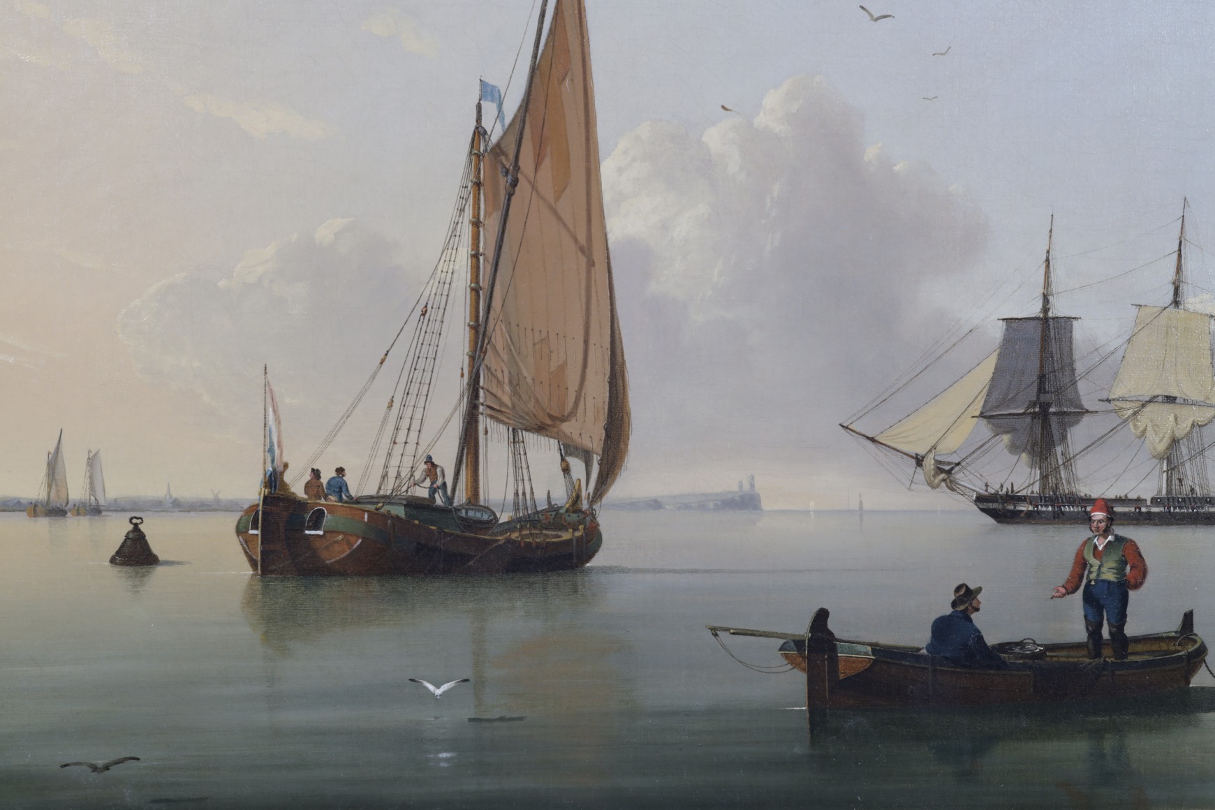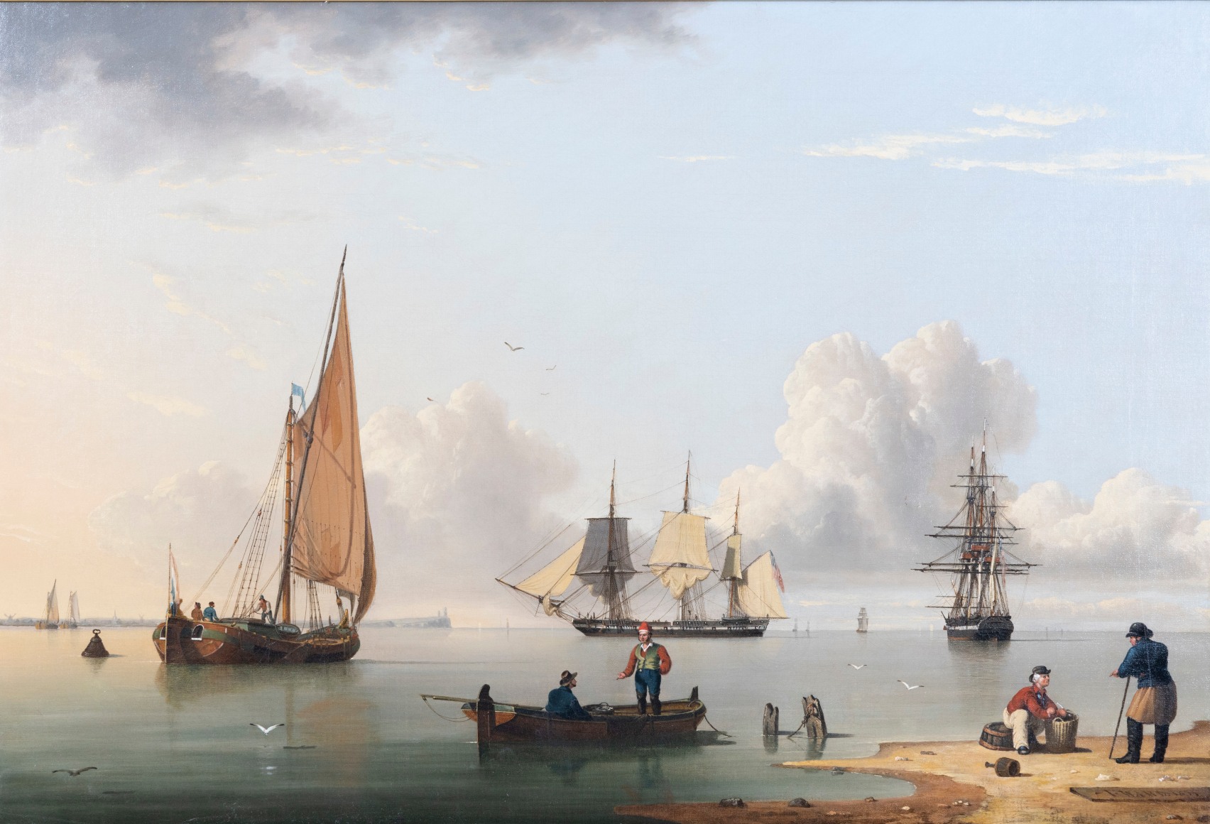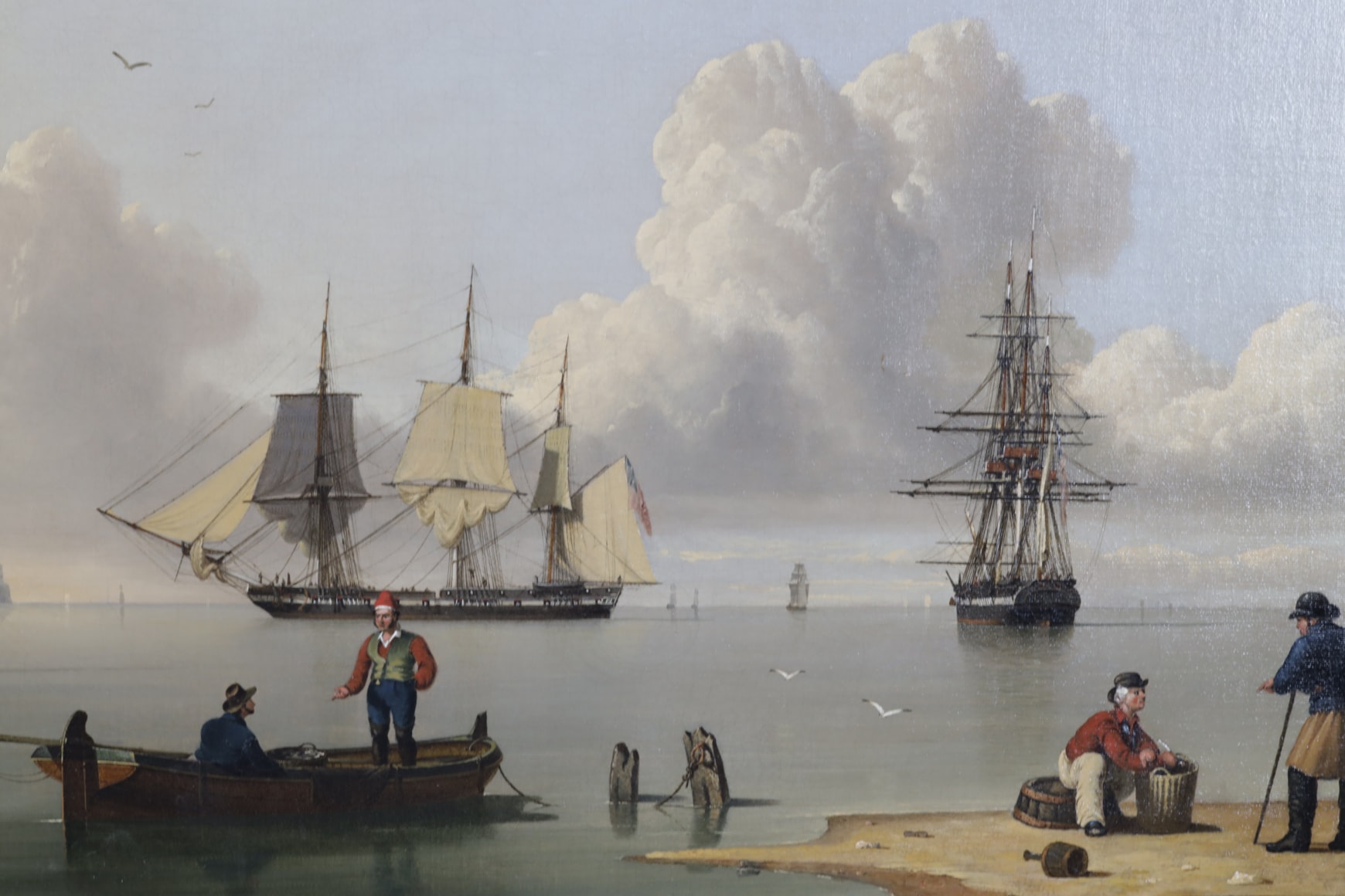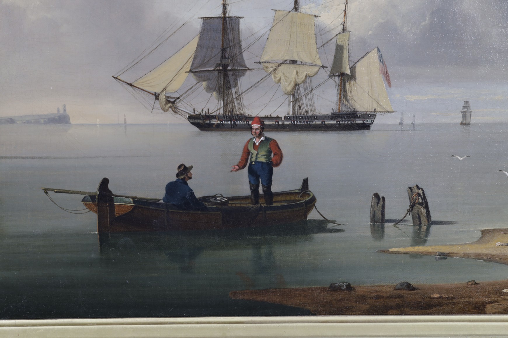 Oil on canvas, titled: "A Frigate Offshore", signed and dated lower right J. Ward 1831 on a floating board.The painting is a wonderful seascape with shipping. In the foreground to the right is a small area of beach. There is a seated figure handling objects in a basket while apparently in conversation with a standing fisherman holding a cane. To their left is a rowing craft apparently at anchor. In the boat there is one figure seated and a second figure is standing, and both figures appear to be having a conversation. The detail and colorful clothing which the figures are wearing are painted with outstanding detail. At the center horizon is a frigate in a hooved-to position. A stern view of the same vessel is shown to the right. To the left is a latine rig fishing vessel. Along the left hand side of the horizon is a spit of land with twin lighthouses at its termination. This point of land is known as Spurn Head which marks the entrance to the River Humber which leads to Hull. In the background there are various vessels and birds. The detail and crispness of this painting displays the mastery of John Ward. To the bottom right is a board laying on the beach which bears his signature and the date 1831. (PA-244)