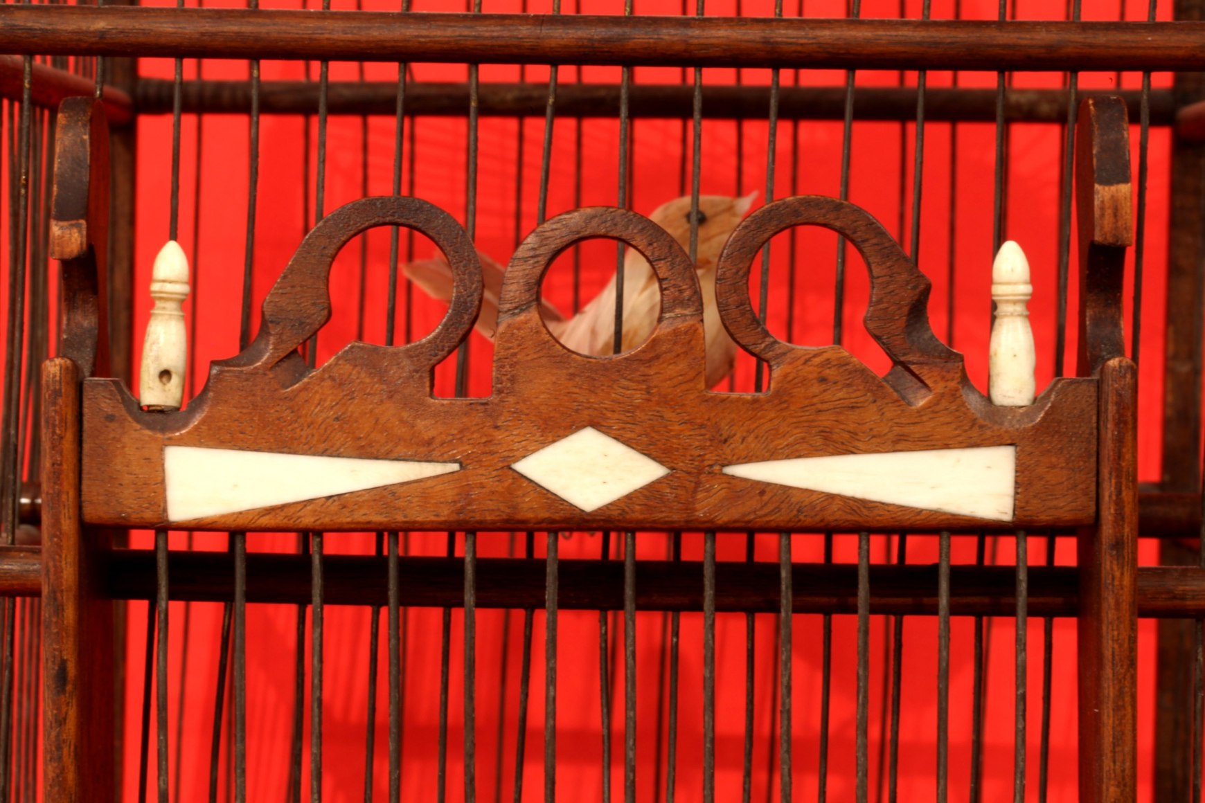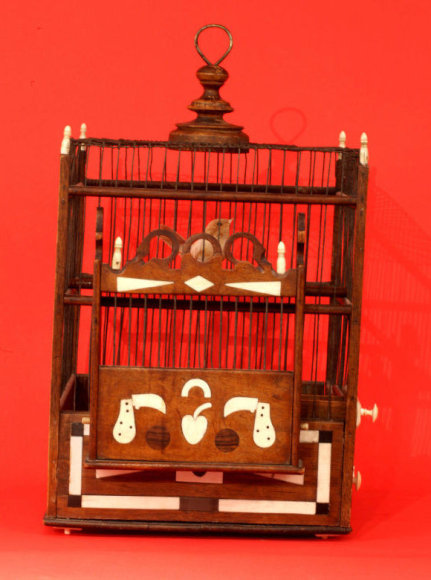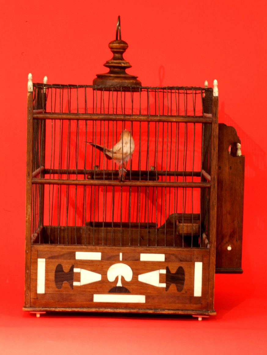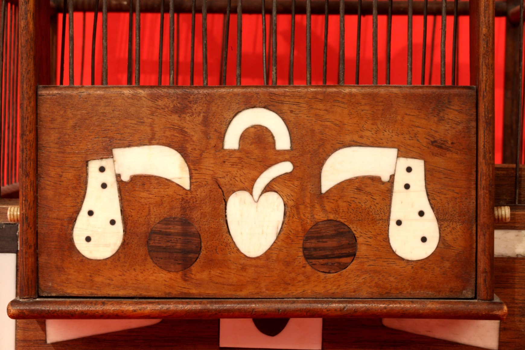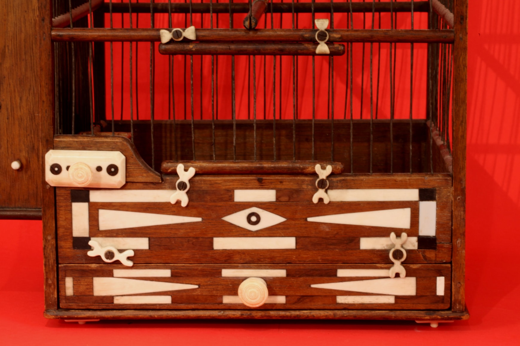 Extremly rare and important scrimshaw bird cage, dated 1862 probably made in New Bedford MA or on board a whale ship. The wire enclose square cage with pegged construction is ie nlaid with whale ivory, whalebone, baleen and exotic woods. Mounted to the side of the cage on the wire is a removable compartment with carved swan heads , inlaid in cherry , skinning and chopping knife designs . To the left is a small pullout feed draw with ivory pull and below is an inlaid ivory and bone pull out clean-out draw which has whalebone turn-kuckle looks. The top of the cage has whalebone finials and the bottom has bone feet. The base is inlaid with a compass rose and the intials "EB" and "PL" and is dated 1862. There is a bone square shaped signal flag with black square at the center., this is the maritime signal for "engines full speed astern". All four sides of the bird cage have scrimshaw inlay decorations. At the center of the top of the cage is a bulbous turned finial with a metal hanging or carrying ring. Running accross the cage near the middle is a wood dowel with a realistic looking small bird with talons and feathers perched near the center. (SC-1049)