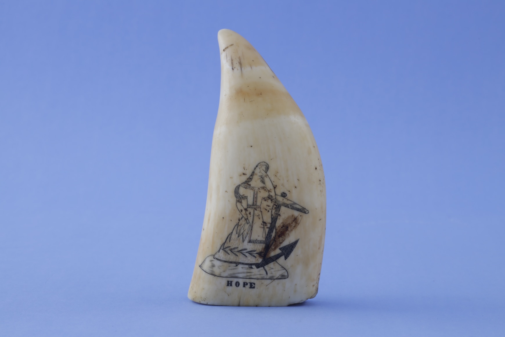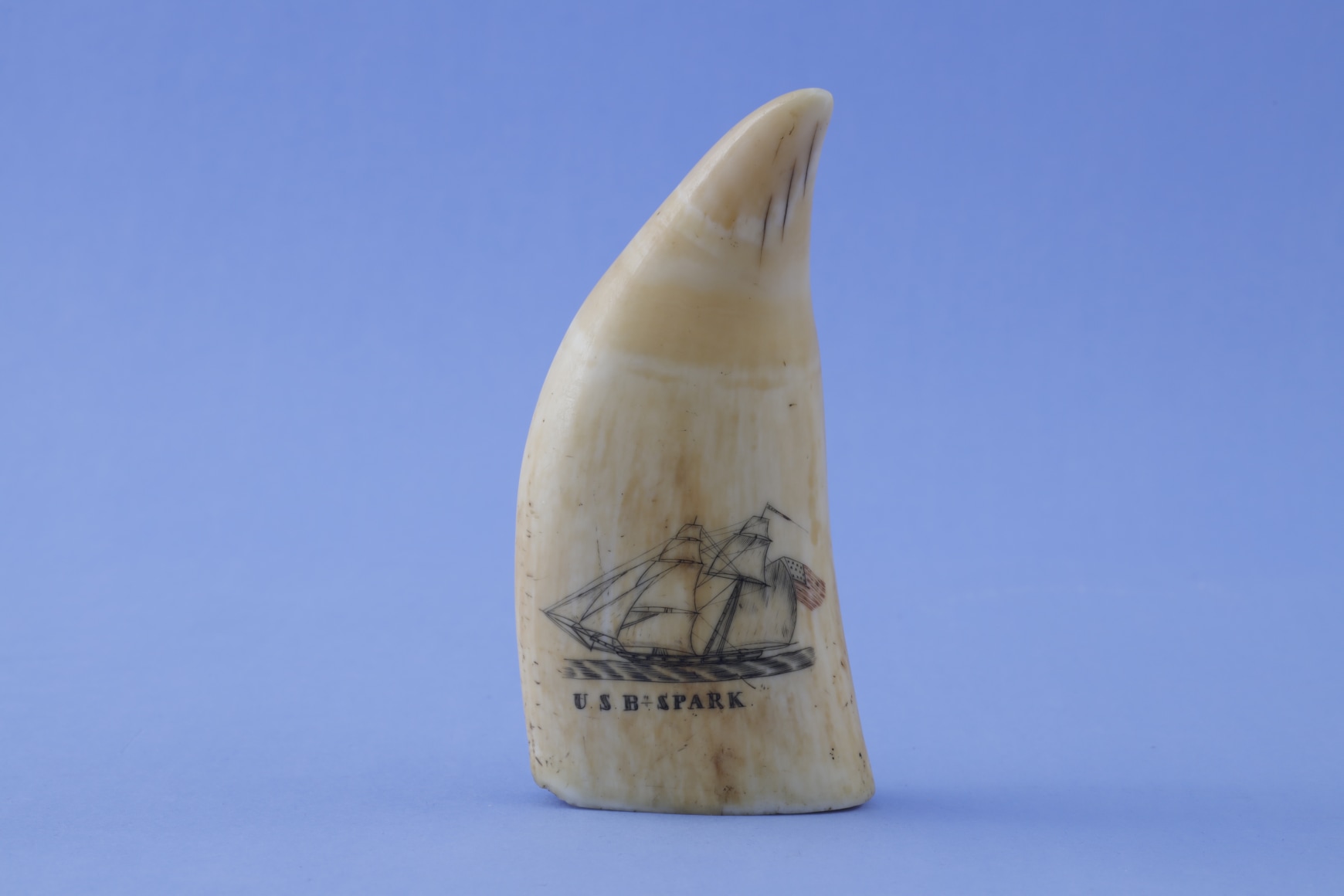 Scrimshaw Polychrome Whales Tooth depicting in the Obverse an Armed Brig under sail with a large polychrome American flag flying from the gaff and a banner from the peak of the main mast. Below the vessel is a band of striped stylized water. Below the water is the test "U.S.B. SPARK". The quality of the engraving is excellent. The revers is titled "Hope" below a round base With a standing women leaning on a tall anchor in a long fancy dress with her right hand near her face.