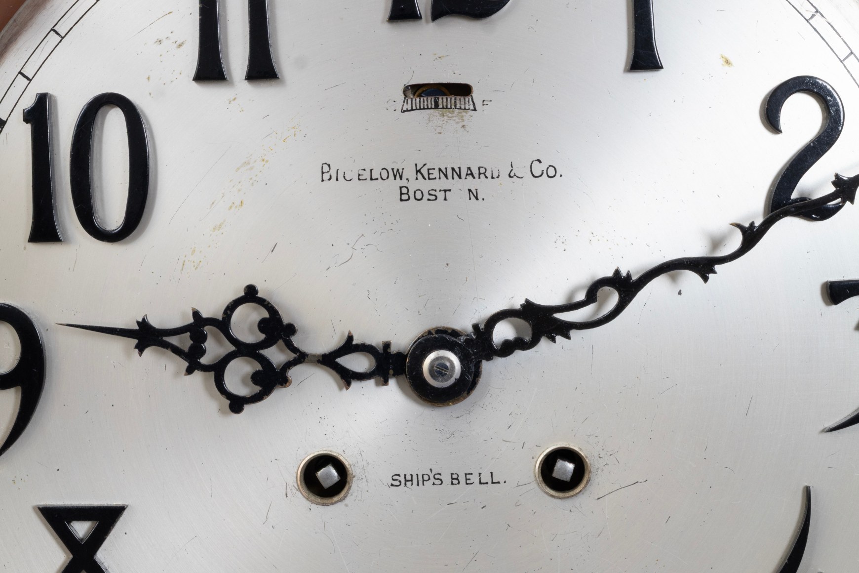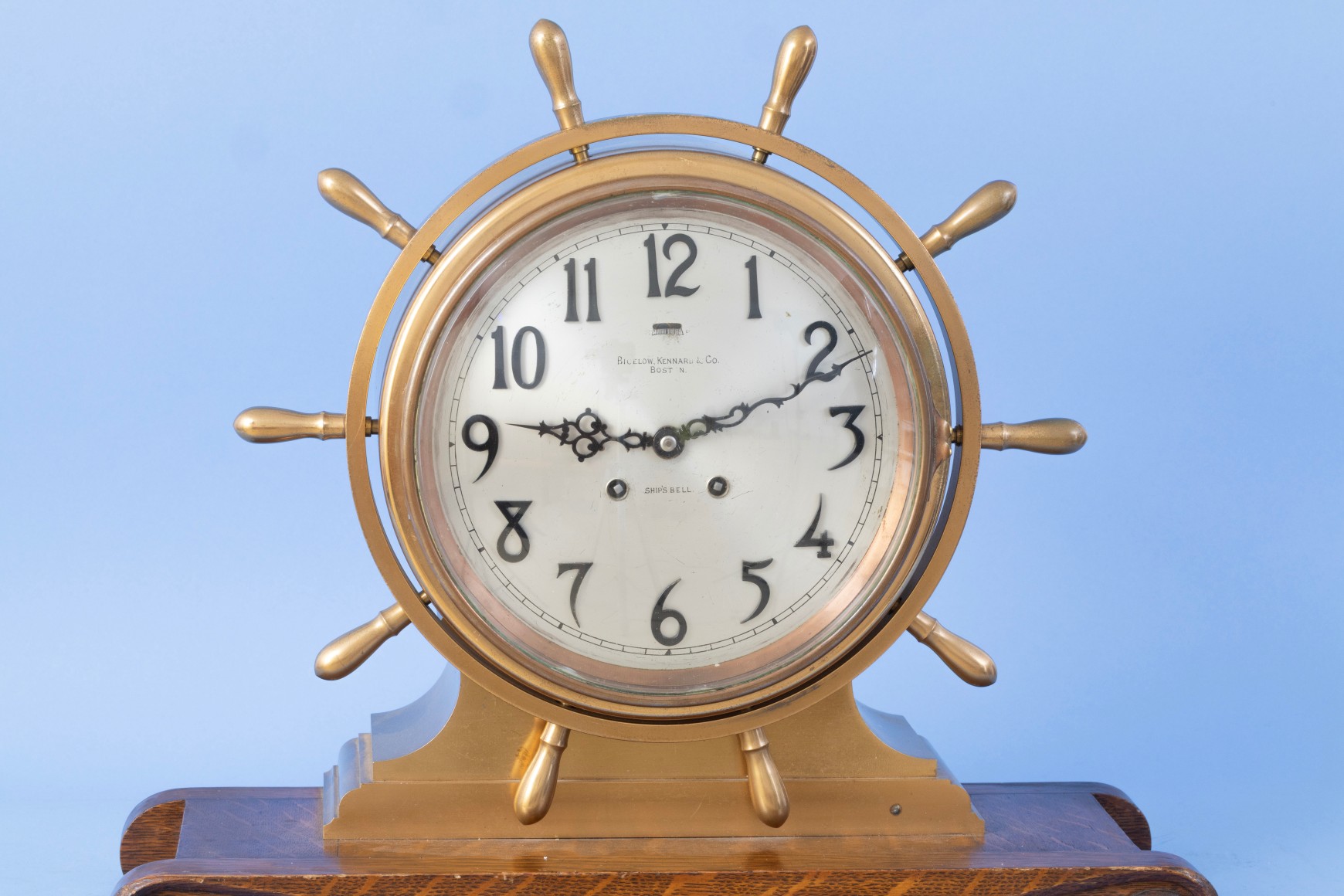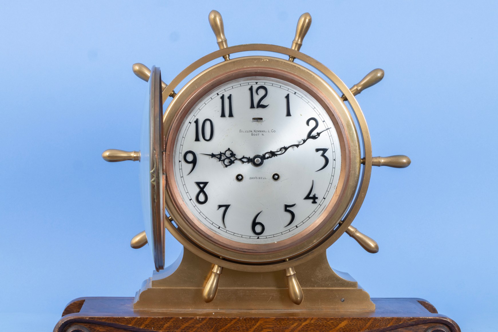 Eight Inch Chelsea Shelf Clock singed on the dial with the retailer's name "Bigelow, Kennard & Co. Boston, and signed "Ship' Bell" between the winding posts. The movement is "Chelsea Clock Company, Boston U.S.A.Patented Oct. 5, 1899, Sept. 18, 1885,, June 9th 1900, Also Patented in Great Britain May31, 1900. The Possibly Unique Chelsea Ship Wheel Clock with 8 Inch Dial and Time & Strike on Scroll Carved Oak Base. Movement and base have matching numbers #01828. The clock was sold by Chelsea on March 27, 1913. This rare and possible unique form of Chelsea eight inch clock has a cast brass case which sits on a nicely shaped brass mount which in turn sits on a stained oak base with scroll- work feet. The clock has a hinged bezel. The glass is doomed and not flat like all of the other Chelsea shelf clocks. The clock has a 8 Inch silver dial with applied brass numerals and fancy pierced hands. The back of the case has a round hinged back plate that has a fancy pierced pattern which allows the sound to eminent out. The bottom of the base has a repair label with the name Bradford Cheney. "Categorized under Clock Repair and Parts. Our records show it was established in 1982 and incorporated in Massachusetts. Current estimates show this company has an annual revenue of 42262 and employs a staff of approximately 1." This label show he repaired the clock in on 4/83.