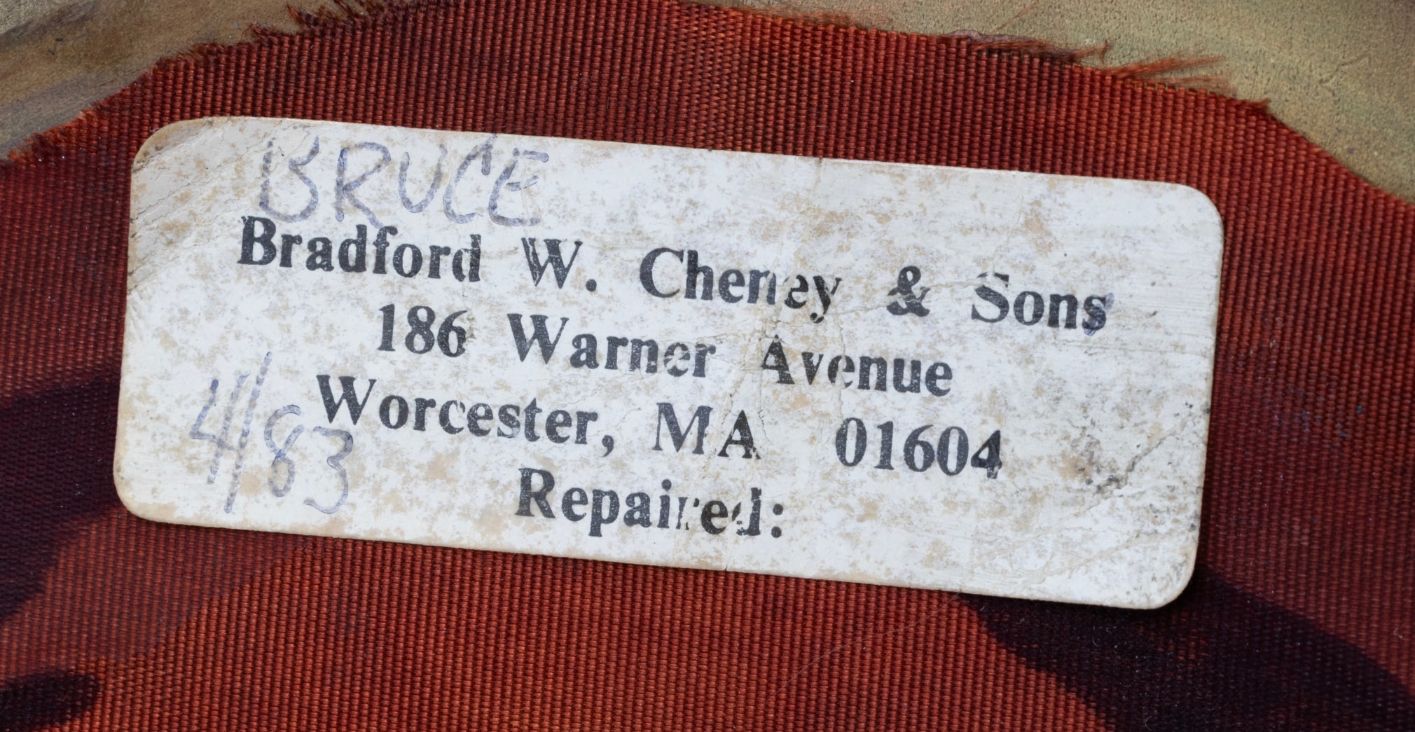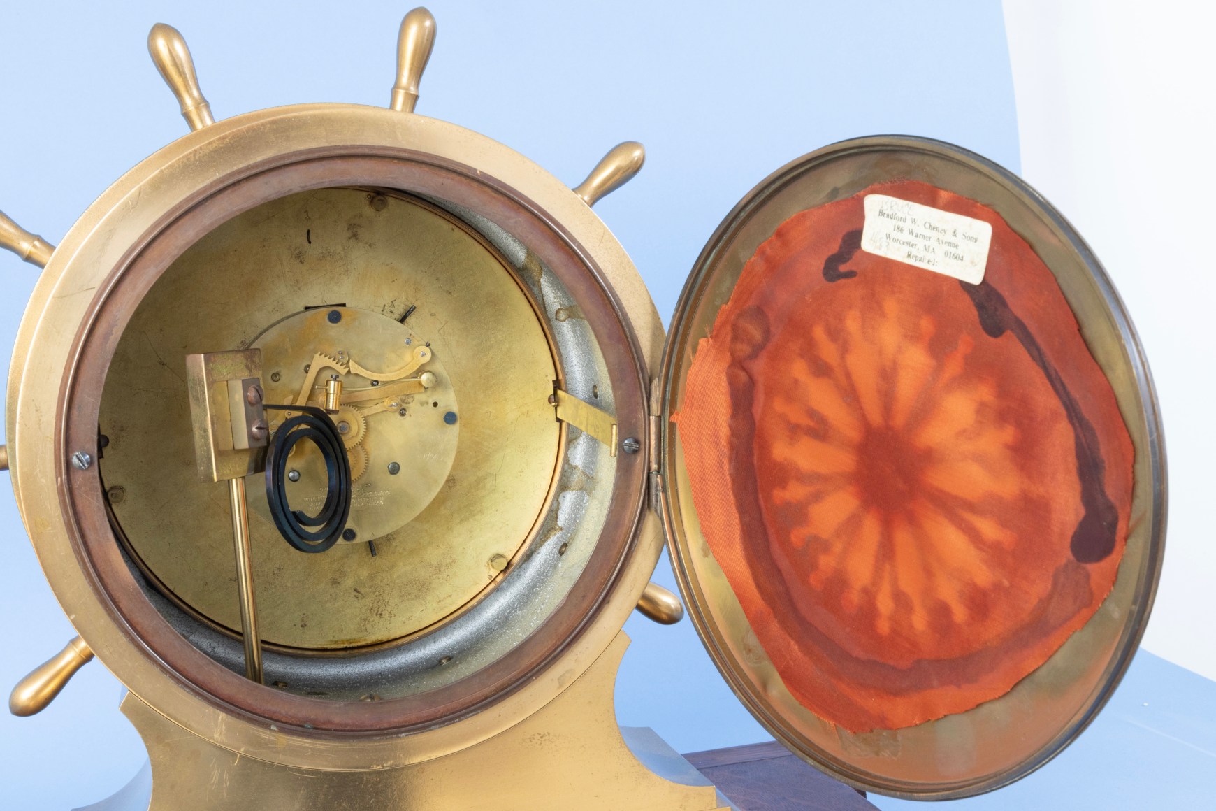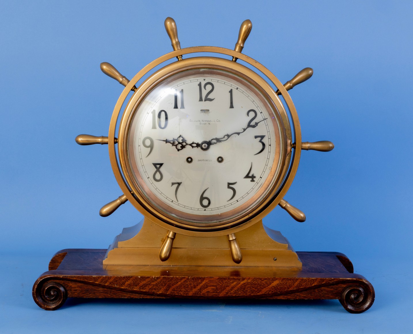 Eight Inch Chelsea Shelf Clock singed on the dial with the retailer's name "Bigelow, Kennard & Co. Boston, and signed "Ship' Bell" between the winding posts. The movement is "Chelsea Clock Company, Boston U.S.A.Patented Oct. 5, 1899, Sept. 18, 1885,, June 9th 1900, Also Patented in Great Britain May31, 1900. The Possibly Unique Chelsea Ship Wheel Clock with 8 Inch Dial and Time & Strike on Scroll Carved Oak Base. Movement and base have matching numbers #01828. The clock was sold by Chelsea on March 27, 1913. This rare and possible unique form of Chelsea eight inch clock has a cast brass case which sits on a nicely shaped brass mount which in turn sits on a stained oak base with scroll- work feet. The clock has a hinged bezel. The glass is doomed and not flat like all of the other Chelsea shelf clocks. The clock has a 8 Inch silver dial with applied brass numerals and fancy pierced hands. The back of the case has a round hinged back plate that has a fancy pierced pattern which allows the sound to eminent out. The bottom of the base has a repair label with the name Bradford Cheney. "Categorized under Clock Repair and Parts. Our records show it was established in 1982 and incorporated in Massachusetts. Current estimates show this company has an annual revenue of 42262 and employs a staff of approximately 1." This label show he repaired the clock in on 4/83.