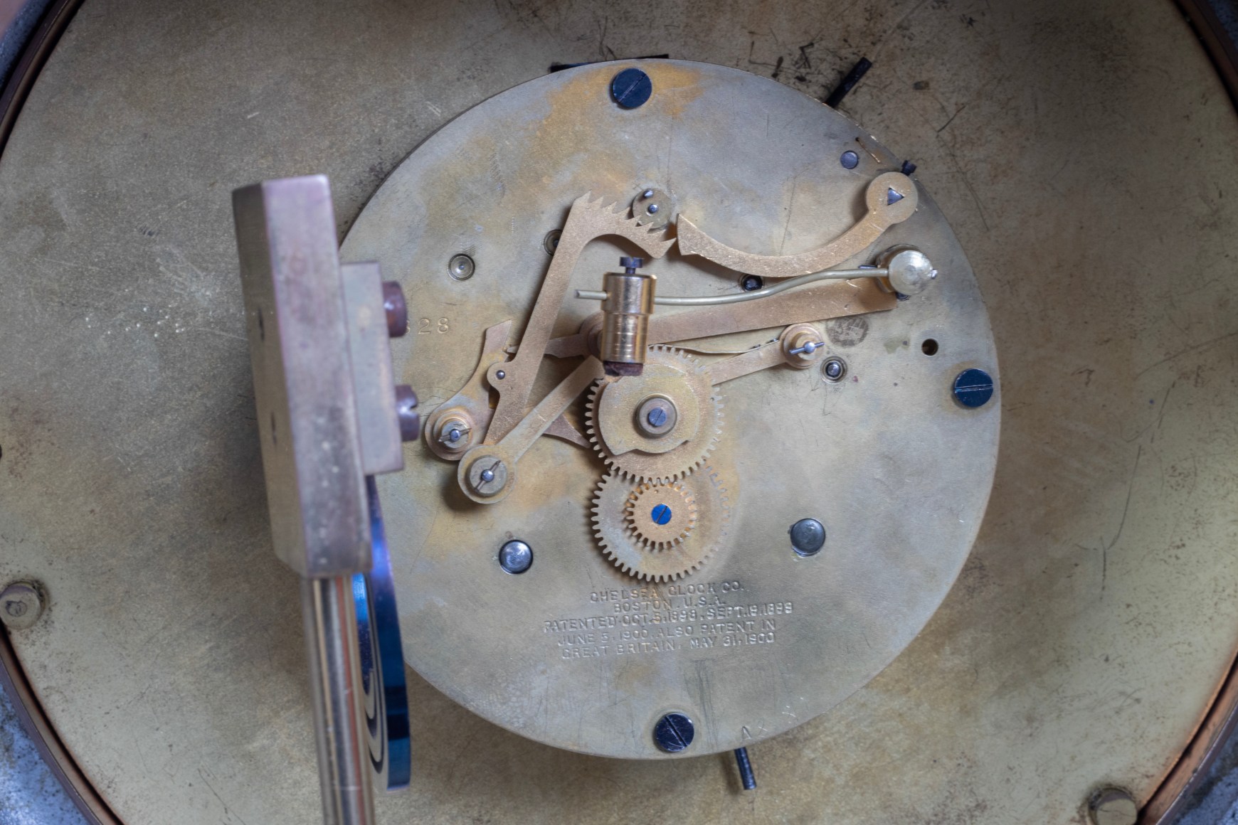 "This is the only example I have ever seen. It is not listed in any Chelsea catalog. It does have a similar base to the Mahogany Pedestal Clock offered in the 1911 Chelsea Catalog. It was sold on 3/27/1913 to Bigelow, Kennard & Co. Research shows the clock described in factory records to be, 8” Special Copper Bronze Pedestal Wheel Ship’s Bell. This description matches the clock exactly. The combination of outstanding original surfaces and only known example make for an exceedingly rare and desirable clock."