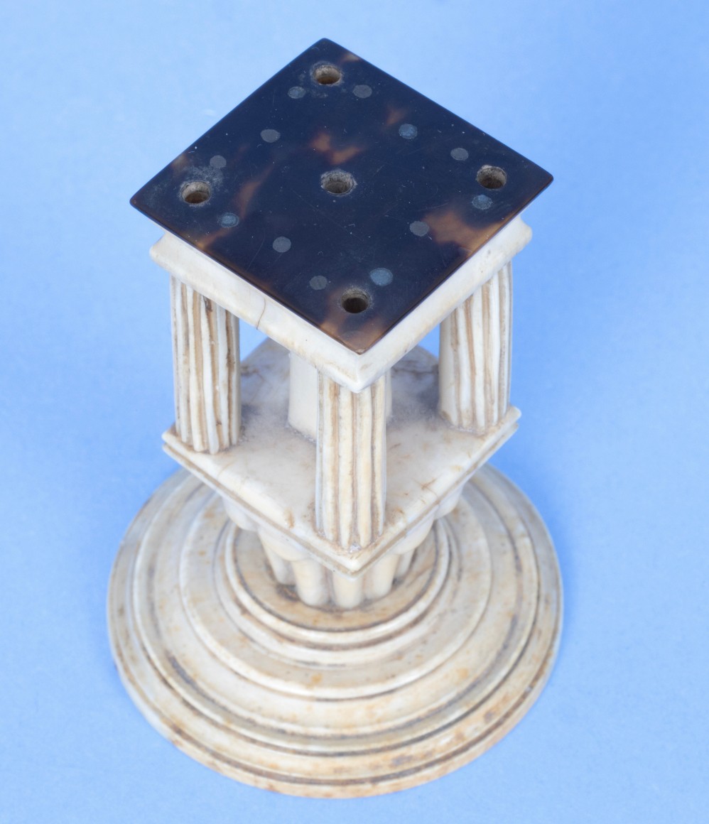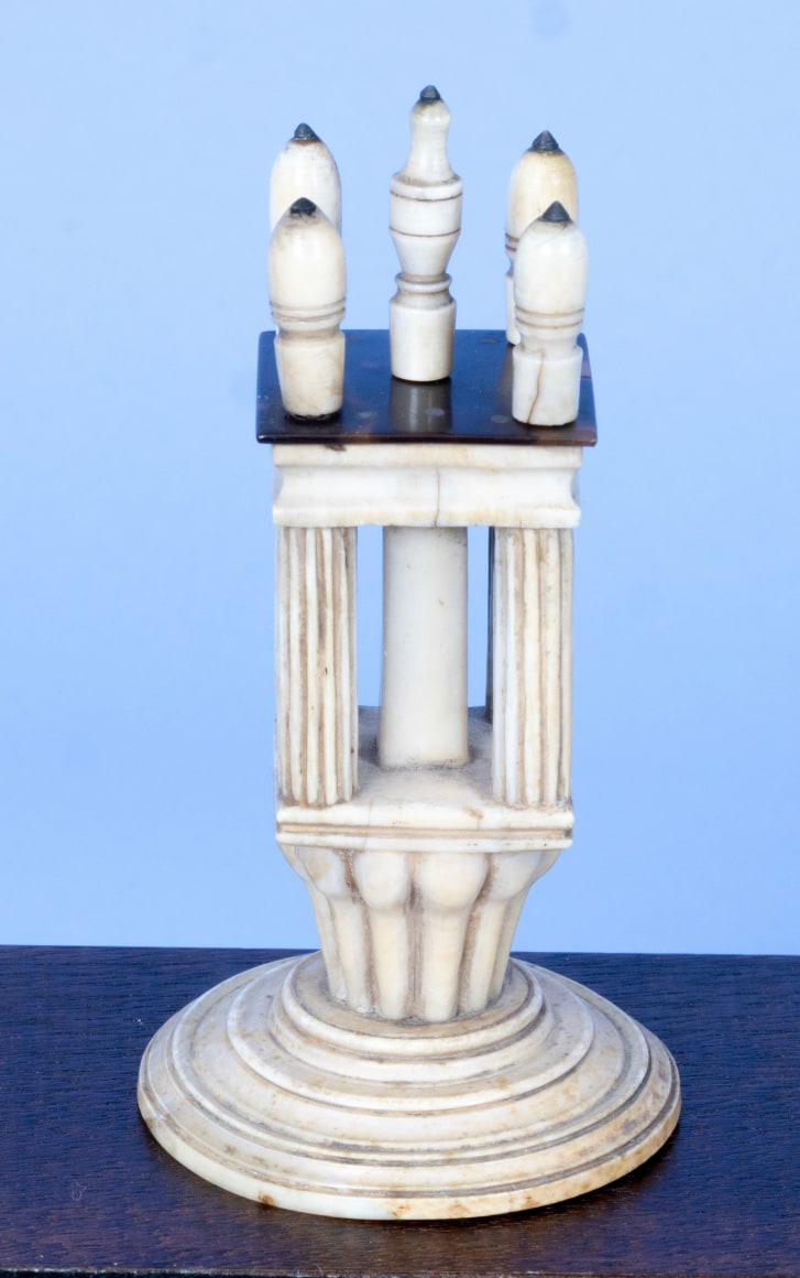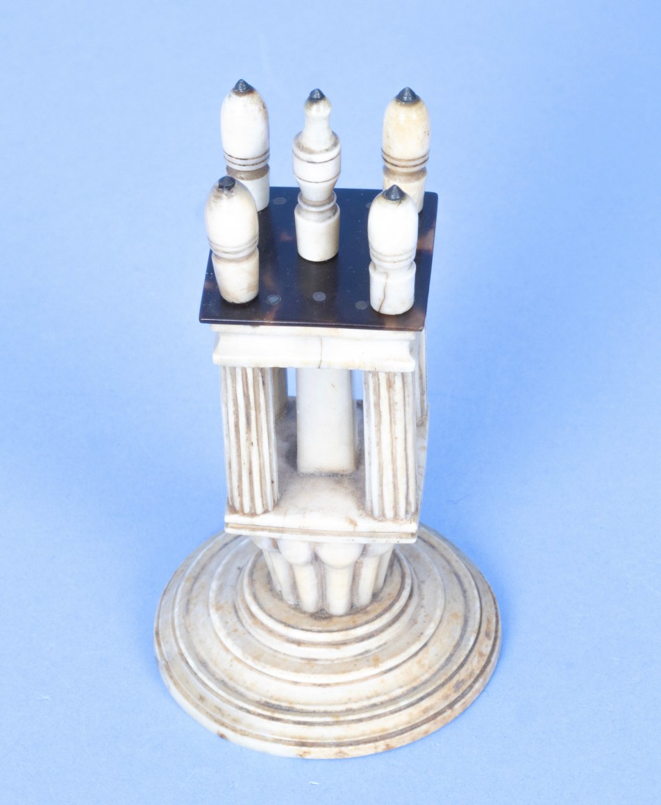 Exceptional and probably unique pick-wick set on an architecturally designed base made from whale ivory, American mid-19th century. The top of the base has a square piece of tortoise shell with 10 inlaid flush mounted decorative pins. At each corner is a hole that lines up with an open caved whale ivory fluted column below which is where 4 of the pick-wicks are stored. At the center of the square is a hole with a square ivory column below and this pick wick has a taller turned handle in the form of an ern. The other 4 pick-wicks have scribe line decoration and at the top look like acorn finials. All 5 pick-wicks are hand turned of whale ivory with small, pointed bead like finials. The top below the tortoise top is a molder section which tops the fluted and square columns above a narrower molded section which is supported by a solid section of curved supports above a sophisticated turned and scribed stepped round base. At the bottom of the base is an original screw which olds the 3-part base together.