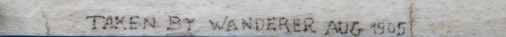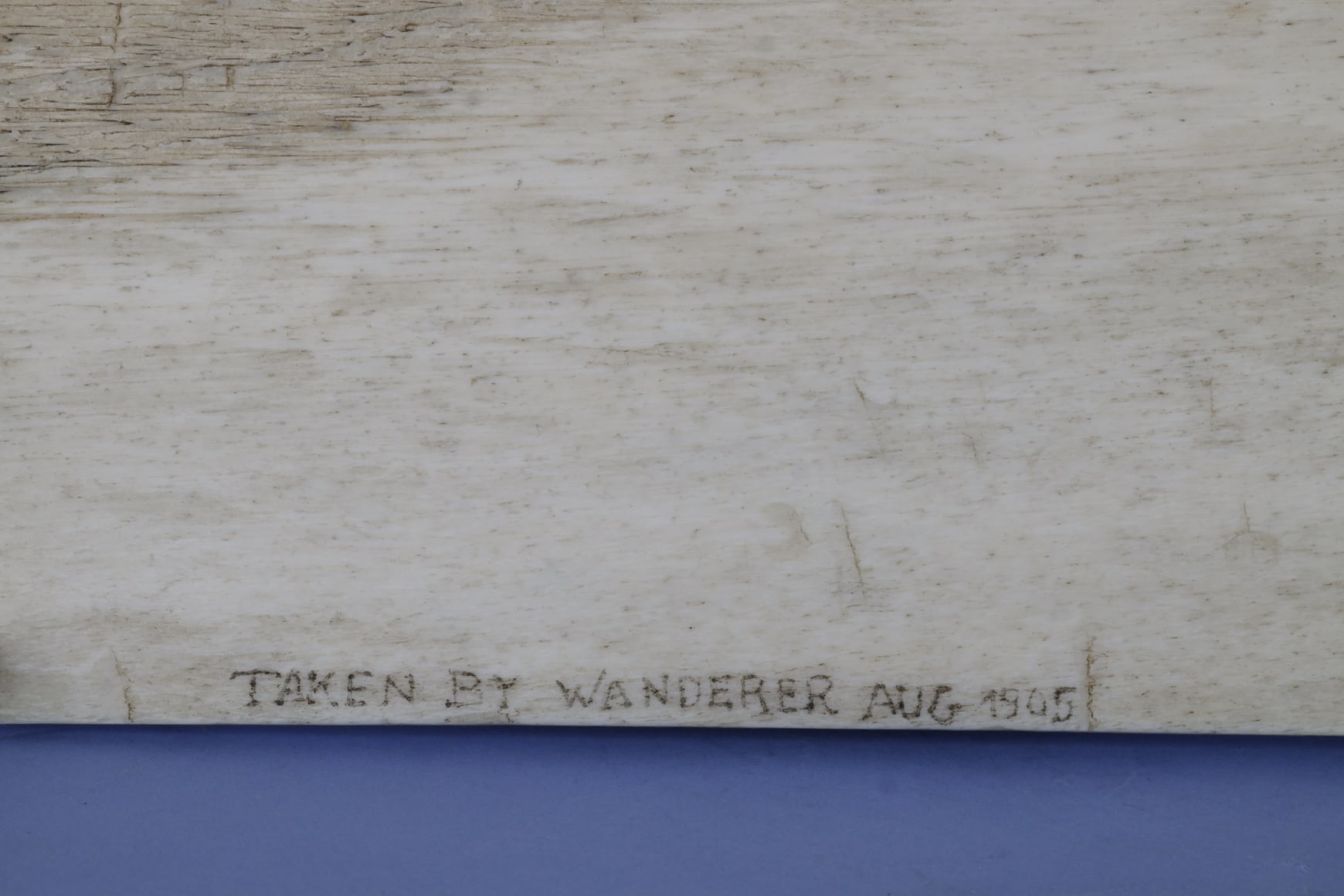 The panbone has an engraved rope work border around the perimeter. at the center of the bottom side the rope border ends with two engraved knots with the title "SHIP - WANDERER" at the center. The work depicts an active whaling scene with a whaleship, five whaleboats, a surfaced sperm whale, a waifed whale, and distant vessels and whales. Signed "WP" several times throughout the composition. Marked on reverse "Taken by Wanderer Aug 1905" indicating that the Panbone used to make the plaque was from a whaling voyage of the Ship Wanderer in 1905. Although it is known that William Perry engraved pan bones they are very rare and this is the only example we have examined. (SC1297)