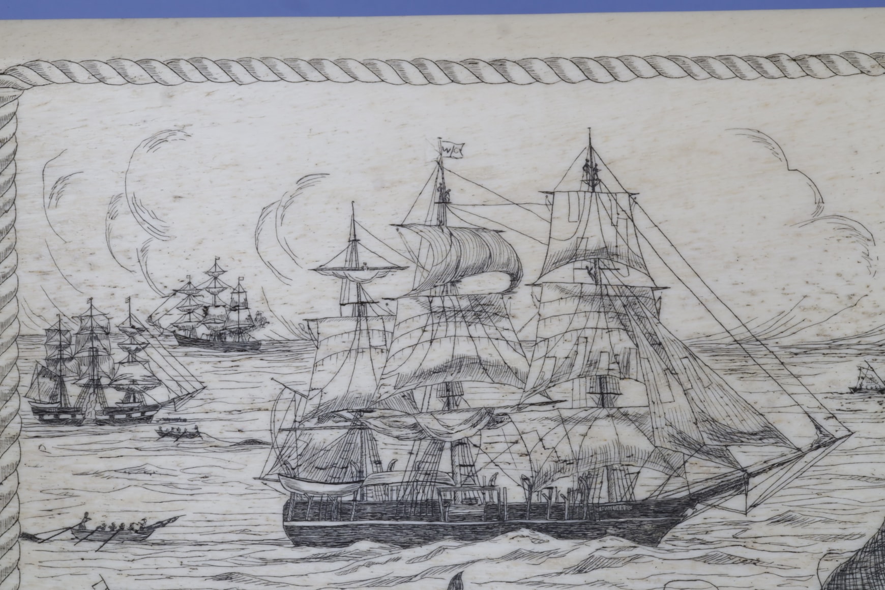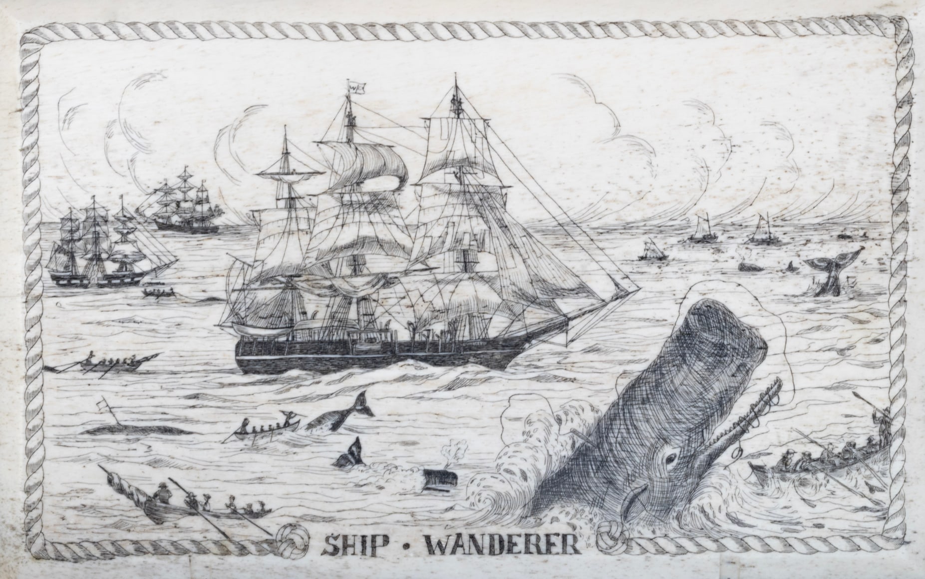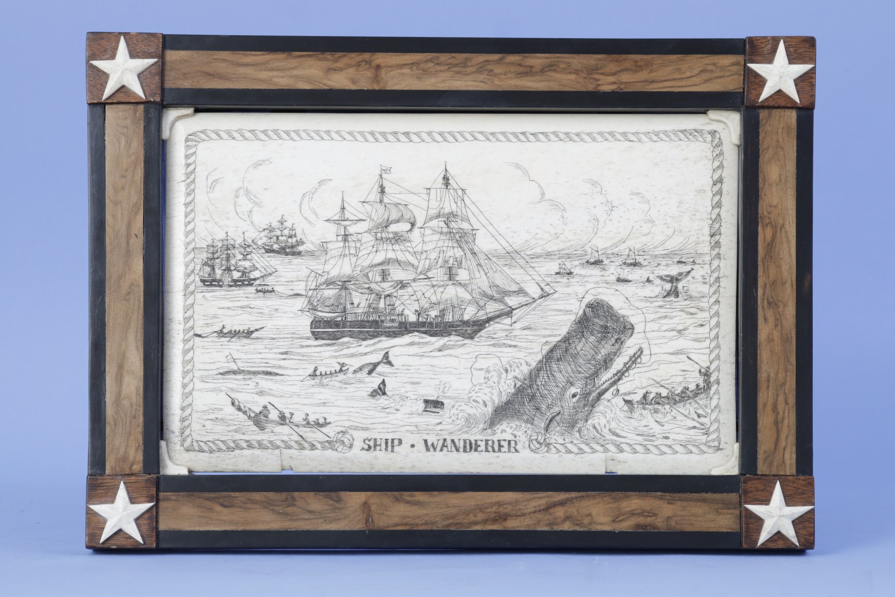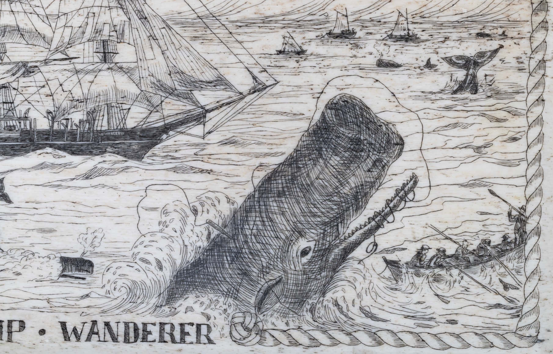 DARTMOUTH, MASS. – Scrimshaw originated as the occupational art of the whalemen. With both time and whale products available on board their ships, the whalers filled the long hours between sightings of whale by crafting and decorating skeletal bone and sperm whale teeth, baleen, and occasional other materials found during the voyages. They made useful objects such as tools and a variety of decorative objects, many of which were intended gifts for loved ones at home.