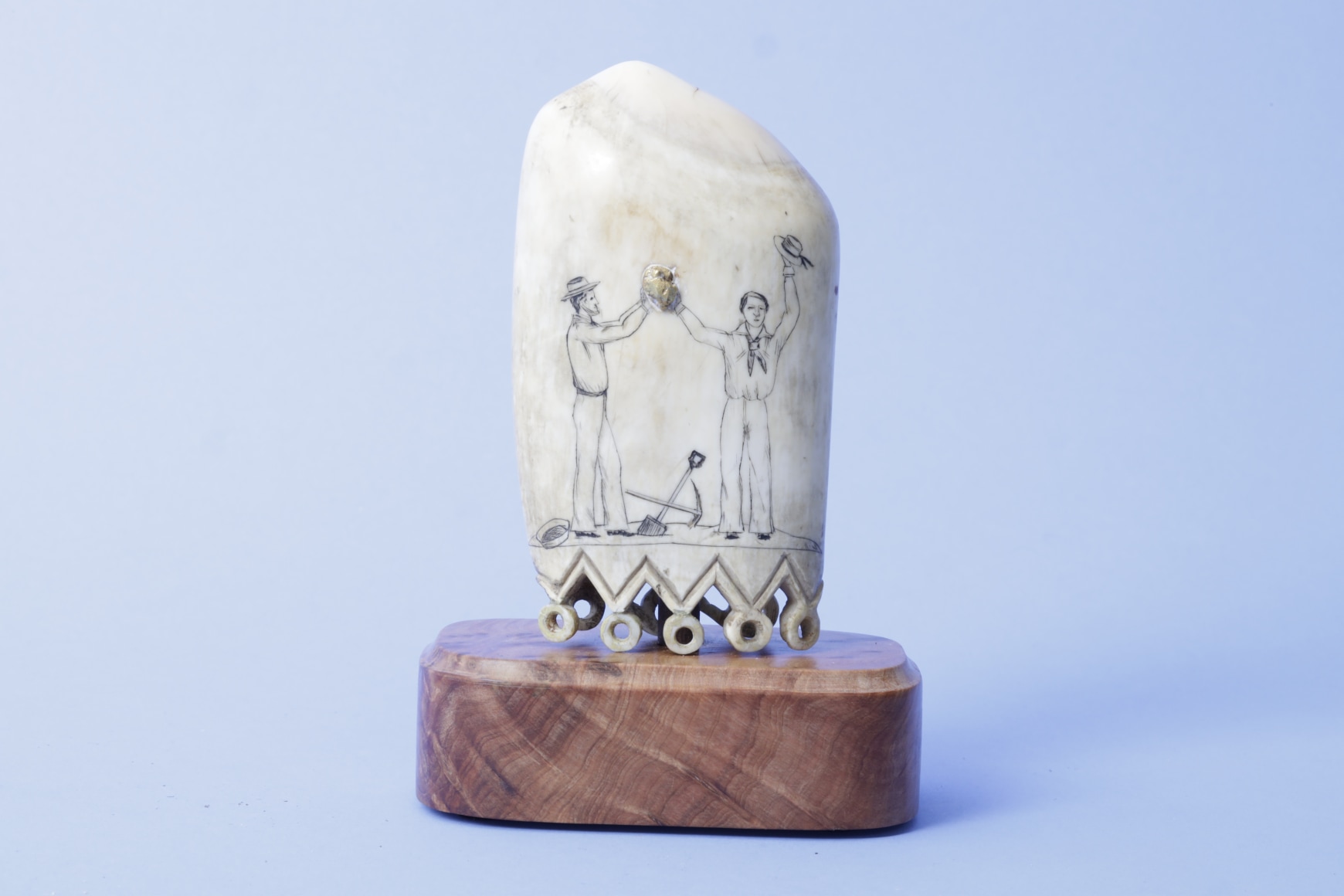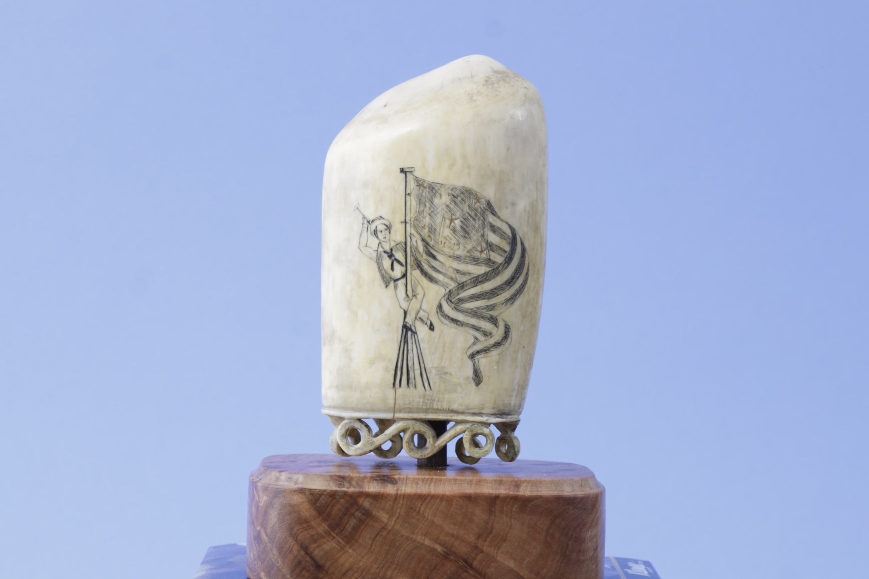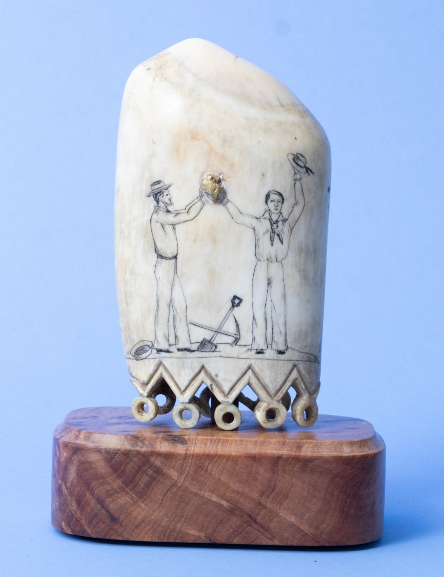Scrimshaw Whales tooth on the obverse depicting two men with their right arms extended upholding together, a genuine inlaid gold nugget. The figure on the left is dressed in miner’s garb wearing a wide brimmed hat. The figure on the right is facing the viewer and is wearing the typical mid-19th century merchant sailor garb with his wide colar pullover shirt and tied scarf holding up his sailor’s hat in the air with his left arm. Below their feet is an engraved line. Above the line on the left is an engraving of a miner's pan and placed into the ground is a crossed will defined shovel and miner’s pick. The reverse has a fine engraving of a sailor wearing a "short jacket" with his legs rapped around the top of a flagpole or ship’s mast. His right arm is raised holding a miner’s hammer and he is nailing a very large wavy American flag to a ship's top mast. The border of the tooth at the front has a saw tooth carving with 5 points with carved circles connected to the points. On the reverse border arw 3 pierced carved circles with looped conection simulating waves. (SC1270)