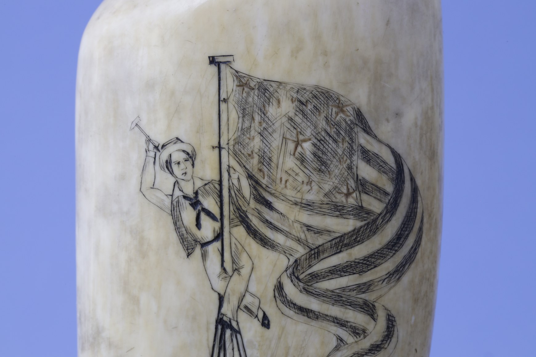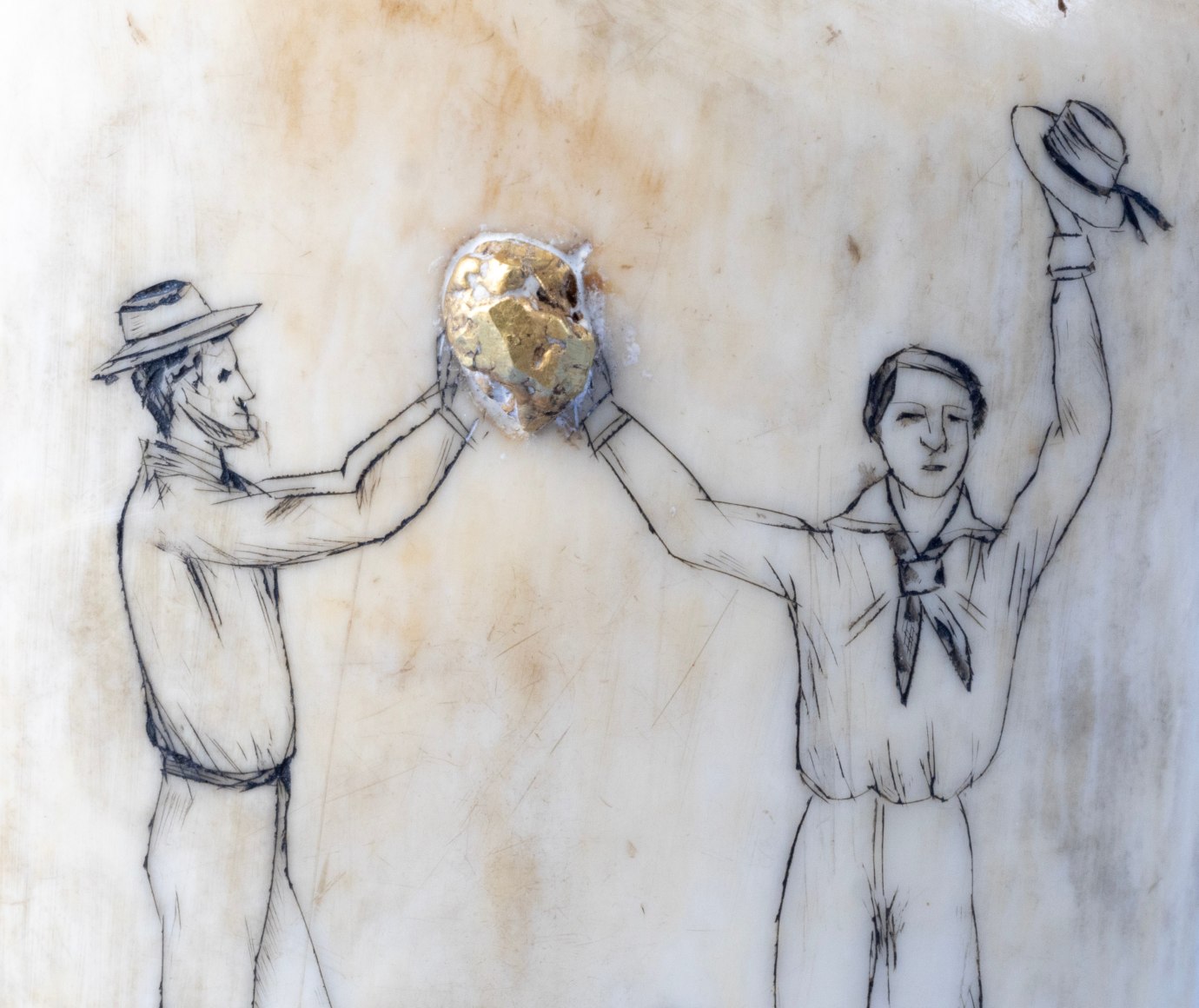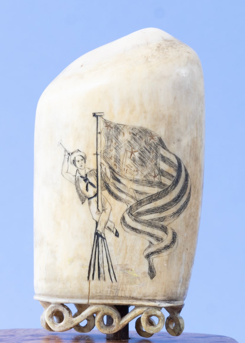 Scrimshaw Whales tooth on the obverse depicting two men with their right arms extended upholding together, a genuine inlaid gold nugget. The figure on the left is dressed in miner’s garb wearing a wide brimmed hat. The figure on the right is facing the viewer and is wearing the typical mid-19th century merchant sailor garb with his wide colar pullover shirt and tied scarf holding up his sailor’s hat in the air with his left arm. Below their feet is an engraved line. Above the line on the left is an engraving of a miner's pan and placed into the ground is a crossed will defined shovel and miner’s pick. The reverse has a fine engraving of a sailor wearing a "short jacket" with his legs rapped around the top of a flagpole or ship’s mast. His right arm is raised holding a miner’s hammer and he is nailing a very large wavy American flag to a ship's top mast. The border of the tooth at the front has a saw tooth carving with 5 points with carved circles connected to the points. On the reverse border arw 3 pierced carved circles with looped conection simulating waves. (SC1270)
