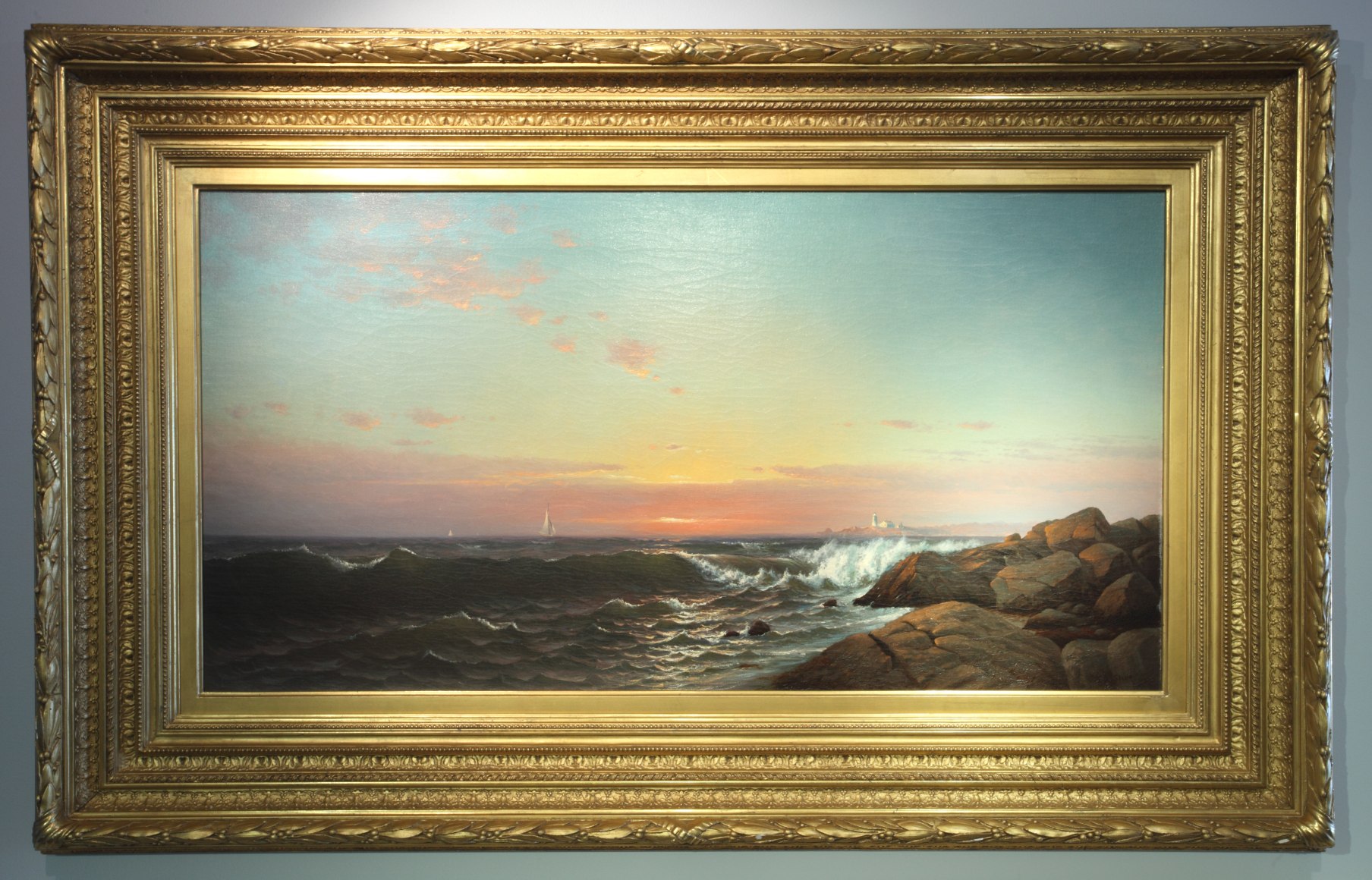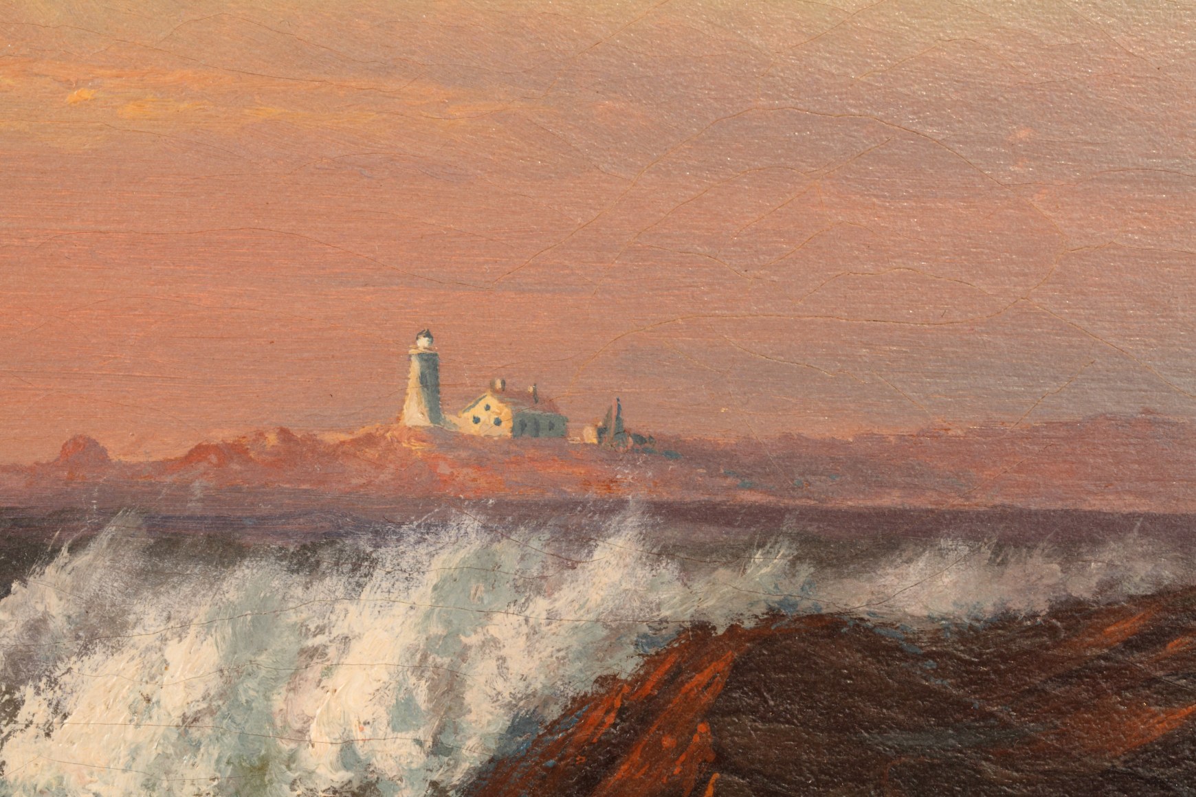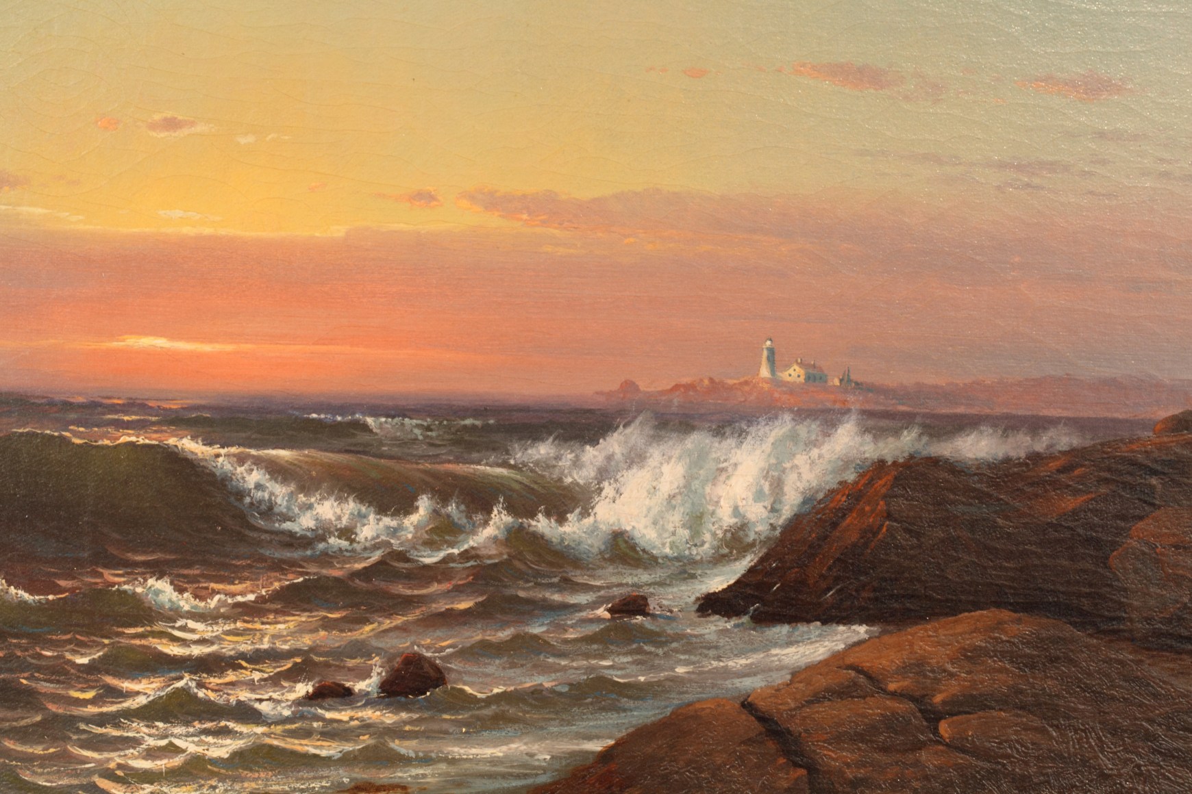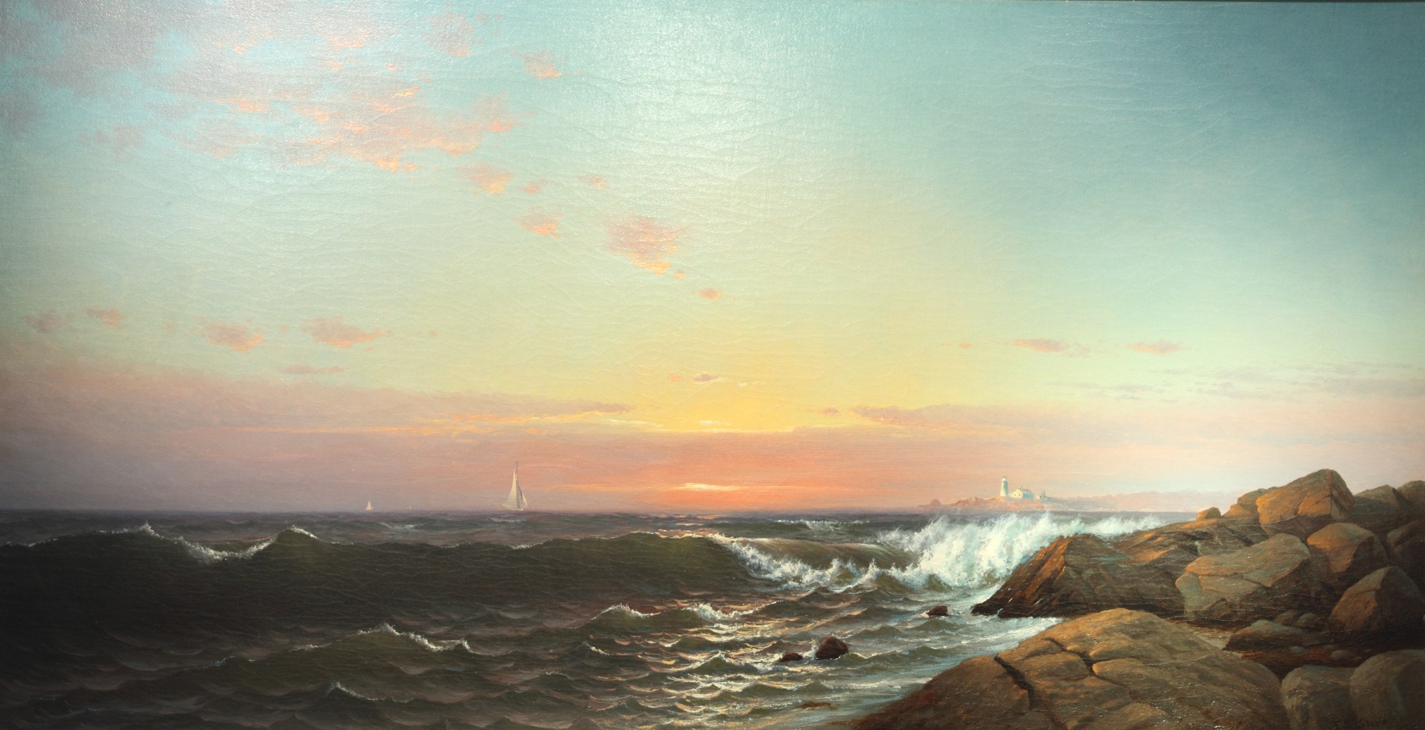 Oil on canvas, titled 'Sunrise With Rocky Shore', signed and dated lower right 'F. A. Silva 1875.' This painting is an outstanding example of Silva's luminous work. The right hand side of the picture has large rocks in the foreground. The rocks have a subtle glow resulting from the light of the setting sun. In the distance, one see a lighthouse and keeper's house and other structure. The sky has magnificent color and light treatment. The water is executed with great skill. In the foreground, there is a large wave which is breaking on the right hand side and cresting as it goes to the left. There are two small sailboats in the distance which add human interest as well as surfaces to reflect color. (PA-214)