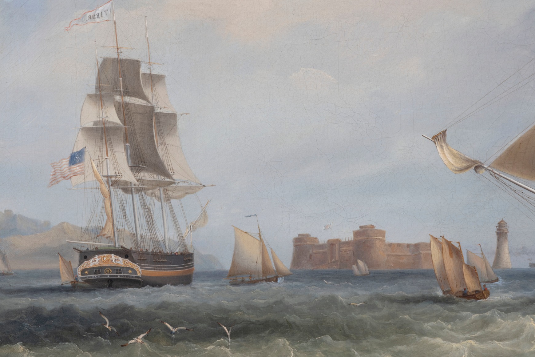 distance to the left. To the left is a stern 45-degree view of the of the “Tiber“flying a banner with her name from the top mast and an American flag off the gaff. The stern board is very detailed. Showing the vessel in two views is a common element in Walters and son’s paintings. The water is beautifully high-lighted around the bow and light stretching as it narrows to the left border. There is a group of sea gulls flying around in the left corner and a few small gaff rigged vessels in front of the fort. The sky is bright blue with puffy white clouds with some gray shading.