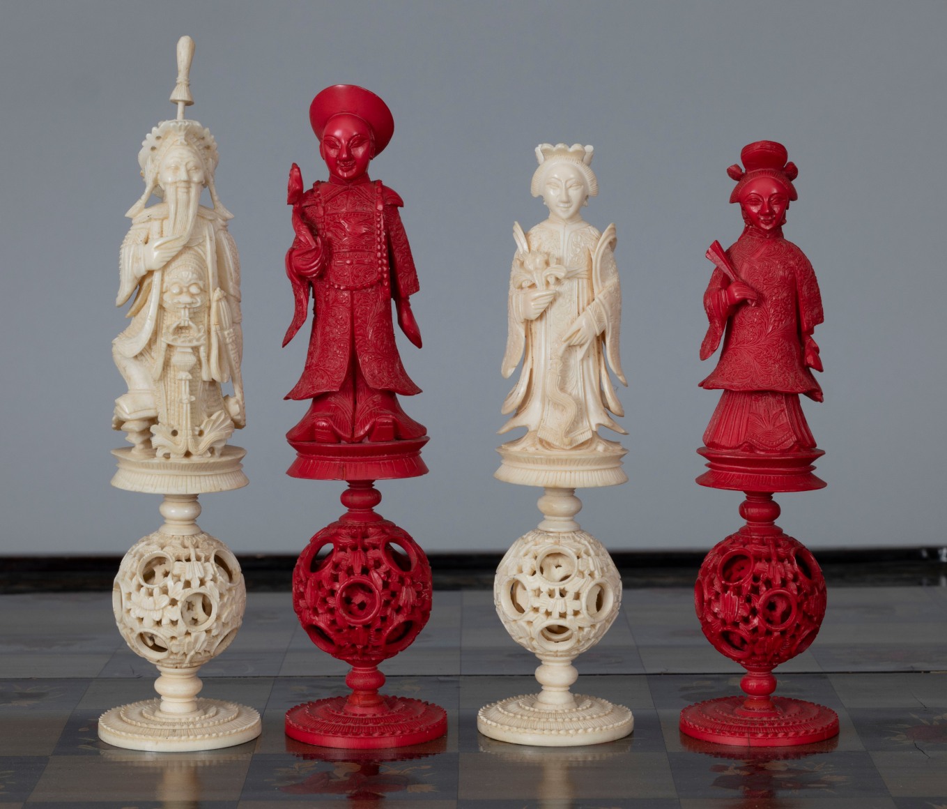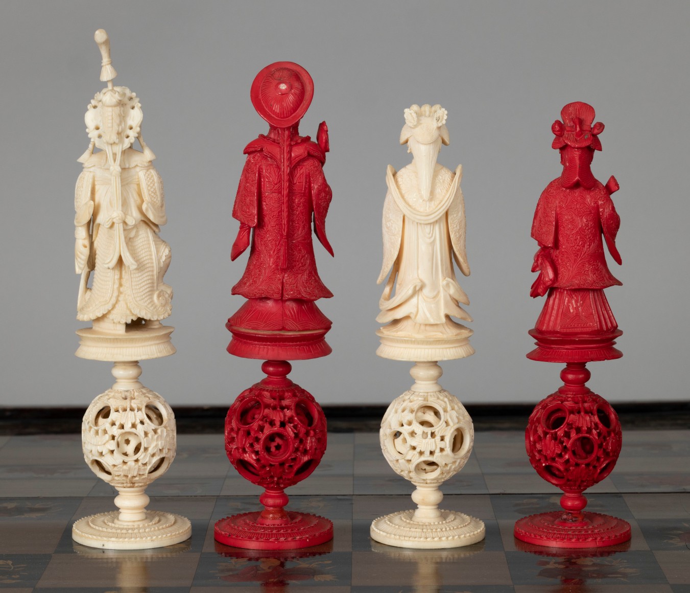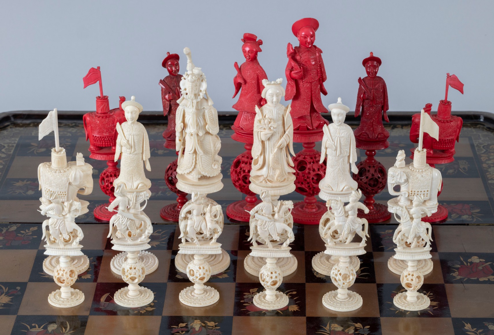 Prisoner-of-war carved bone chess set, French/English, circa 1810. This is a complete set of 32 chessmen, 16 stained red and 16 stained green. Each piece, save the knights and rooks, have figural heads or busts atop footed bases carved with crosshatch and circle designs. The detail of the heads and faces of each piece is excellent. All of the pieces sit on turned bone bases and have carved and pierced fine details. Knights and rooks have matched footed bases and the appropriate stylized horse head and castle turret. (SC 1320) Condition: The set is generally in good condition especially for something older than 200 years. Except for the knights all the pieces have small ball finals above the head and several are lacking. There are scattered losses to some of the edges of the various pieces.