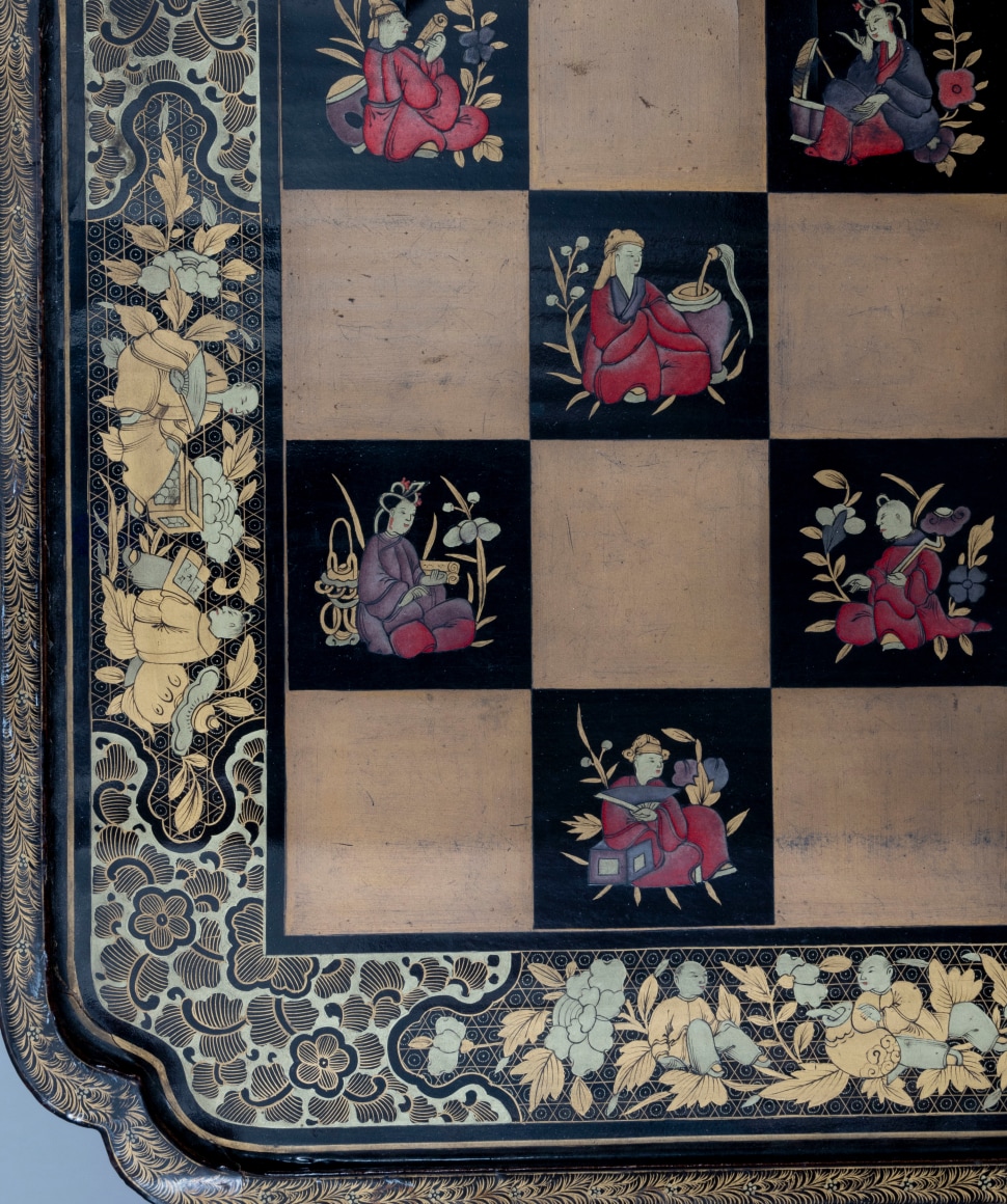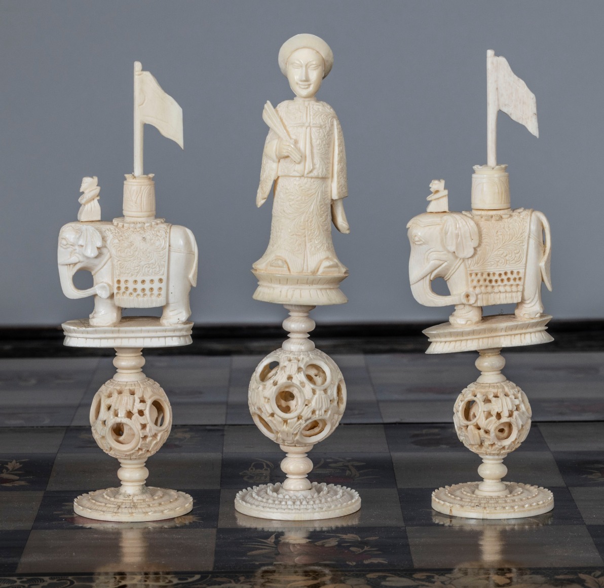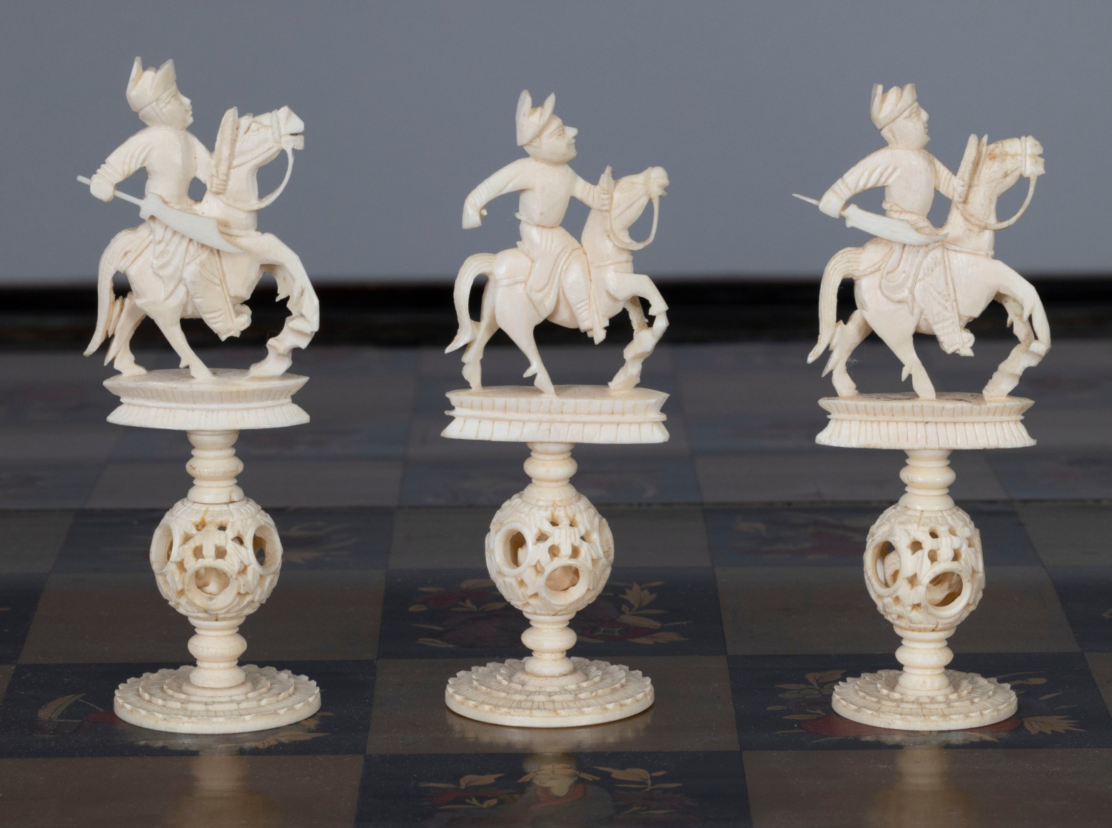 Prisoner-of-war carved bone chess set, French/English, circa 1810. This is a complete set of 32 chessmen, 16 stained red and 16 stained green. Each piece, save the knights and rooks, have figural heads or busts atop footed bases carved with crosshatch and circle designs. The detail of the heads and faces of each piece is excellent. All of the pieces sit on turned bone bases and have carved and pierced fine details. Knights and rooks have matched footed bases and the appropriate stylized horse head and castle turret. (SC 1320) Condition: The set is generally in good condition especially for something older than 200 years. Except for the knights all the pieces have small ball finals above the head and several are lacking. There are scattered losses to some of the edges of the various pieces.