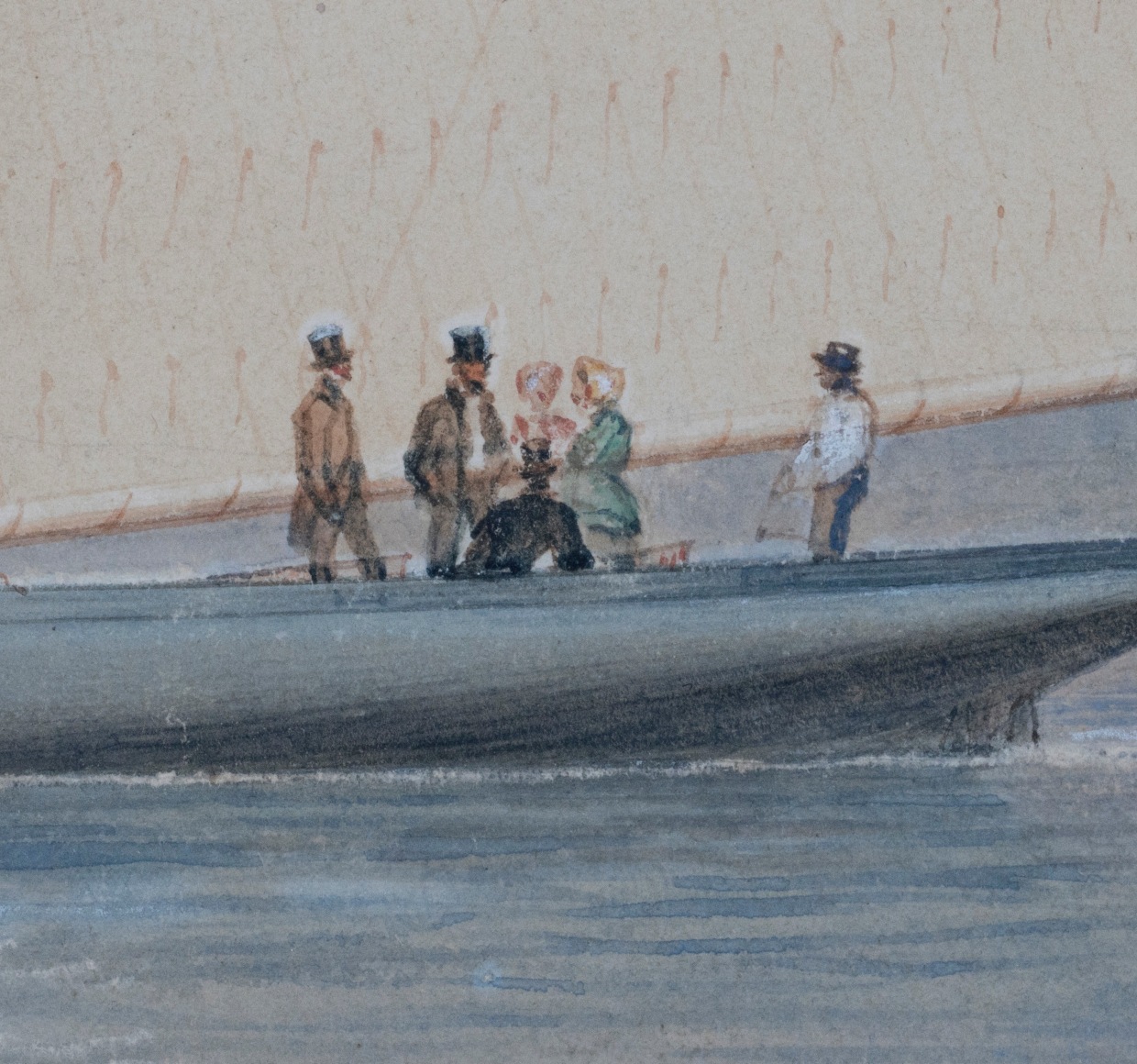 It has been suggested that the well-dressed figures huddled around stern represent Queen Victoria and Prince Albert meeting with John Cox Stevens. owner of Yacht "America".