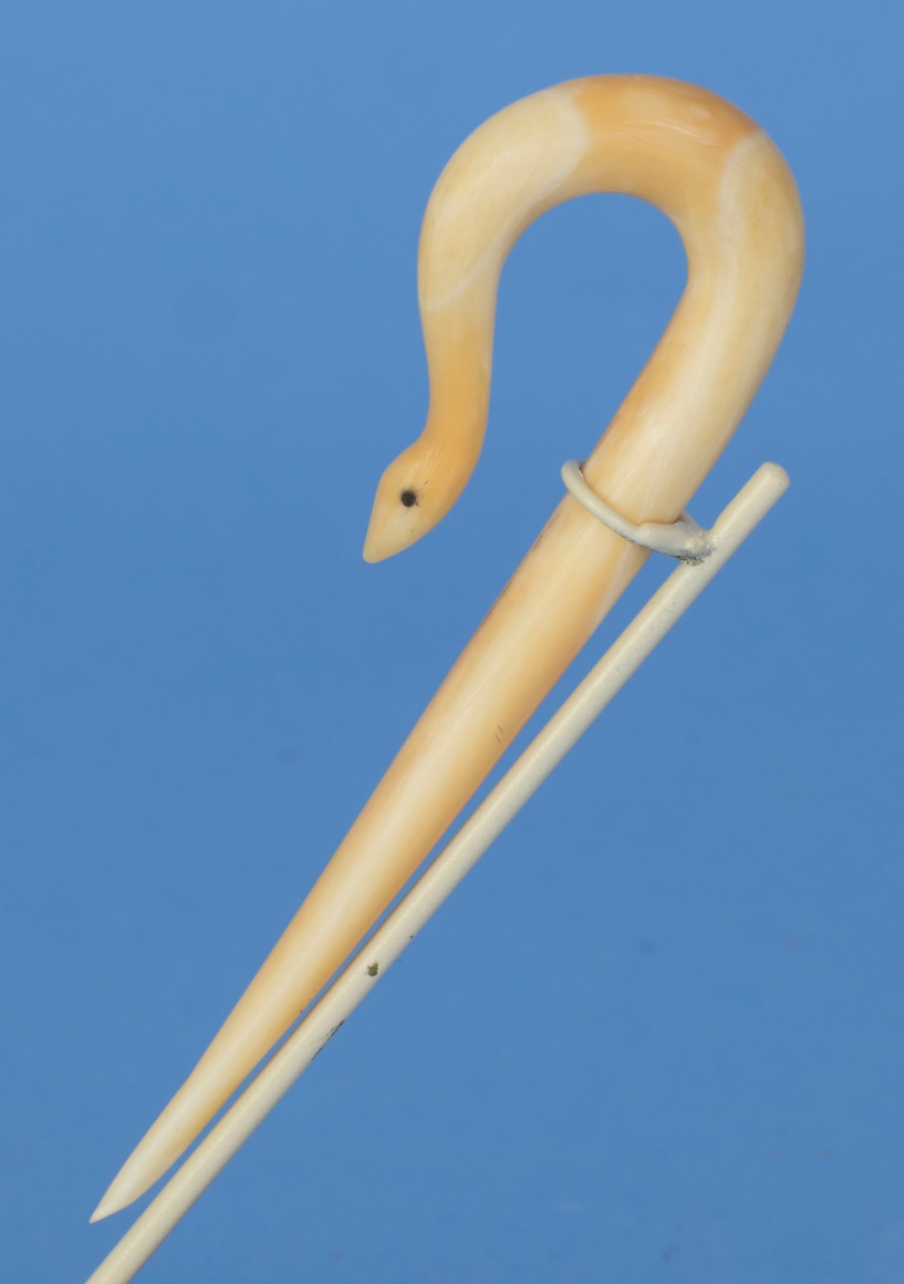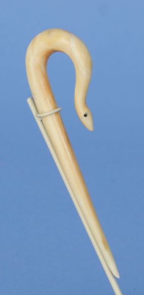 Carved whale ivory graceful and elegant bodkin in the form of a looped serpent, American mid 19th century. At the top of the curve the serpent body loops around and tapers in width. At the end of the loop the serpent’s neck is thin and then the head broadens a bit with inlaid tiny eyes and then tapers to a point. (SC1248)