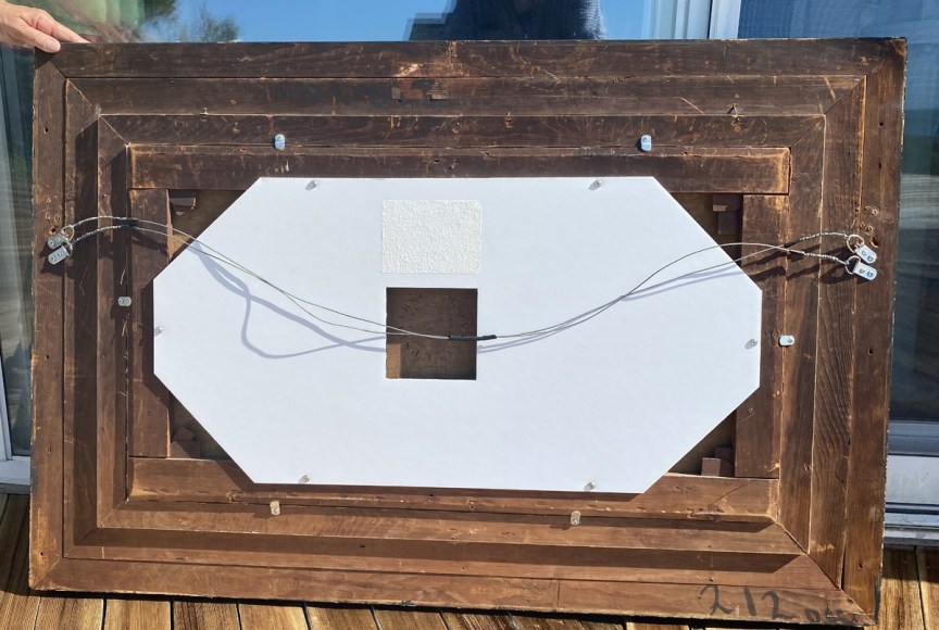 Condition of Painting: The painting is in outstanding condition. It is not lined and only very minor scattered in-paint in the sky. The painting is amazingly vivid and retains all of the original glazes. On the reverse of the canvas is the original canvas maker stencil which is clearly visible on the back since the painting is not lined.