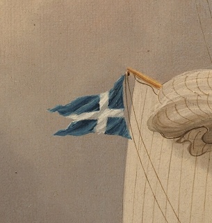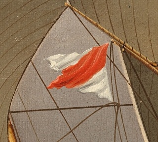 Note 2: The White private signal with the red diagonal stripe flying from the schooner "Magic" at the center is the private signal of John S. Beecher who was elected to the membership of the NYYC in May 1870, and dropped out of the Club in December of 1879. It was customary at that time, as it is today, for a club member to charter a special boat for a major club race rather than race his own slop the "Petrel". The Blue Private signal with the white cross belonged to Frank W. Hurst who is mentioned above as being the owner of the sloop Active which is the winning boat appearing on the far right of the painting. The photos of the private signals were copied from the 1875 NYYC yearbook because the 1877 yearbook, for some reason, did not print the members' flags that year. The white flag flying on the sloop to the far left is unidentified.